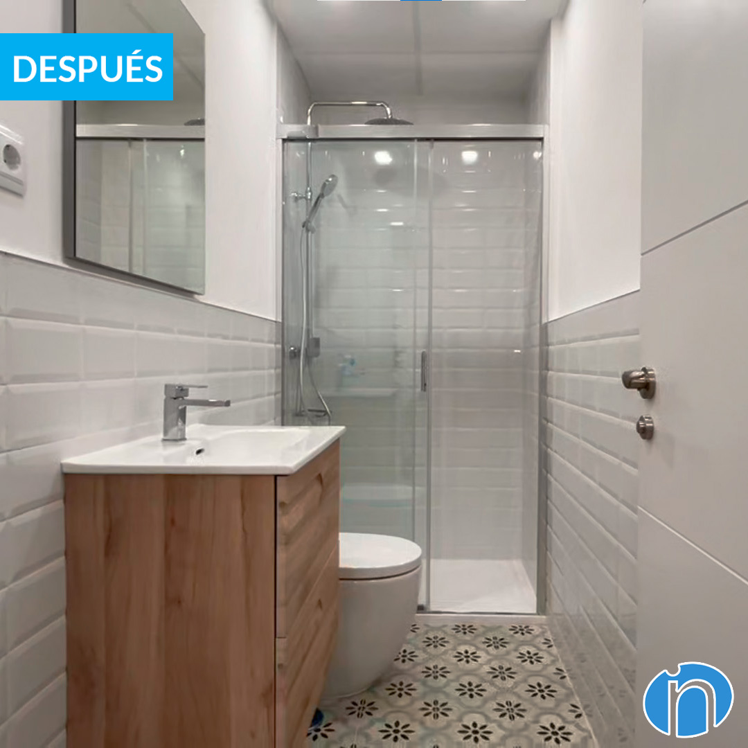 All in a new contemporary interior image. We have taken care to enhance the luminosity to achieve a fresh and pleasant atmosphere. For this reason we have tiled the walls with white beveled tiles. In addition to a hydraulic-style floor that gives a lot of personality.
