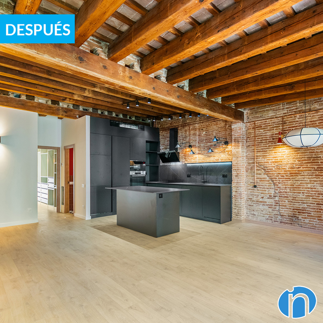 Before the renovation, the apartment’s layout was very compartmentalized. The day area occupied a space that didn’t take advantage of natural light. The night area was in the brightest part. Now, after the reforma en Barcelona, the layout has been completely rotated. The space where the bedrooms used to be now hosts an open area. Here we find the living room, the dining room, and a large open kitchen. The exposed brick walls and original wooden beams have been carefully restored, bringing character and personality to the space.