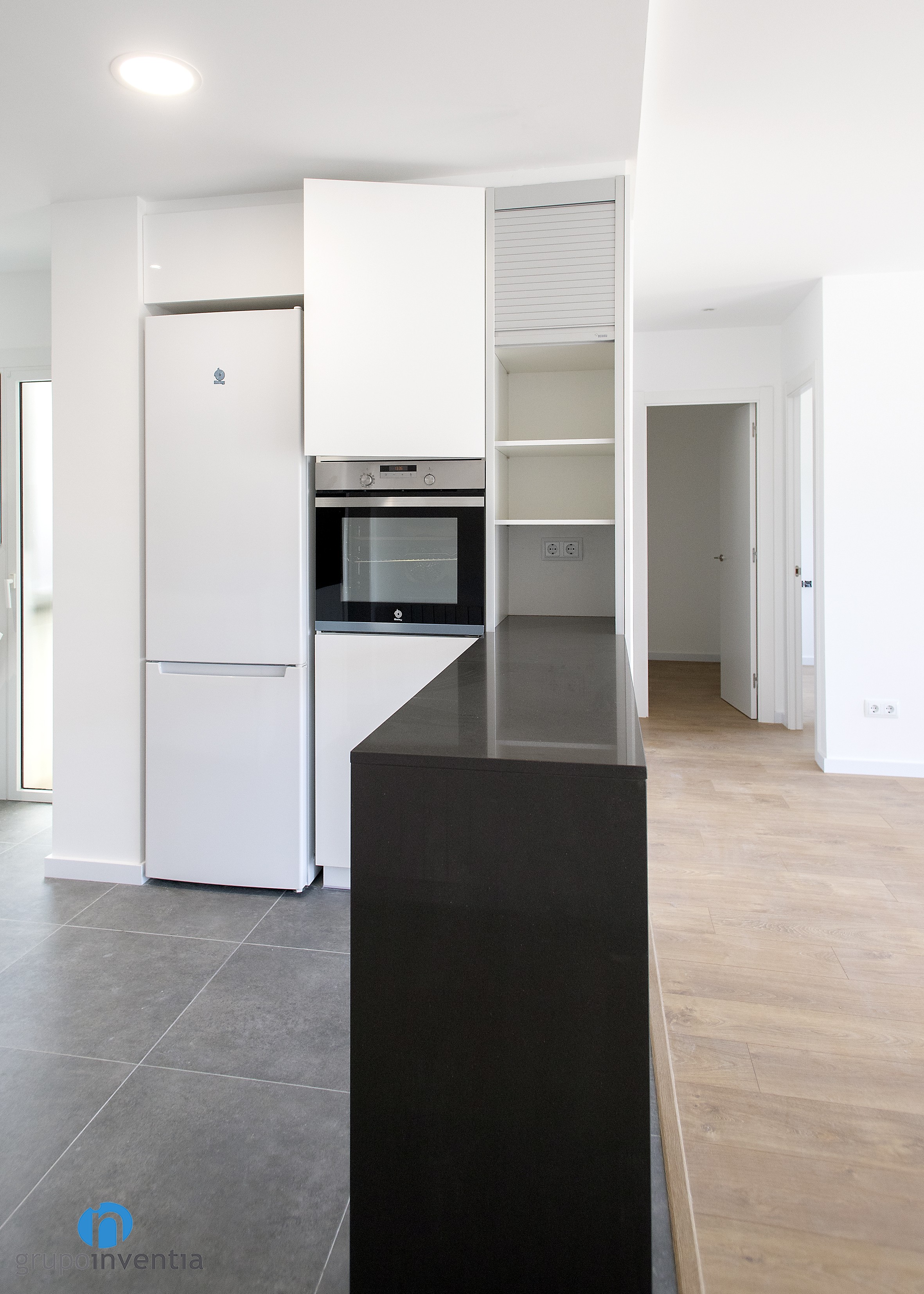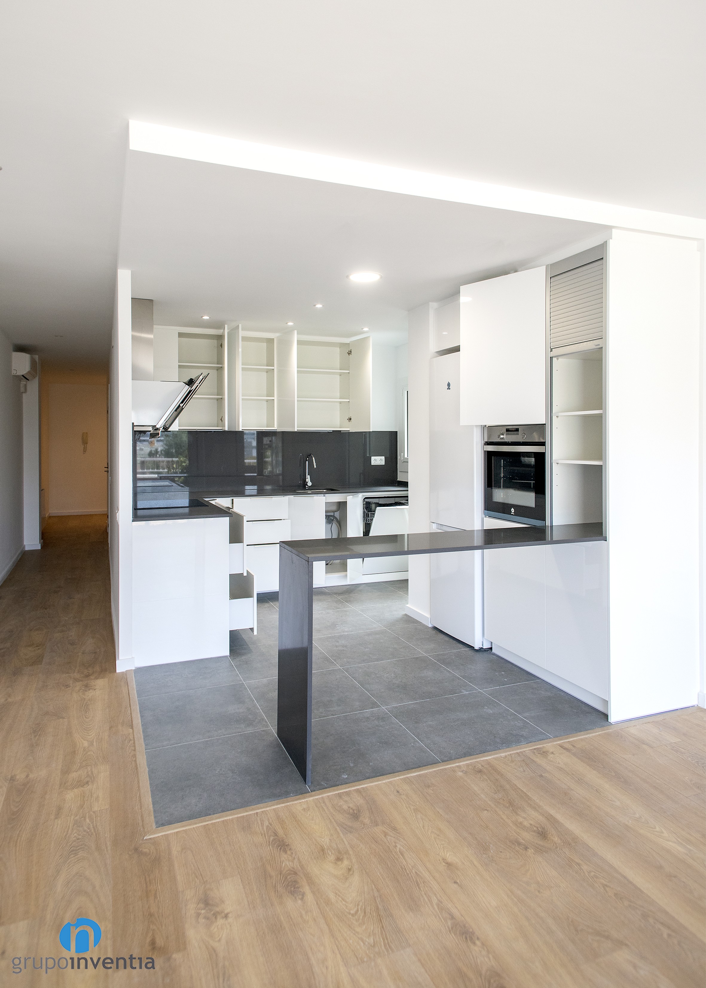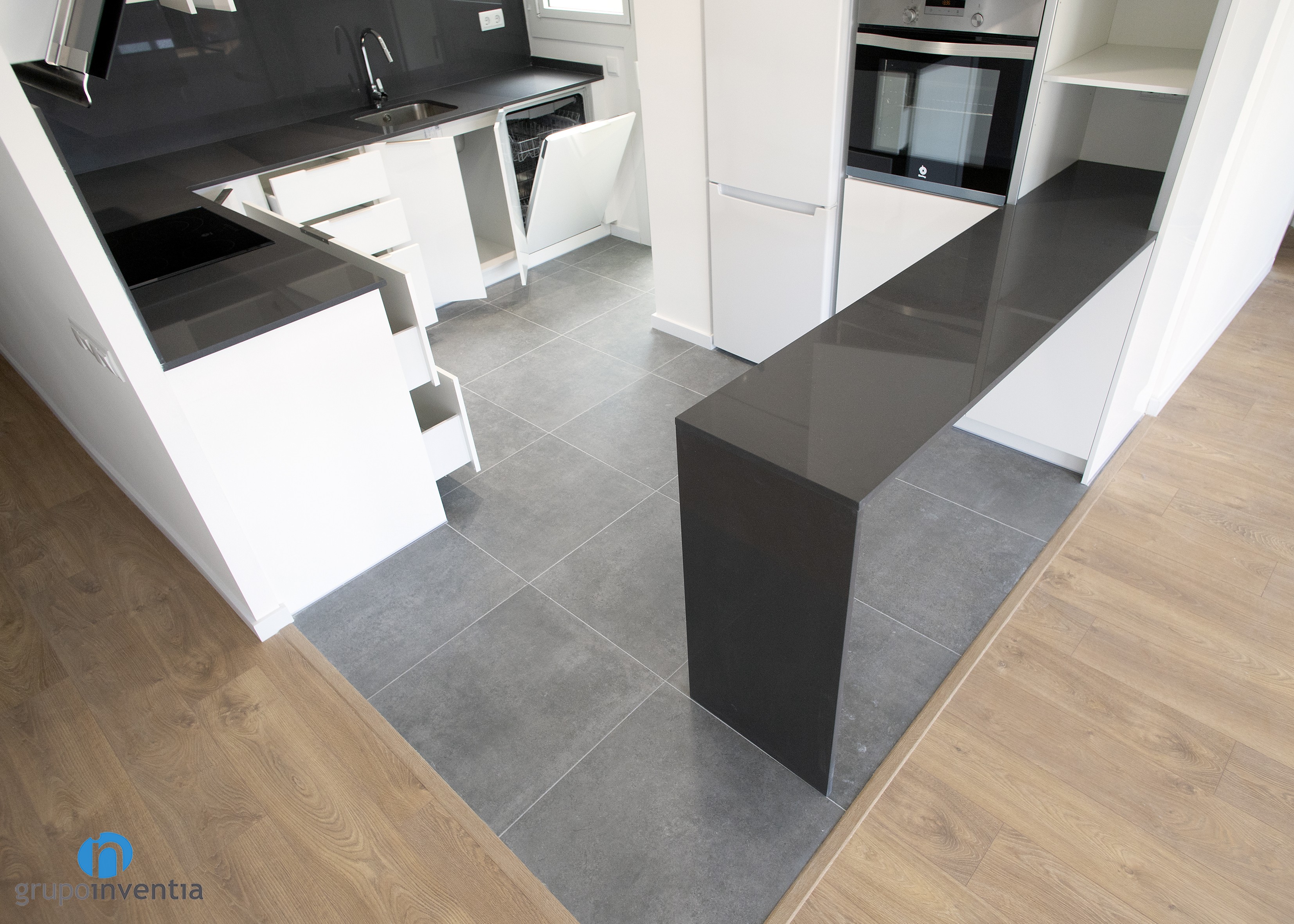 This is a kitchen renovation open to the livingroom, but arranged in a well-defined area. For the location of the new elements a L-shaped countertop was chosen, although household appliances such as the fridge, oven and microwave were fitted in an attached kitchen cabinet. In the same way, a practical breakfast bar was placed in the open area.