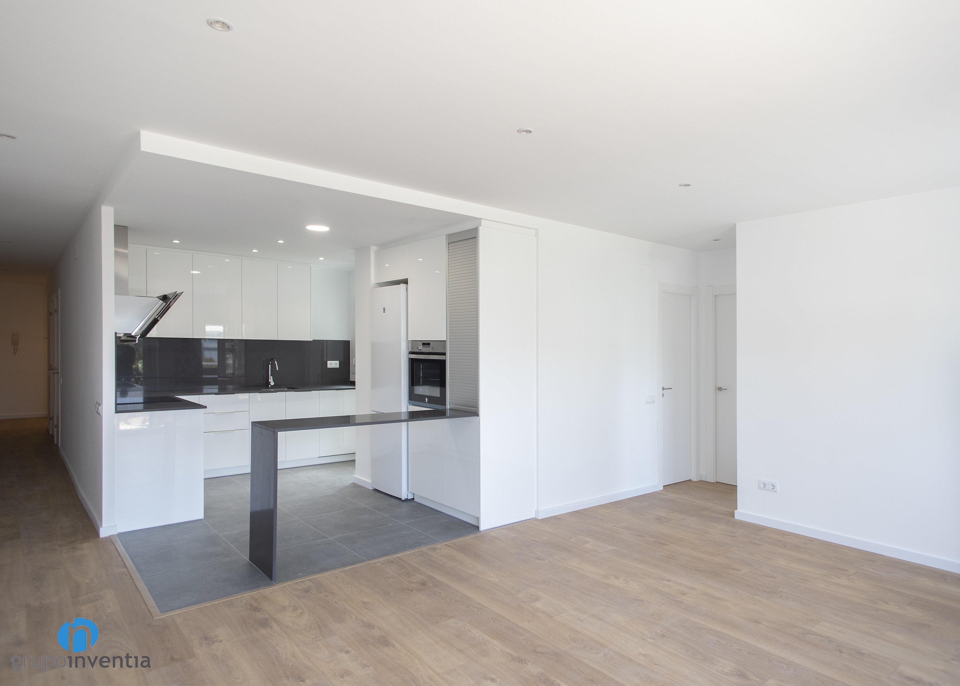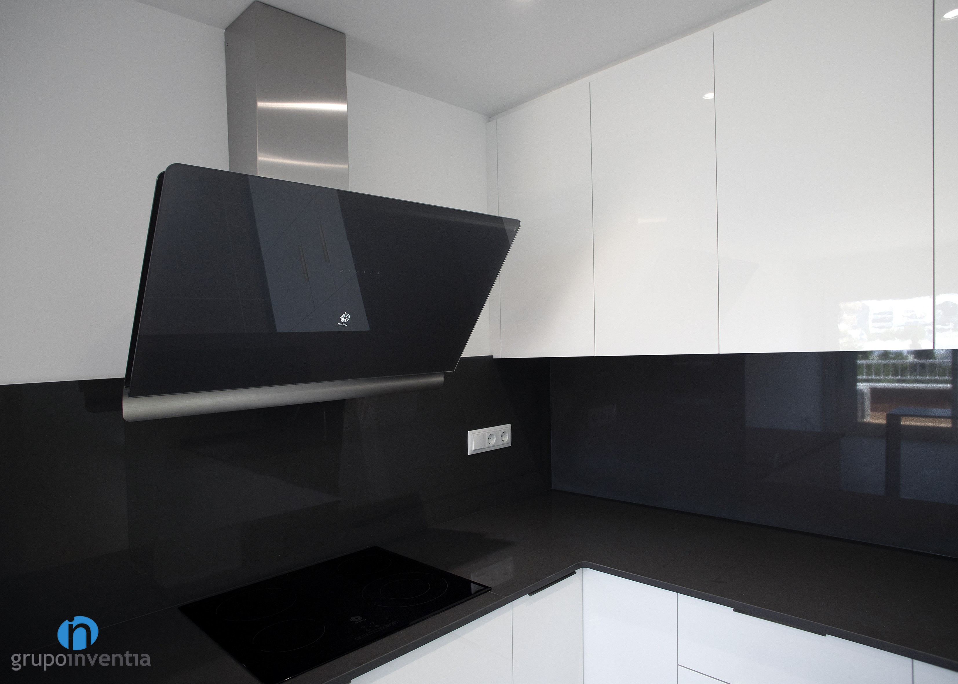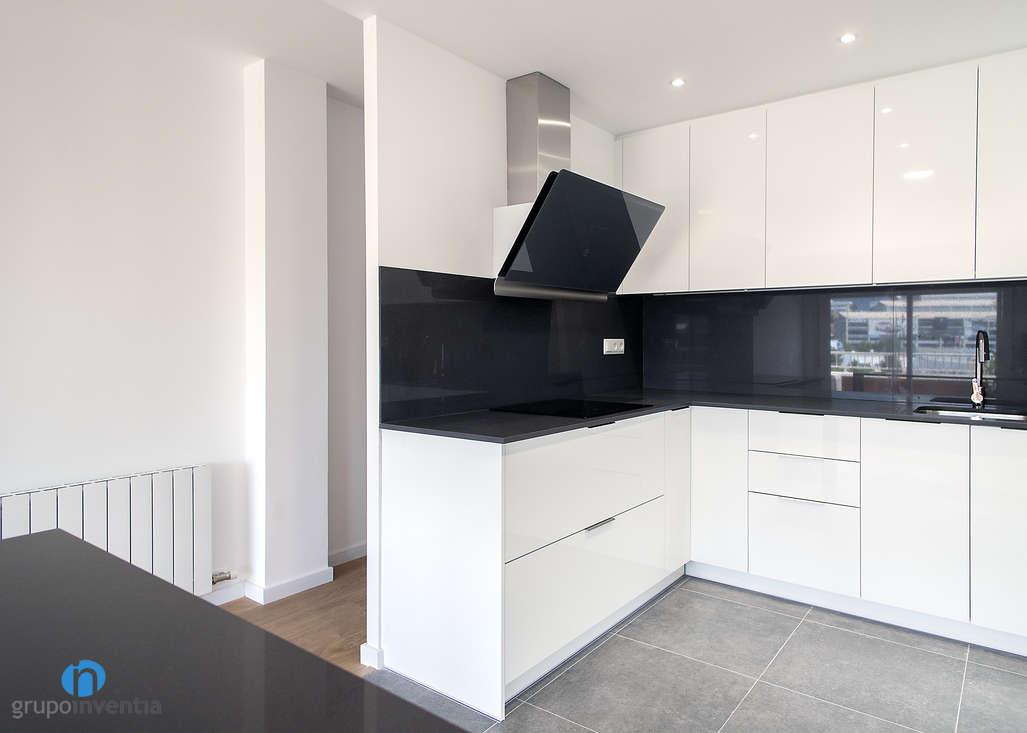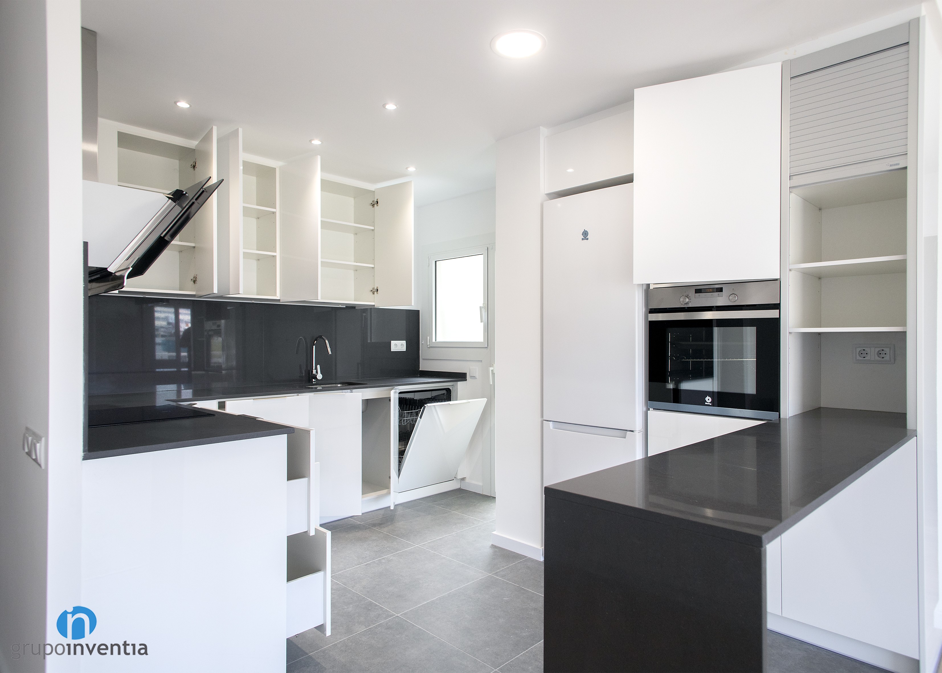 This is a kitchen renovation open to the livingroom, but arranged in a well-defined area. For the location of the new elements a L-shaped countertop was chosen, although household appliances such as the fridge, oven and microwave were fitted in an attached kitchen cabinet. In the same way, a practical breakfast bar was placed in the open area.
