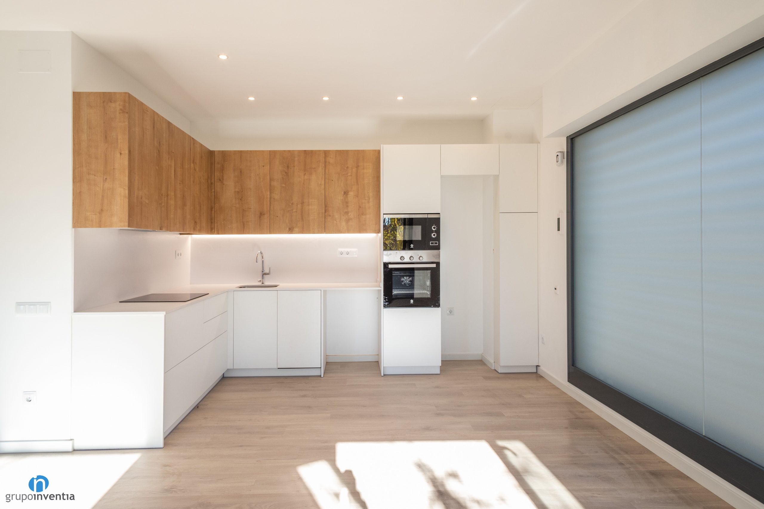 The image chosen for this kitchen renovation in Sant Cugat fits perfectly with the overall design of the house. The lower kitchen furniture and countertops are white, while the upper cabinets are presented in an elegant wood finish. In this way it combines very well with the parquet flooring that is also present in the kitchen area.