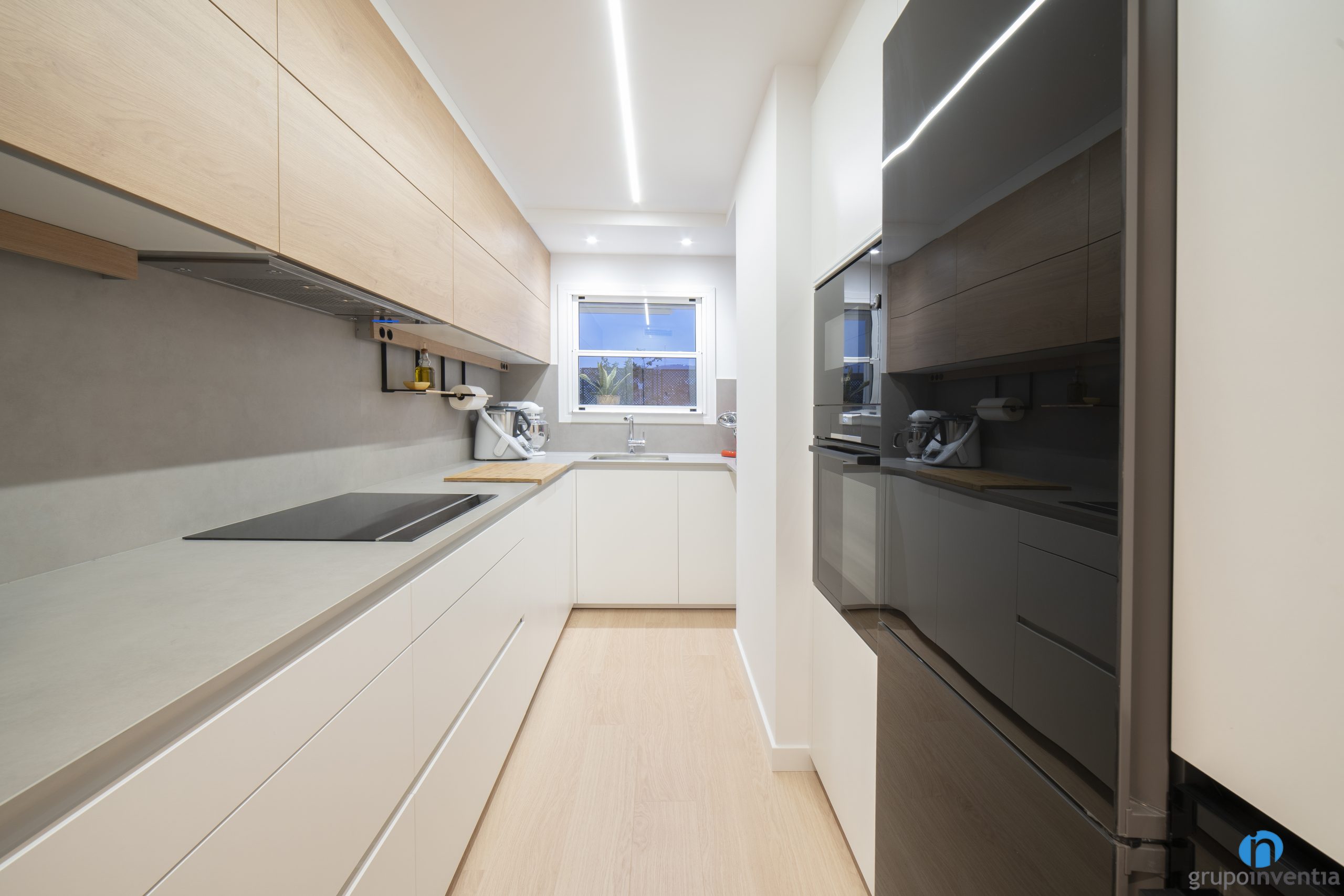 It is equipped with a glass-ceramic plate and has storage capacity at the bottom and top. To design this kitchen renovation we used the same as in other spaces. The kitchen cabinet combines white color and wood finishes with a stone gray countertop.