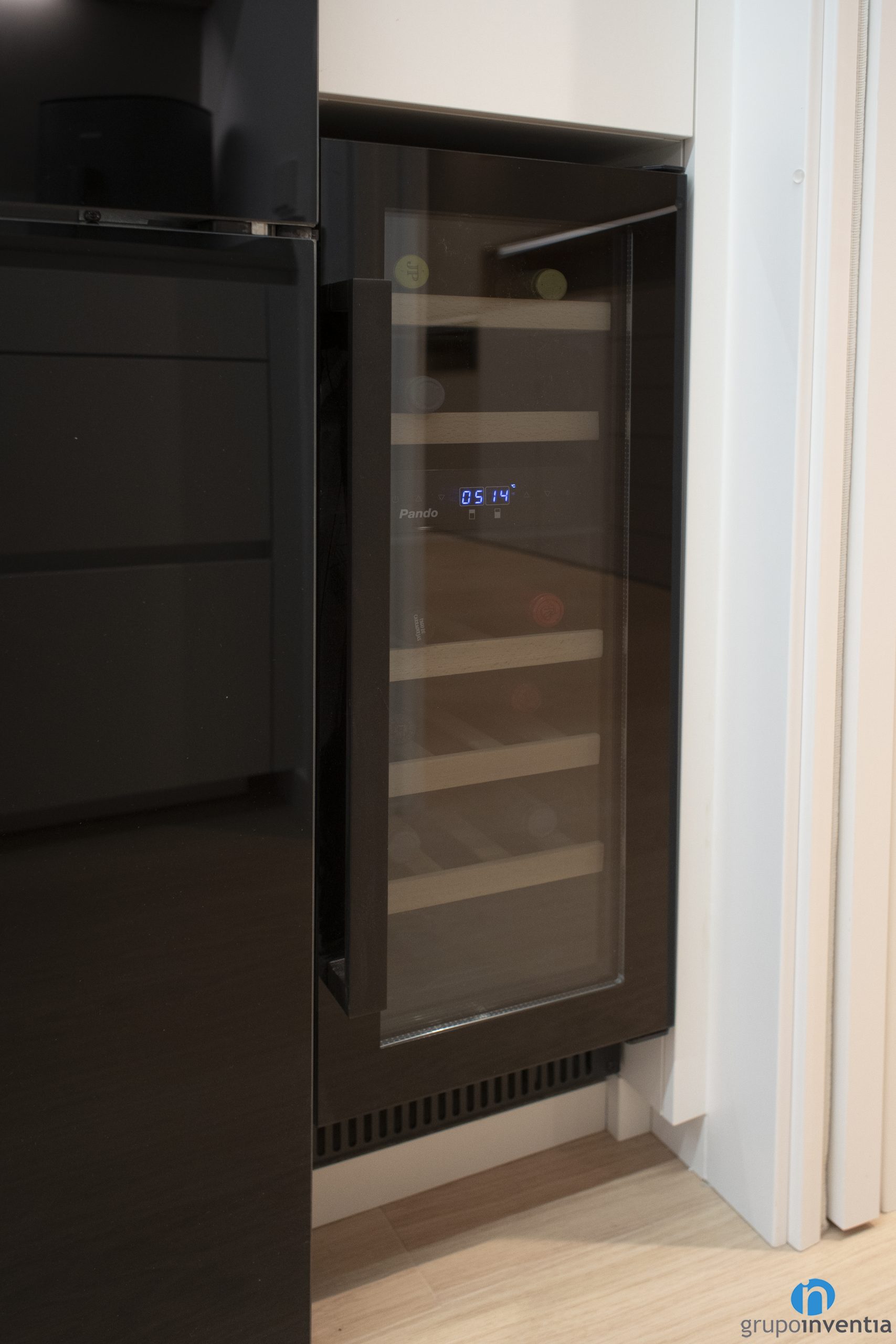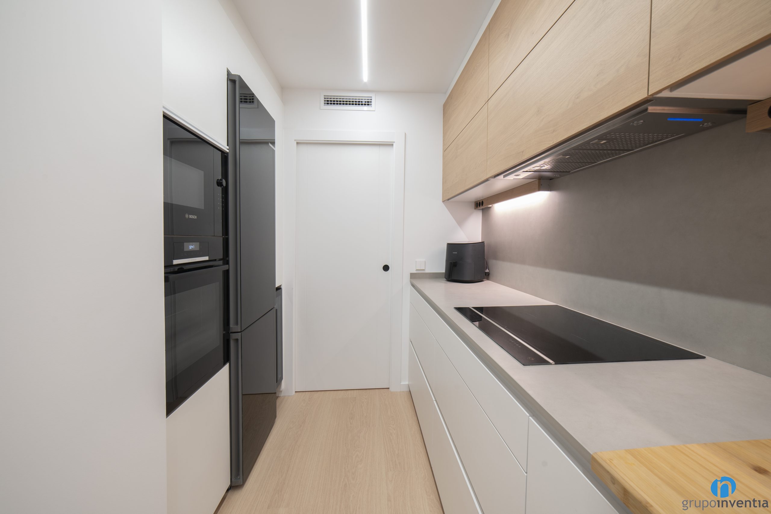 The kitchen is accessed through a sliding door and is laid out in a U shape. As it is a rectangular kitchen, it is a perfect arrangement to place the new equipment. We have managed to create a space with a lot of mobility to access all corners. Just to the right we have integrated several appliances with a black finish.