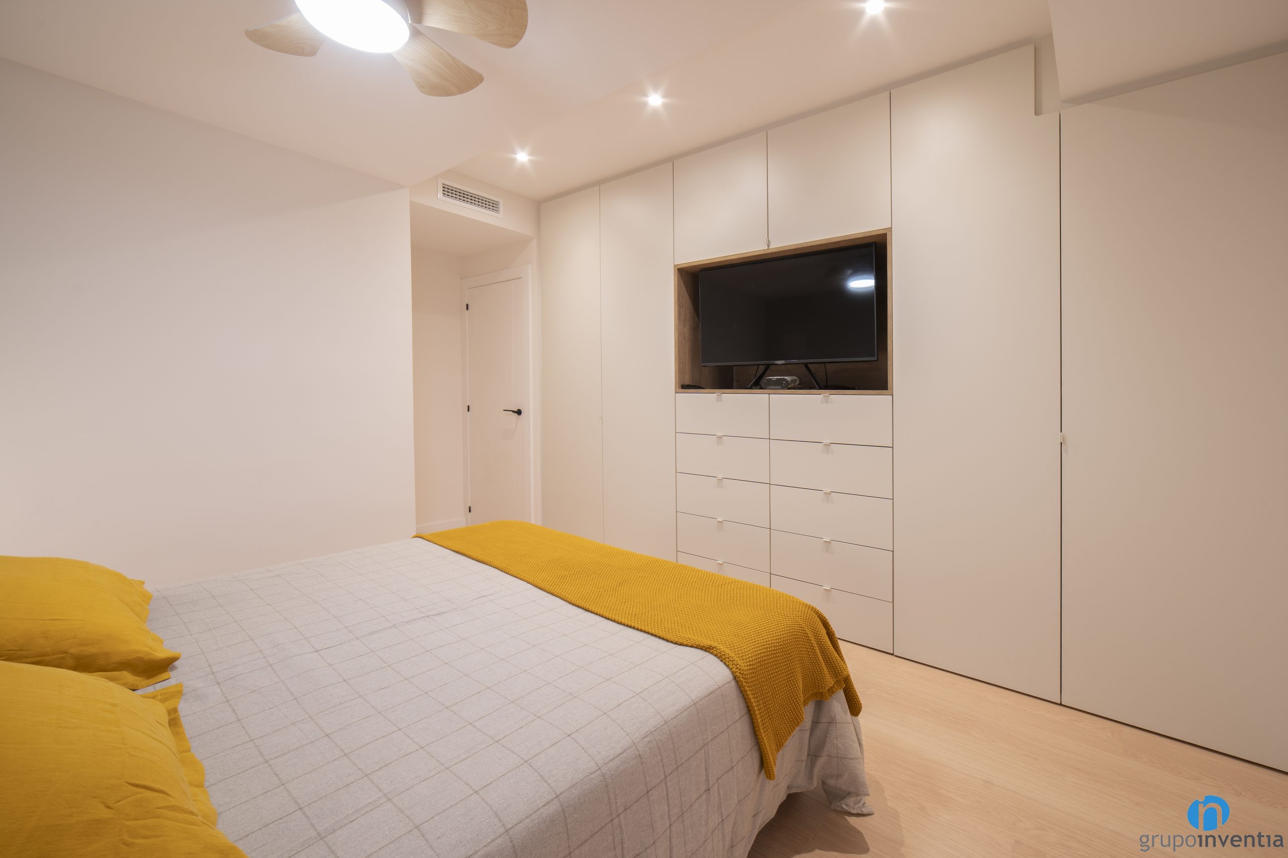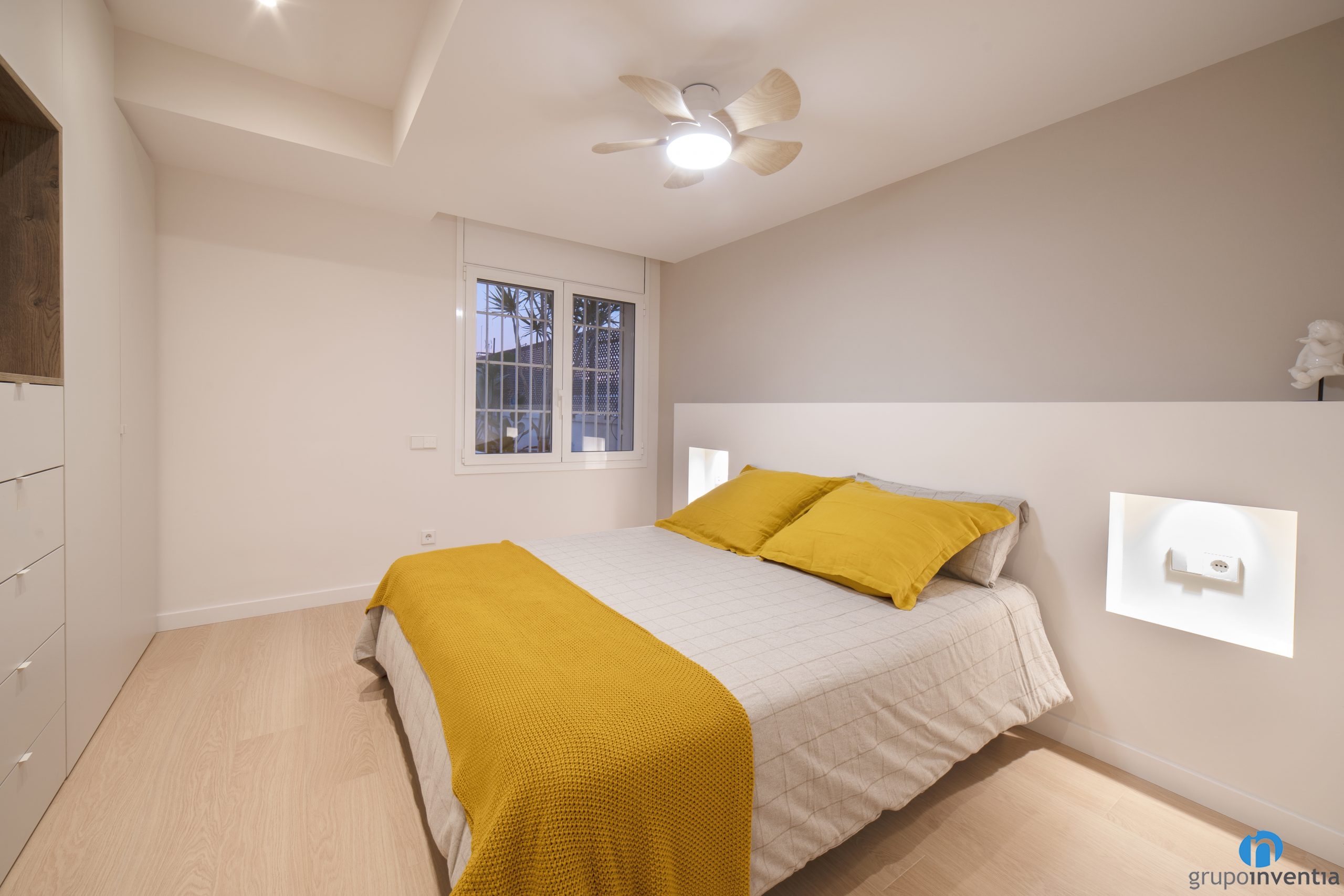We have painted the walls beige, standing out next to the doors and white frames. The roof is also white and is equipped with bull’s-eye lights. Perfect lighting is generated with a very discreet design. An interior renovation that can be appreciated both in the living room and other common spaces and in the bedroom.