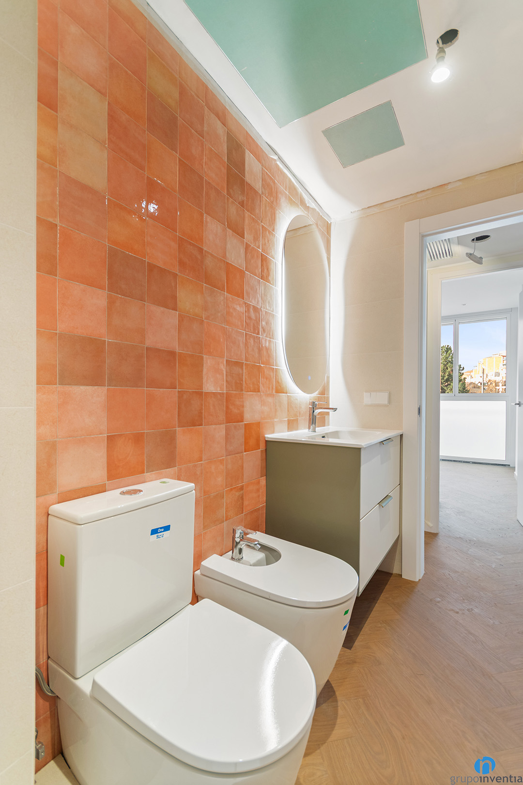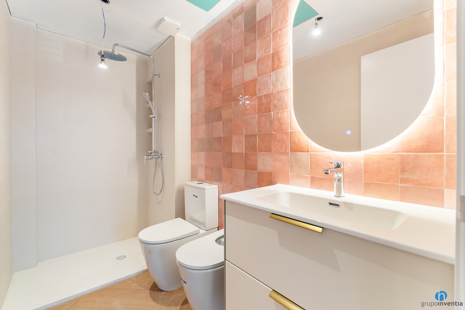 The washbasin wall stands out with square tiles in earth tones. This finish pairs perfectly with parquet-effect ceramic flooring. The result is a warm and balanced bathroom.