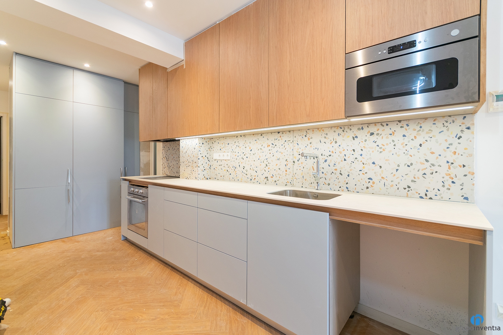 As part of this comprehensive renovation in Barcelona, the kitchen was fully renovated. It is an open kitchen with a linear layout. This design offers smooth mobility and functionality. Each element was placed for maximum efficiency.