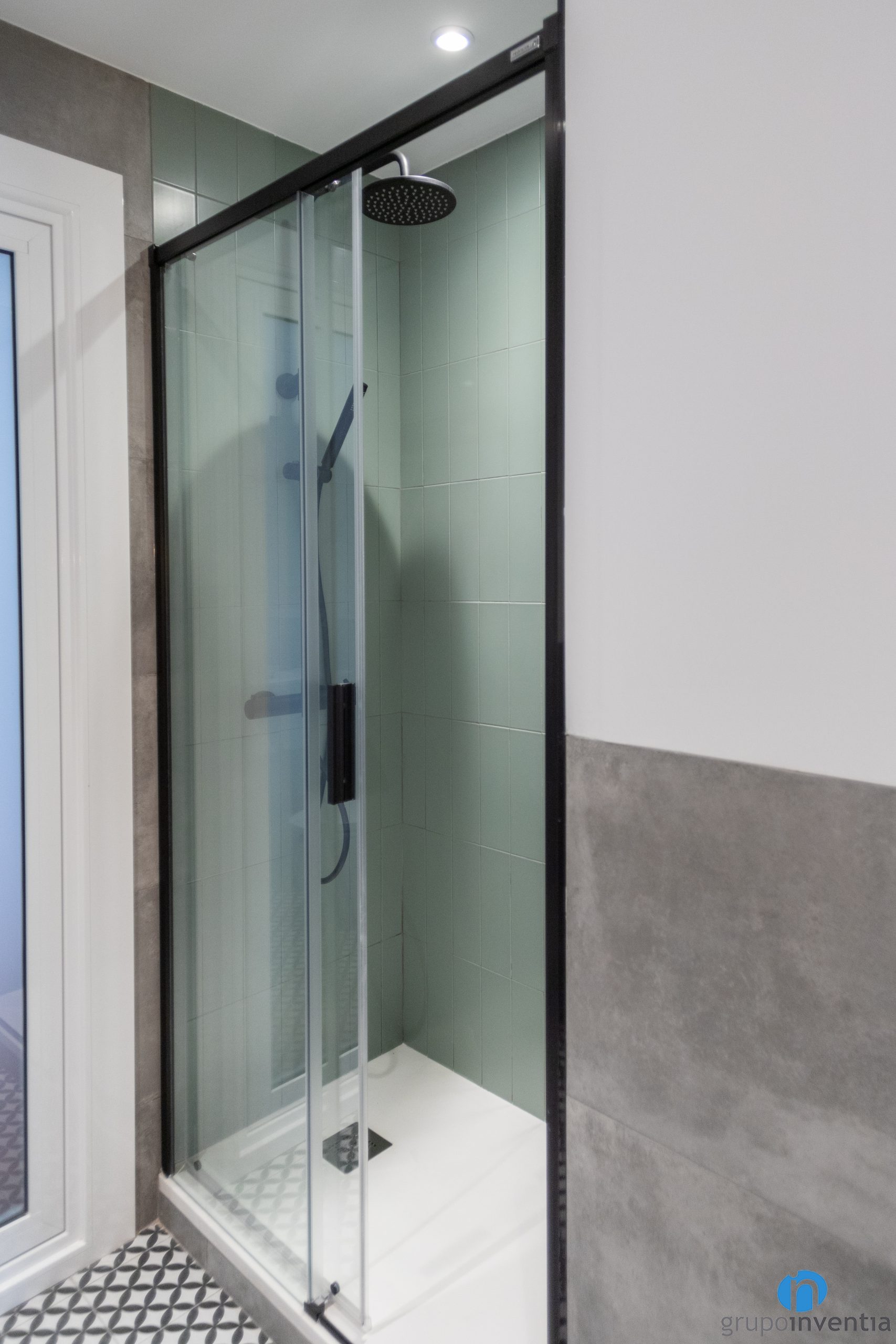 Both bathroom renovations have a similar surface area and the same sanitary fixtures have been installed. Each one of them has a sink with storage furniture, a toilet and a walk-in shower. In this case the water area is well protected with sliding door screens.