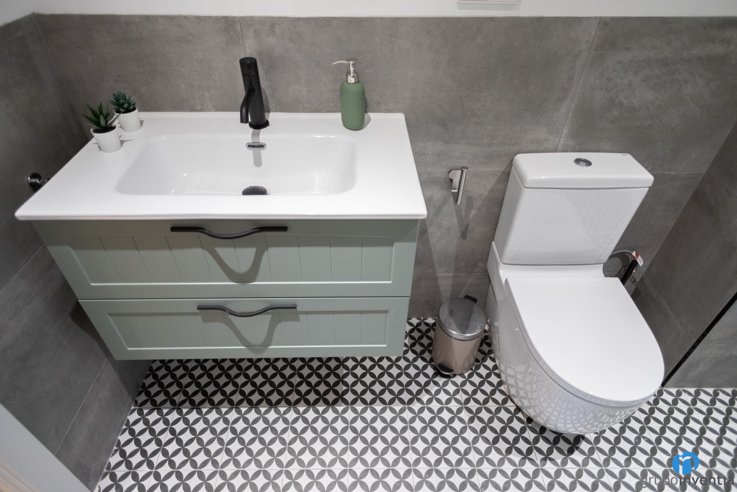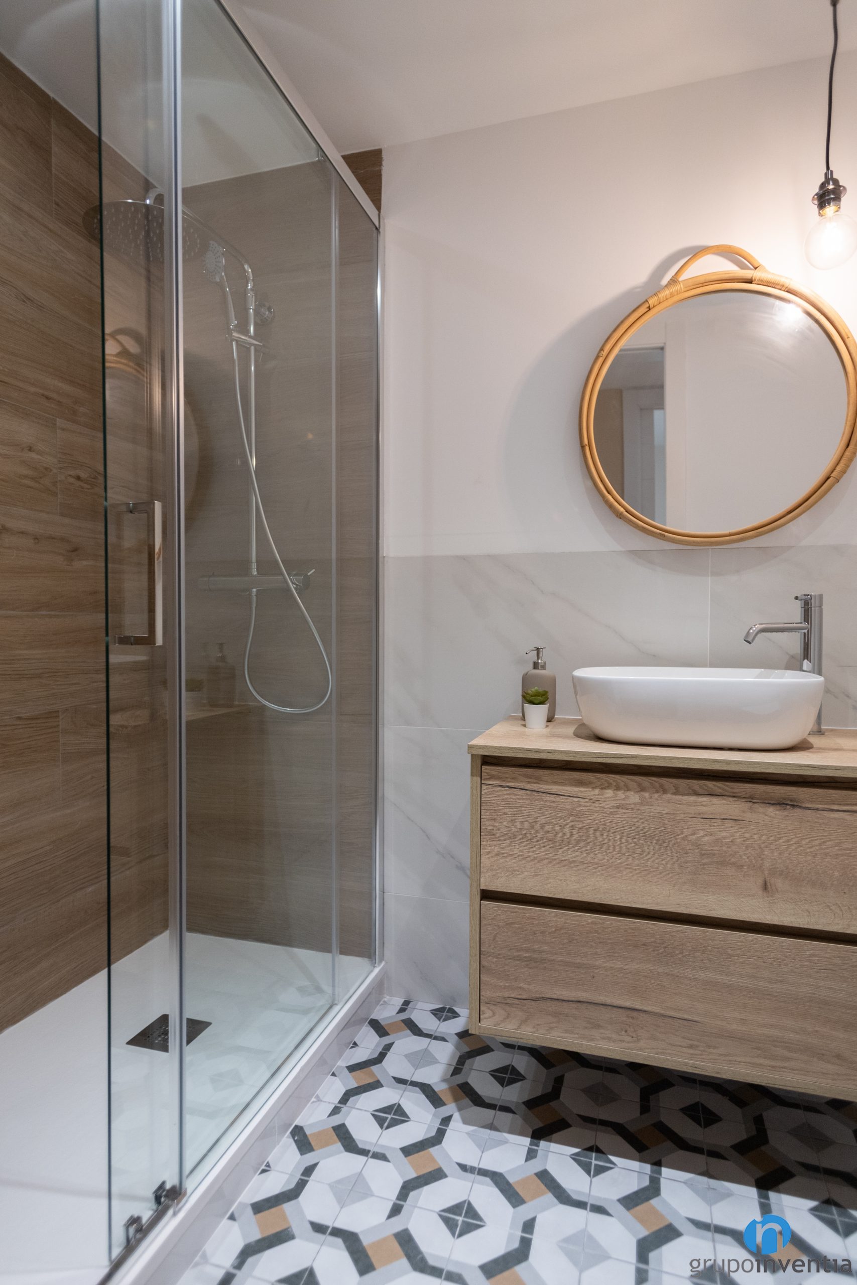In this renovation in Barcelona, a complete bathroom renovations has also been carried out. In both cases, the image has been improved and new sanitary equipment has been installed. The walls of the bathrooms have been tiled at medium height and a hydraulic type floor has been used for the new floor. A current image with a lot of personality has been printed.