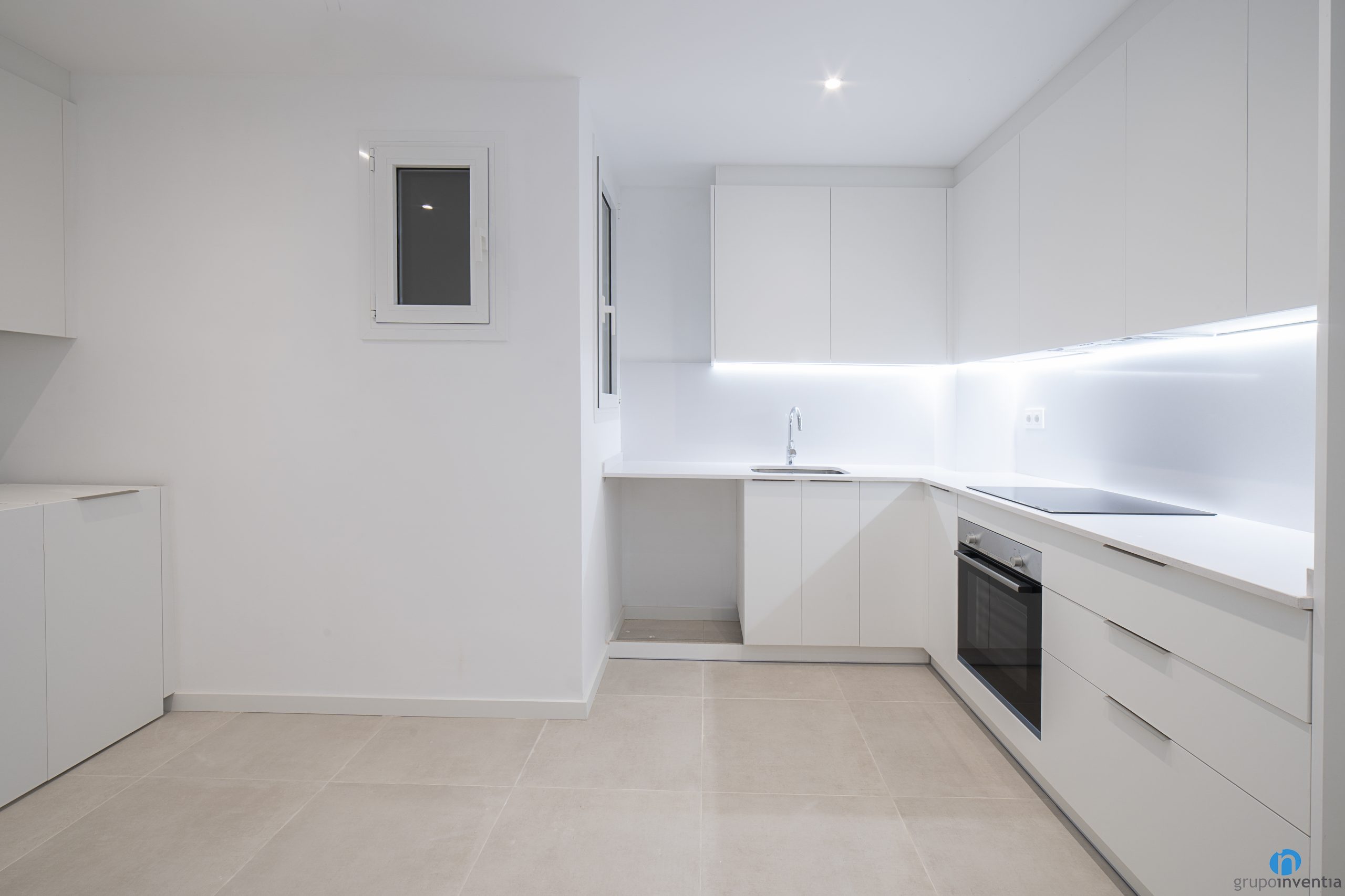 The kitchen of this flat in Barcelona is located in its own space which is accessed through a sliding door. It is a large surface kitchen and we have installed a new L-shaped kitchen furniture. It has several custom-made holes to integrate the different appliances.
