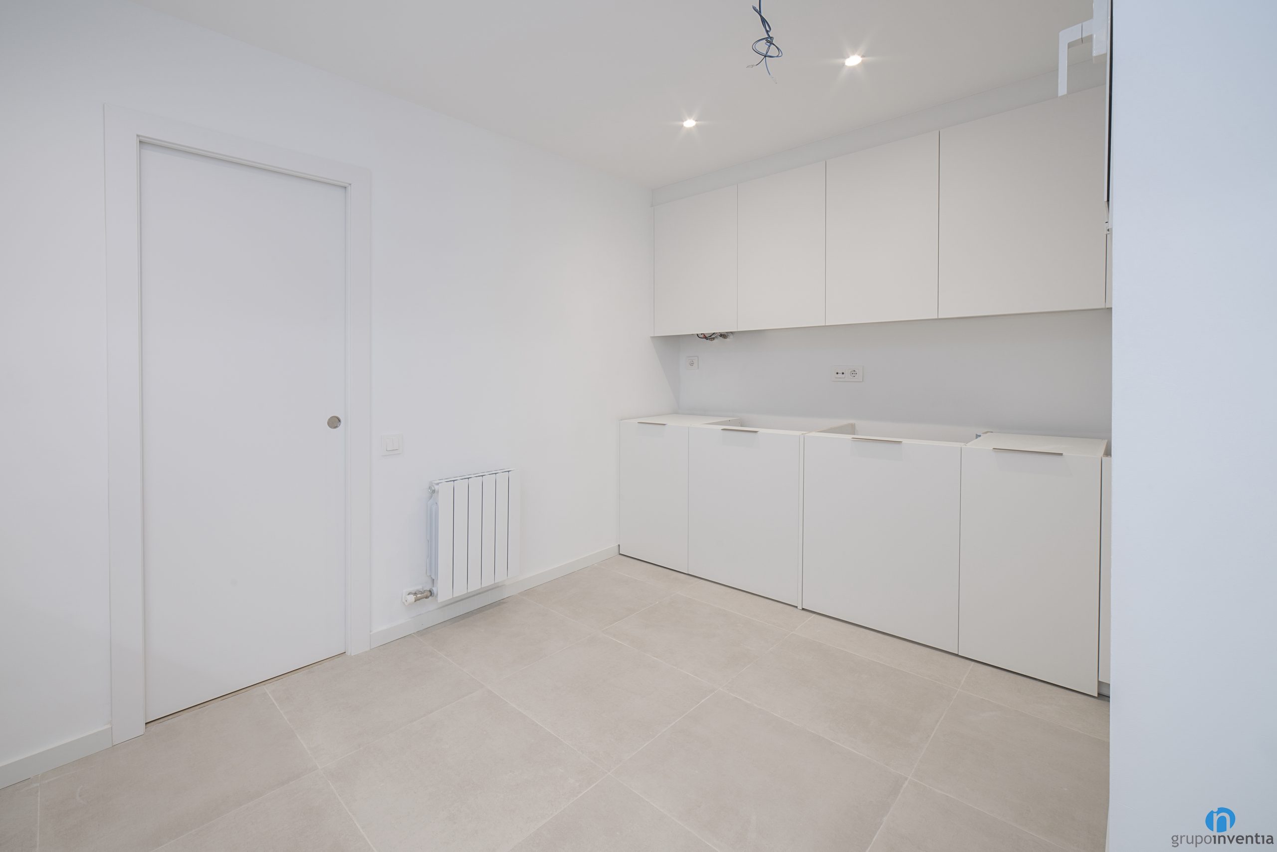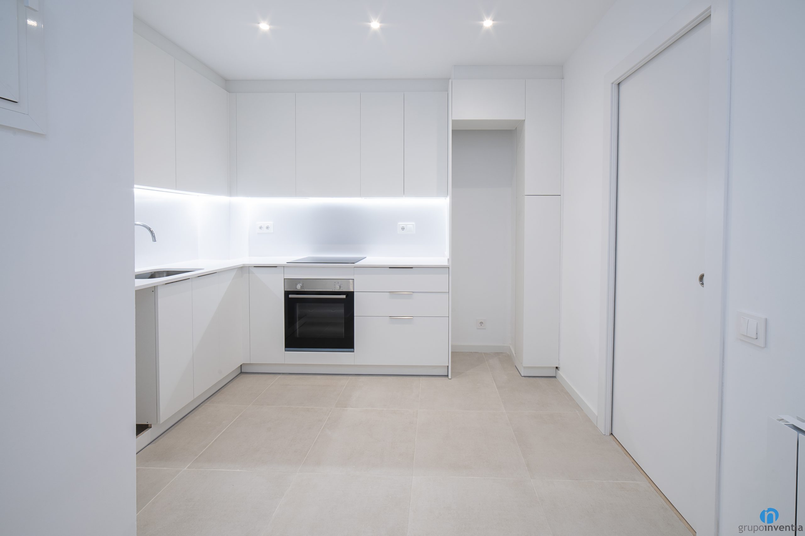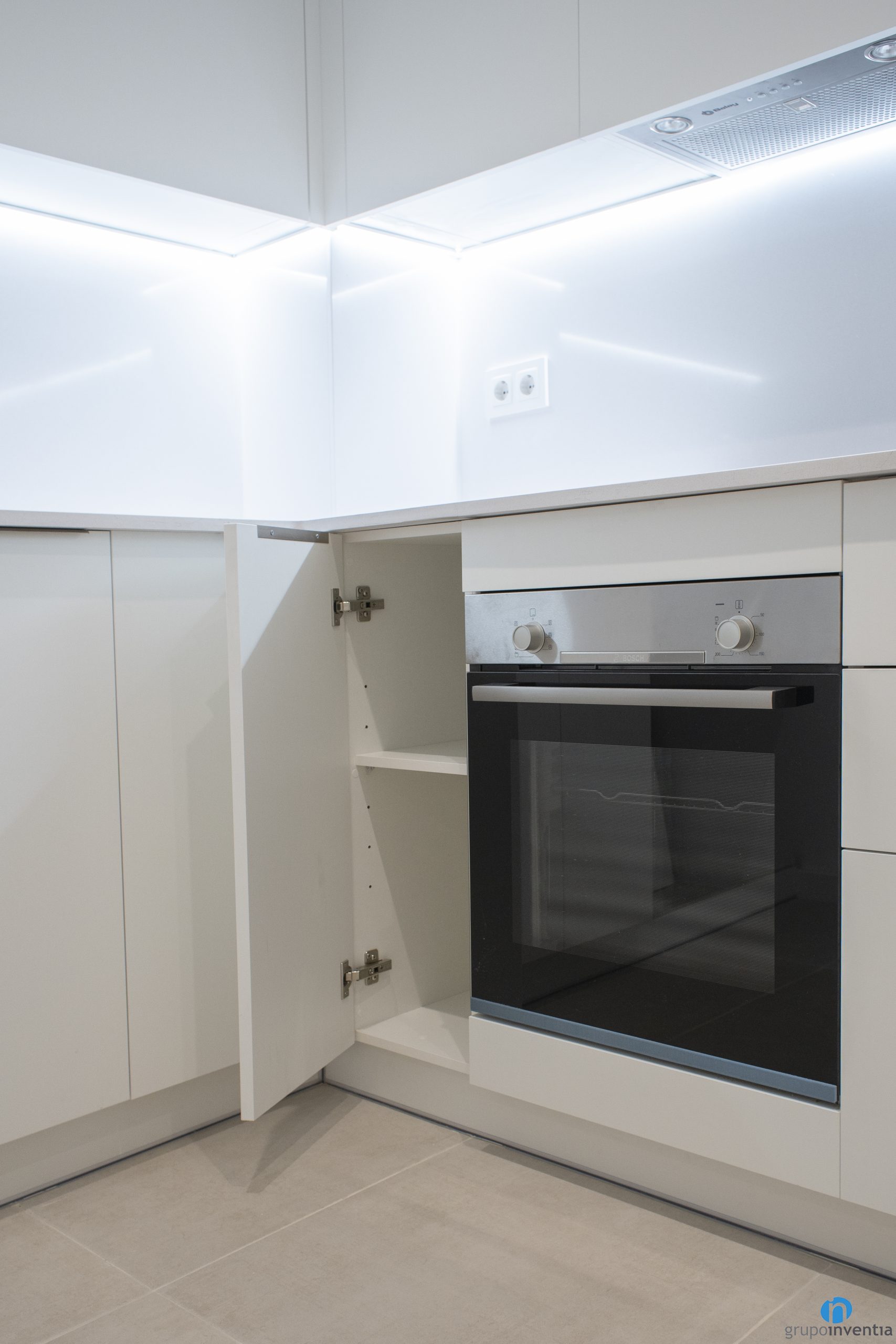 The design of the kitchen maintains the contemporary image of the rest of the apartment. The kitchen furniture in white and the worktop too. The upper cupboards have smooth panels and the lower drawers open with a discreet silver-coloured handle. In this kitchen renovation we have also placed a new floor of beige tiles.