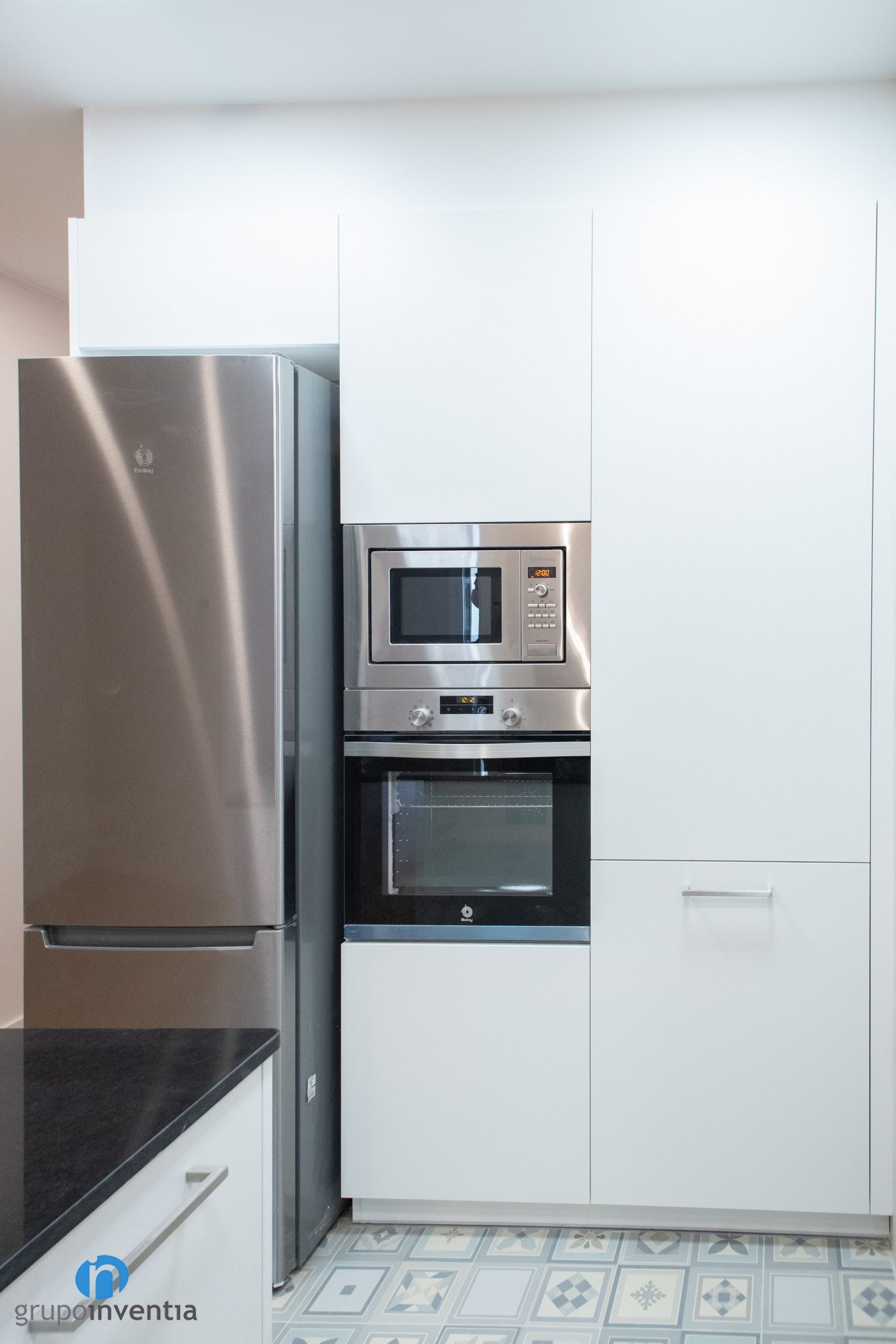Our experts in kitchen renovations in Barcelona have worked to completely renovate this flat renovation. Now the kitchen is open and has all the necessary elements to offer the best benefits. The appliances have been integrated on the left side and consist of refrigerator oven and microwave. In this kitchen renovation, stainless steel finishing appliances have been chosen.