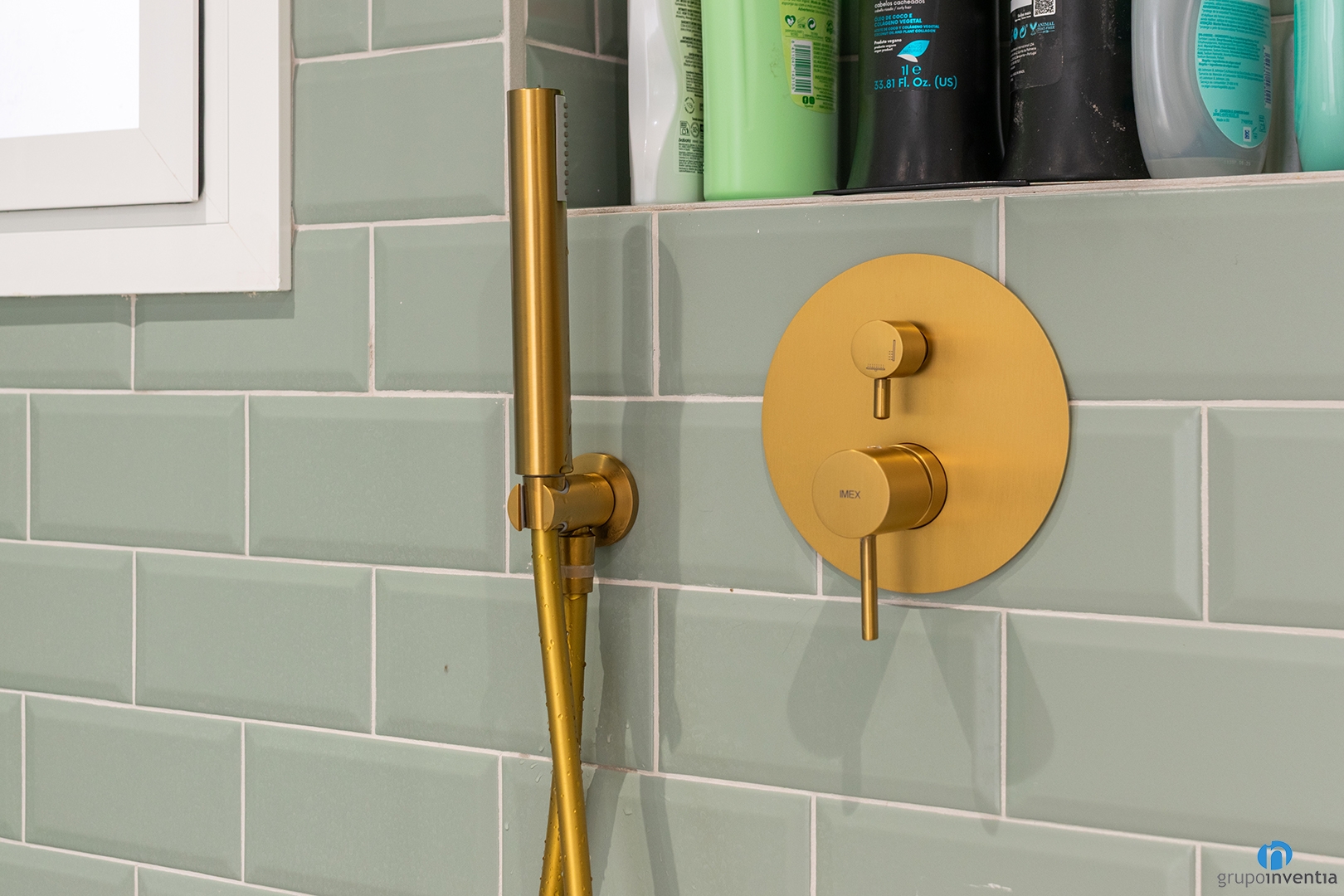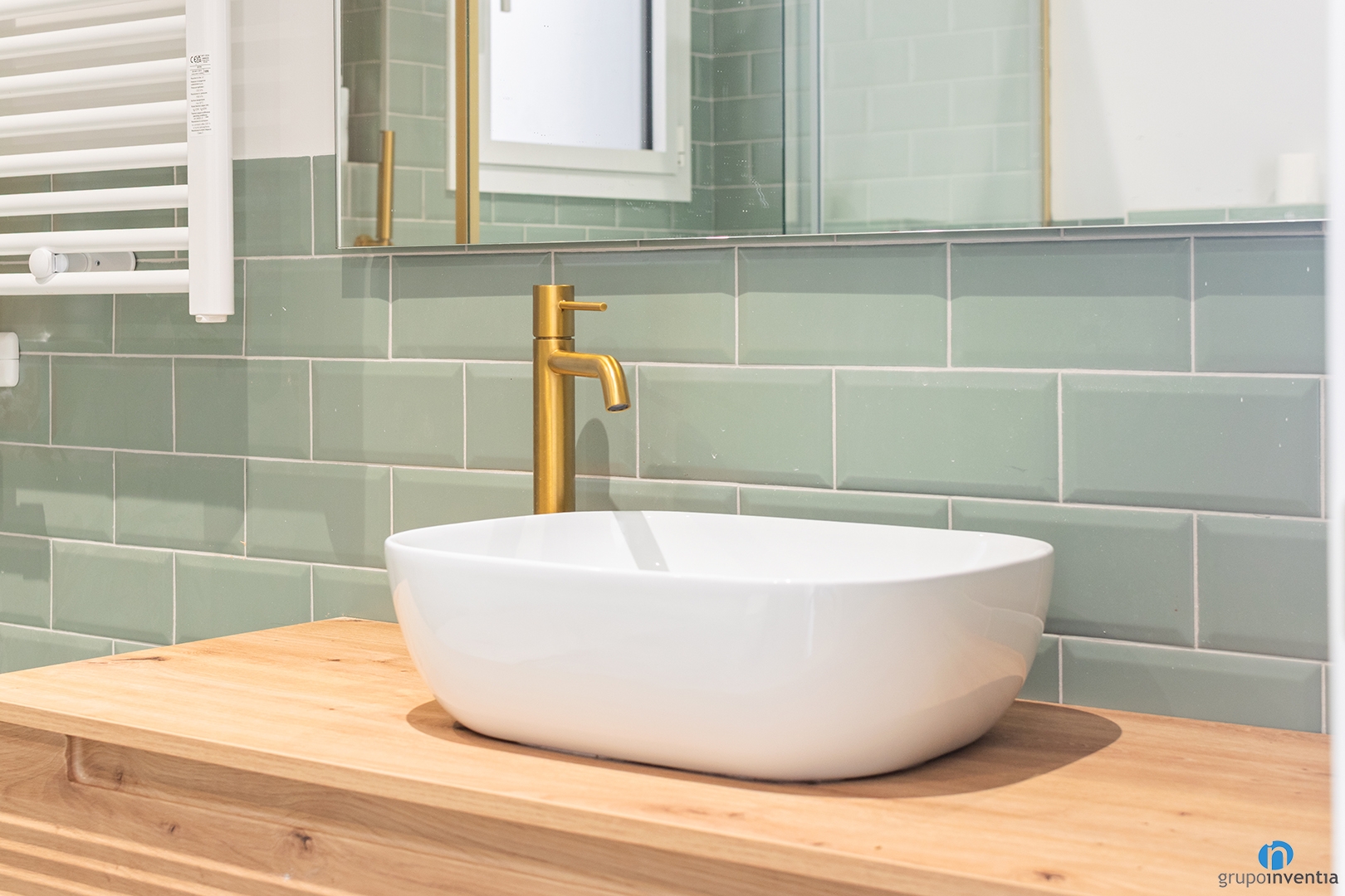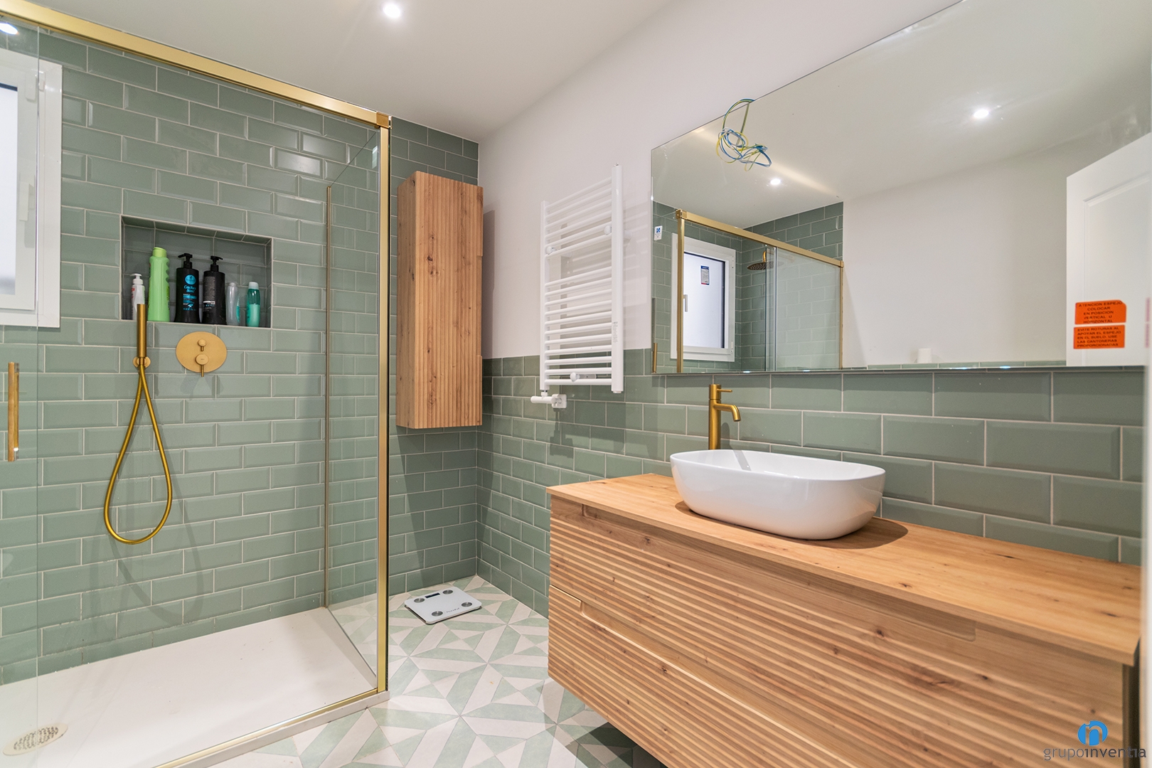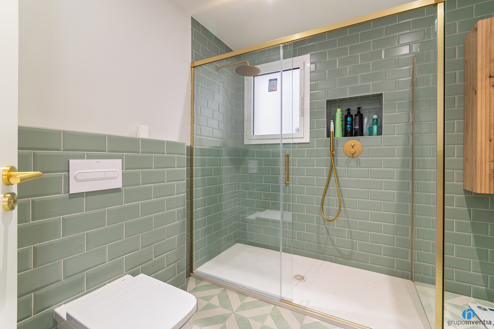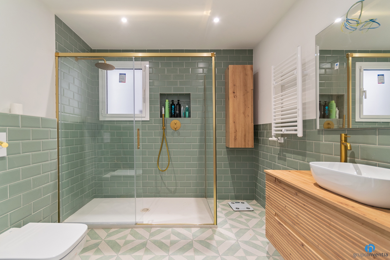 The bathroom has also been completely updated. The new image is fresh and relaxing. The walls have been tiled with green bevelled tiles. The remaining wall surface has been painted white. This contrast brings light and balance. The flooring is hydraulic style and uses the same tones.