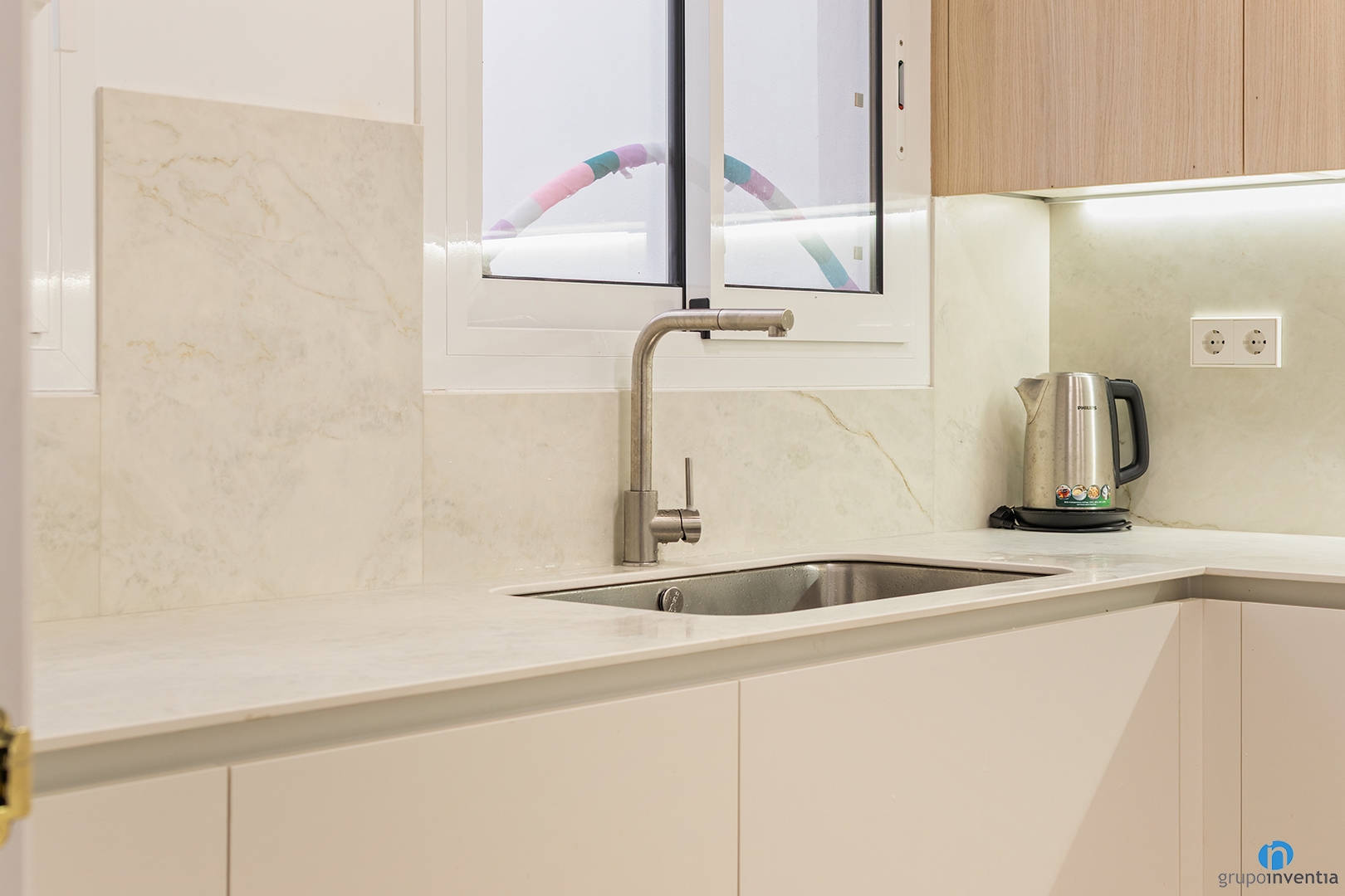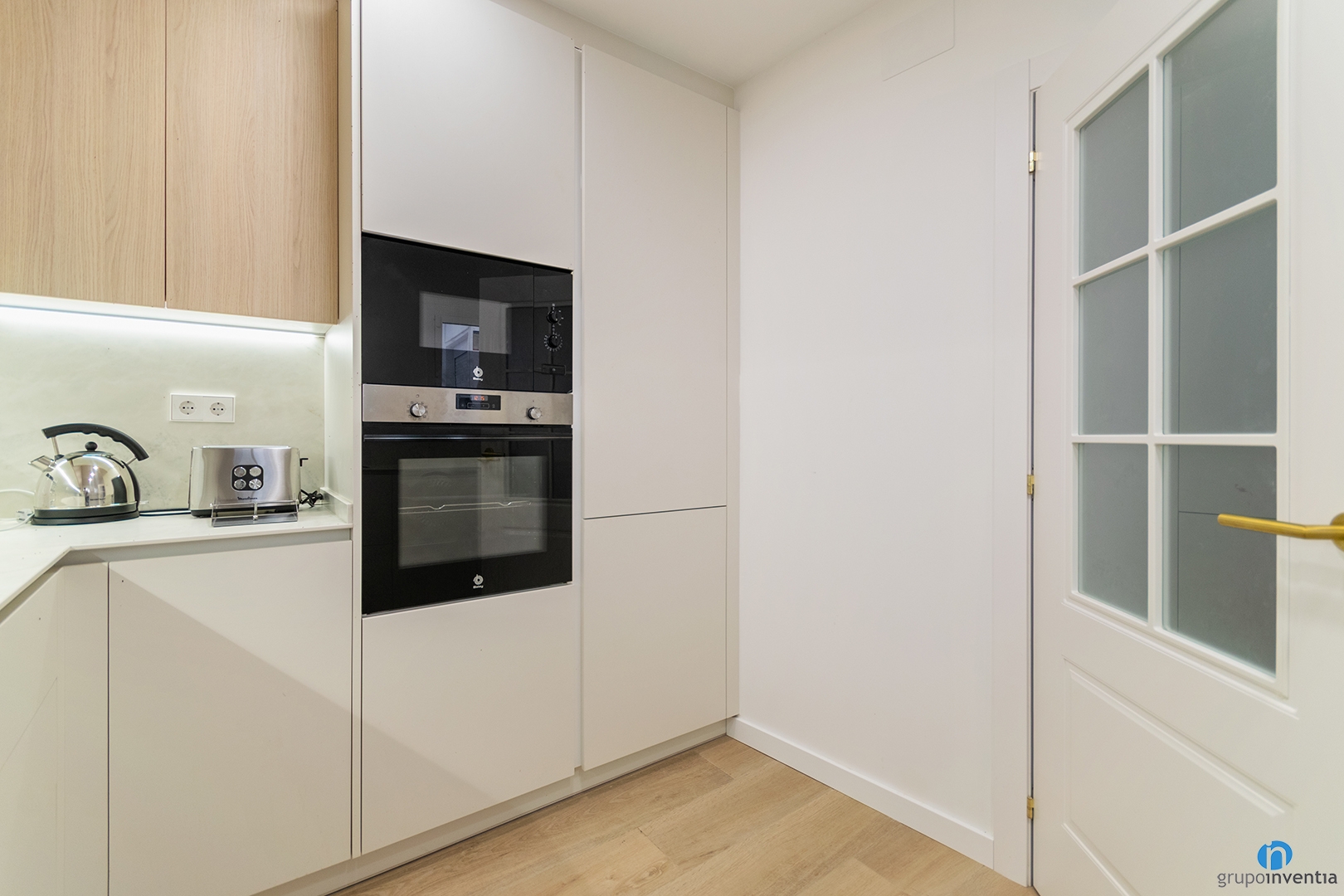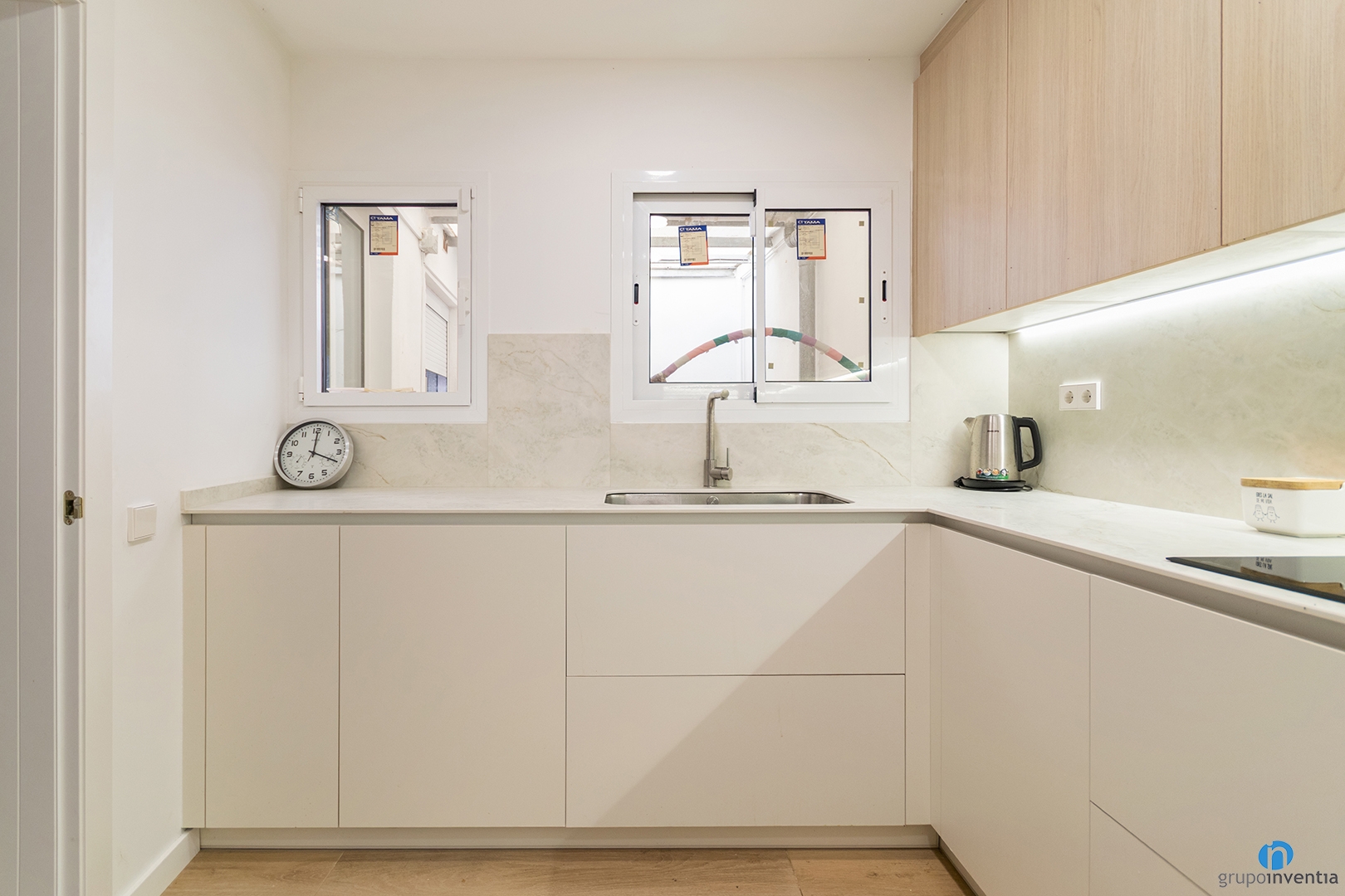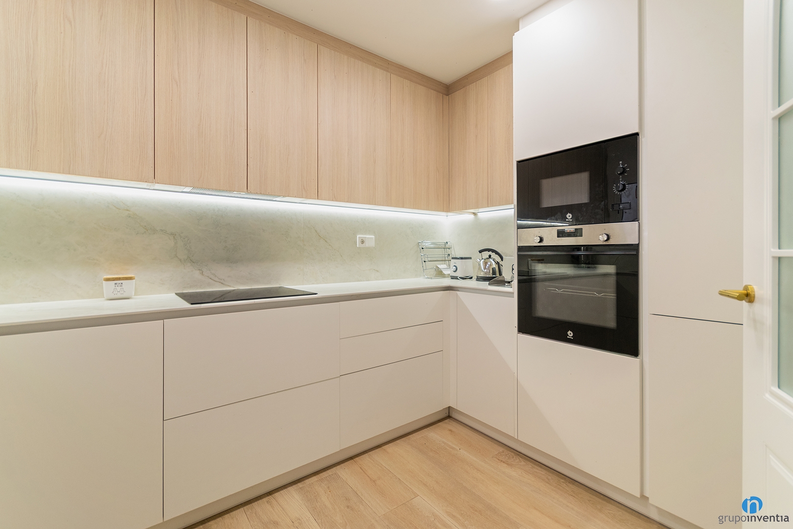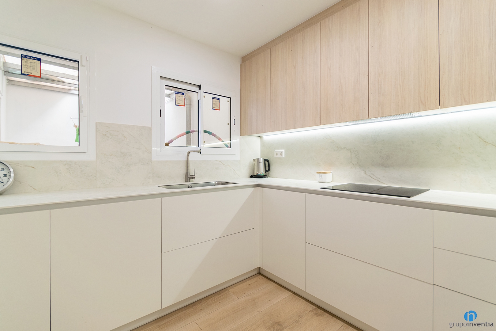 On the right side there is a tall unit with custom compartments. It integrates the microwave, oven and fridge. The fridge is hidden behind the cupboard door. This keeps a clean and unified look. The colour combination plays an important role in this full renovation in Vilassar de Dalt. The lower cabinets use a neutral tone. The upper cabinets feature a wood finish, matching the new flooring.