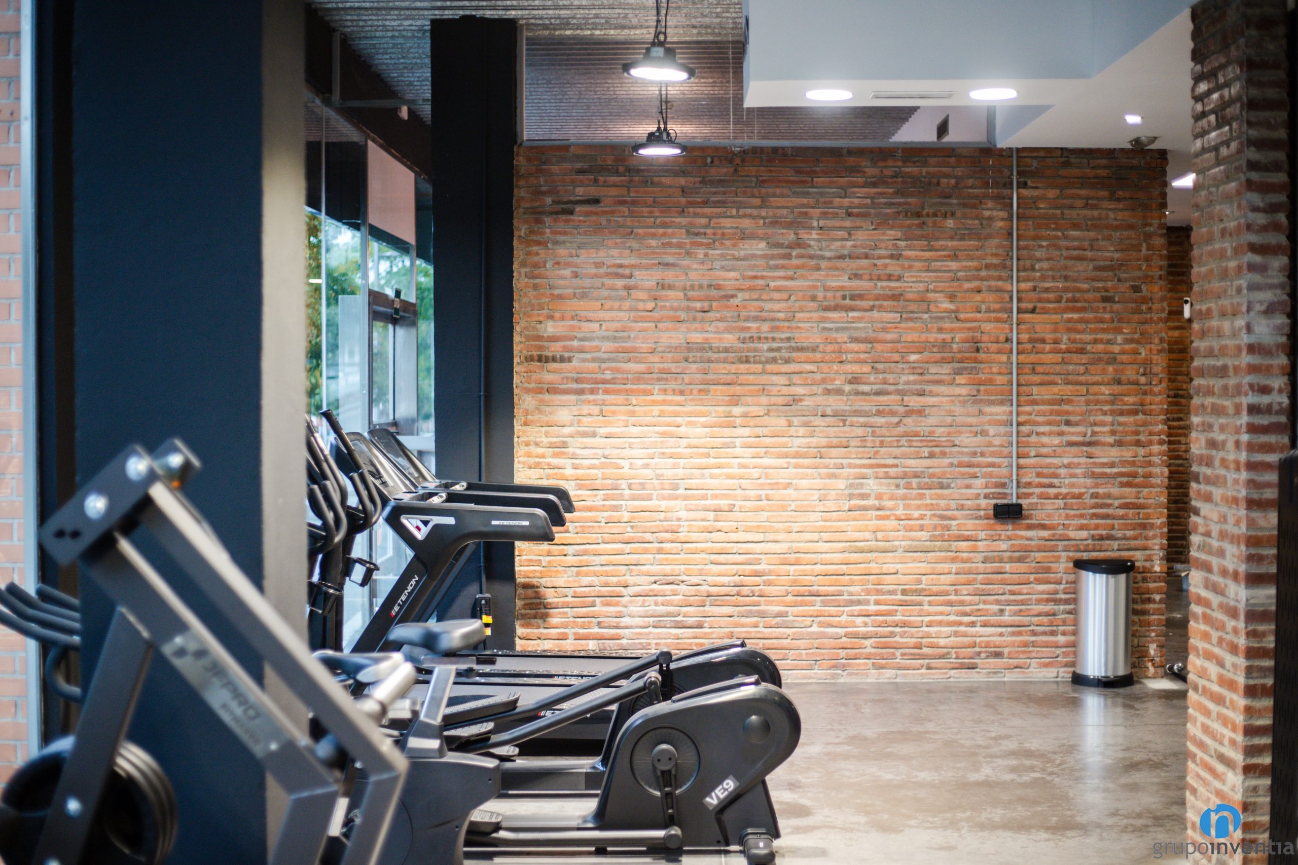 This gym in Martorell has large entrances of natural light. In this way, the weight room space is perfectly lit. In addition, it allows pedestrians to appreciate the interior of the gym. As in the reception, the walls are exposed brick. Next to the columns covered with mirror-effect metal, the interior design is modern and industrial.