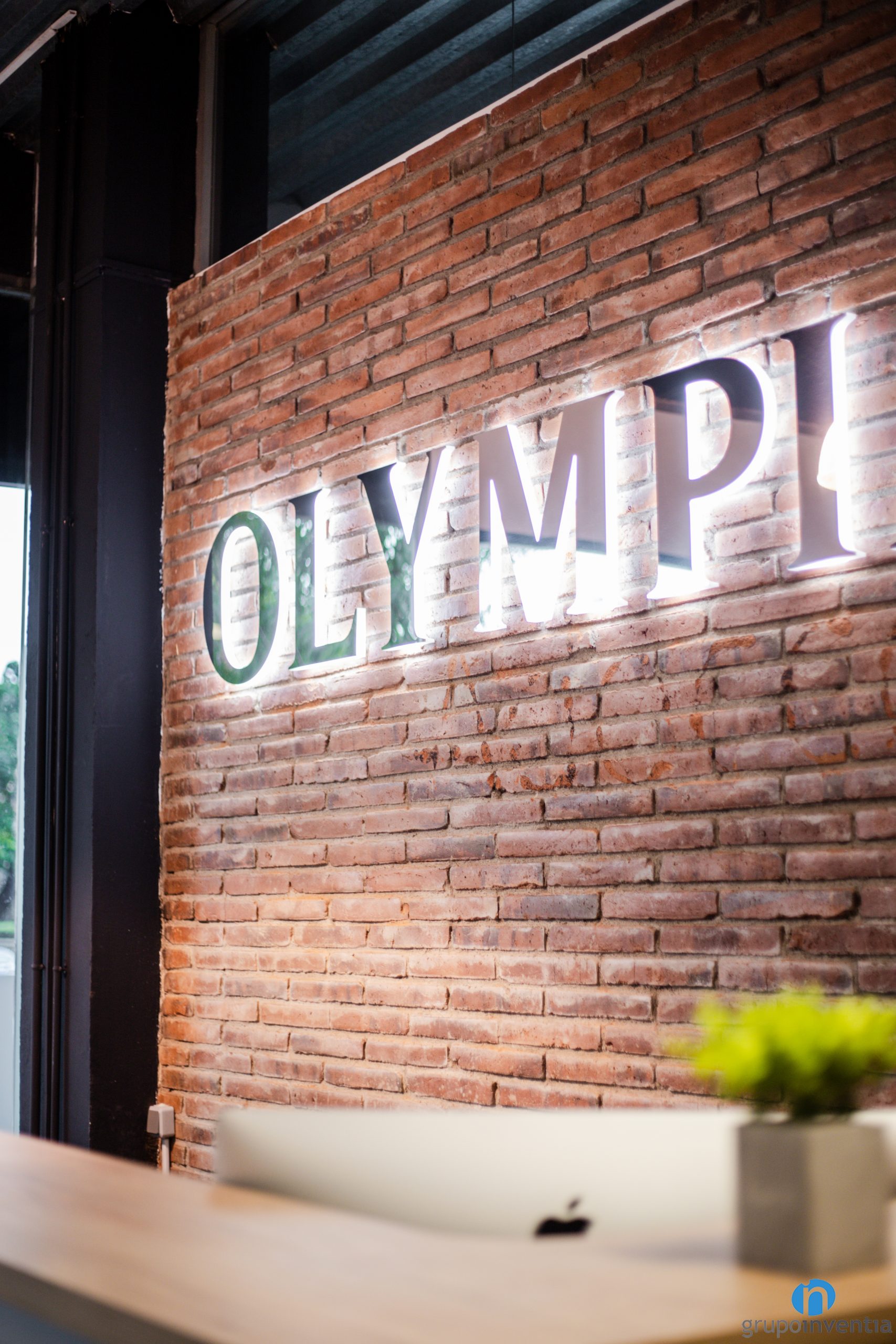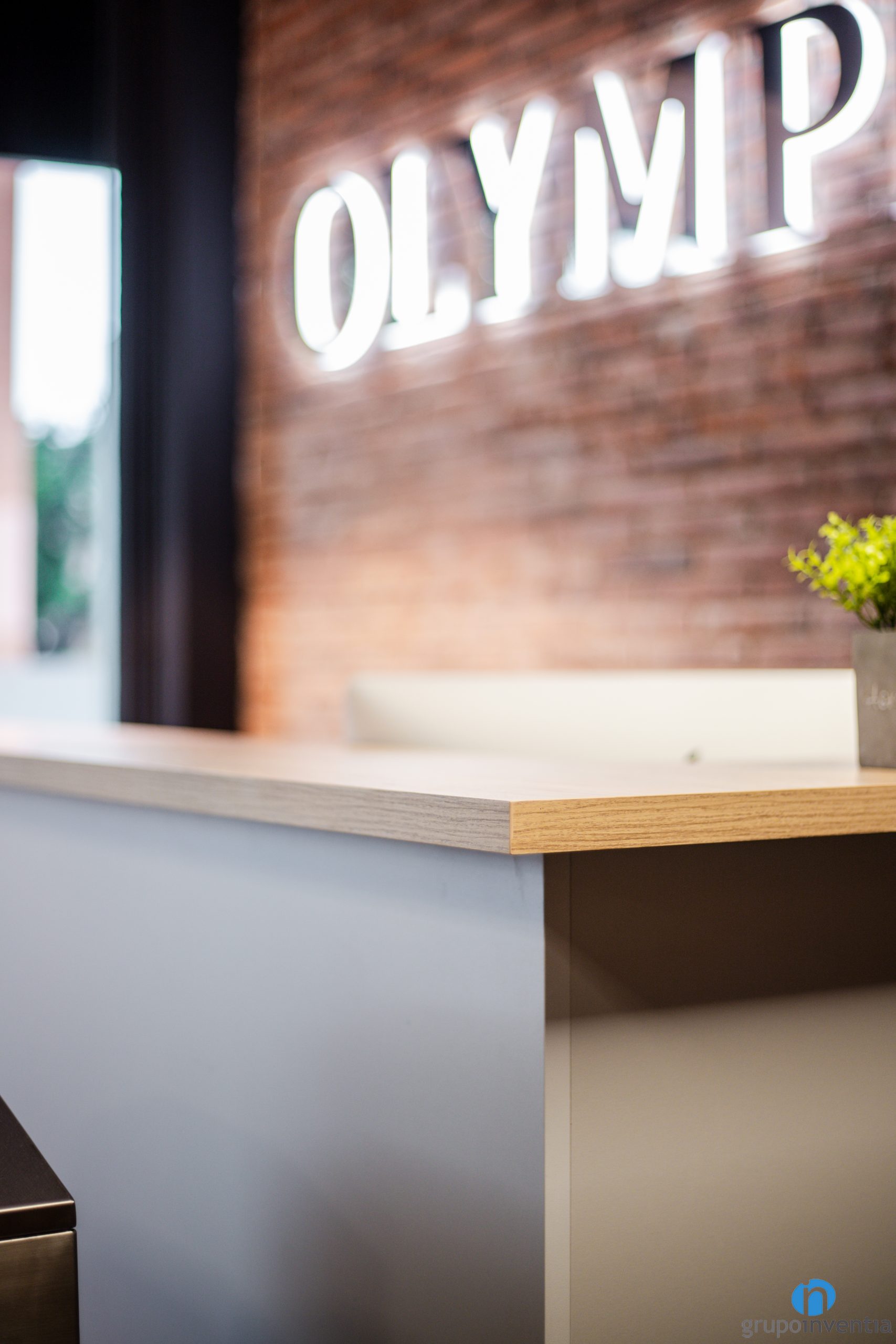 On a white counter with a wooden finish board. It fits perfectly with the new gym design, a style that generates comfort through neutral and warm tones. The wall is made of exposed brick and is decorated with the name of the gym. They are silver in color and light up on the back.