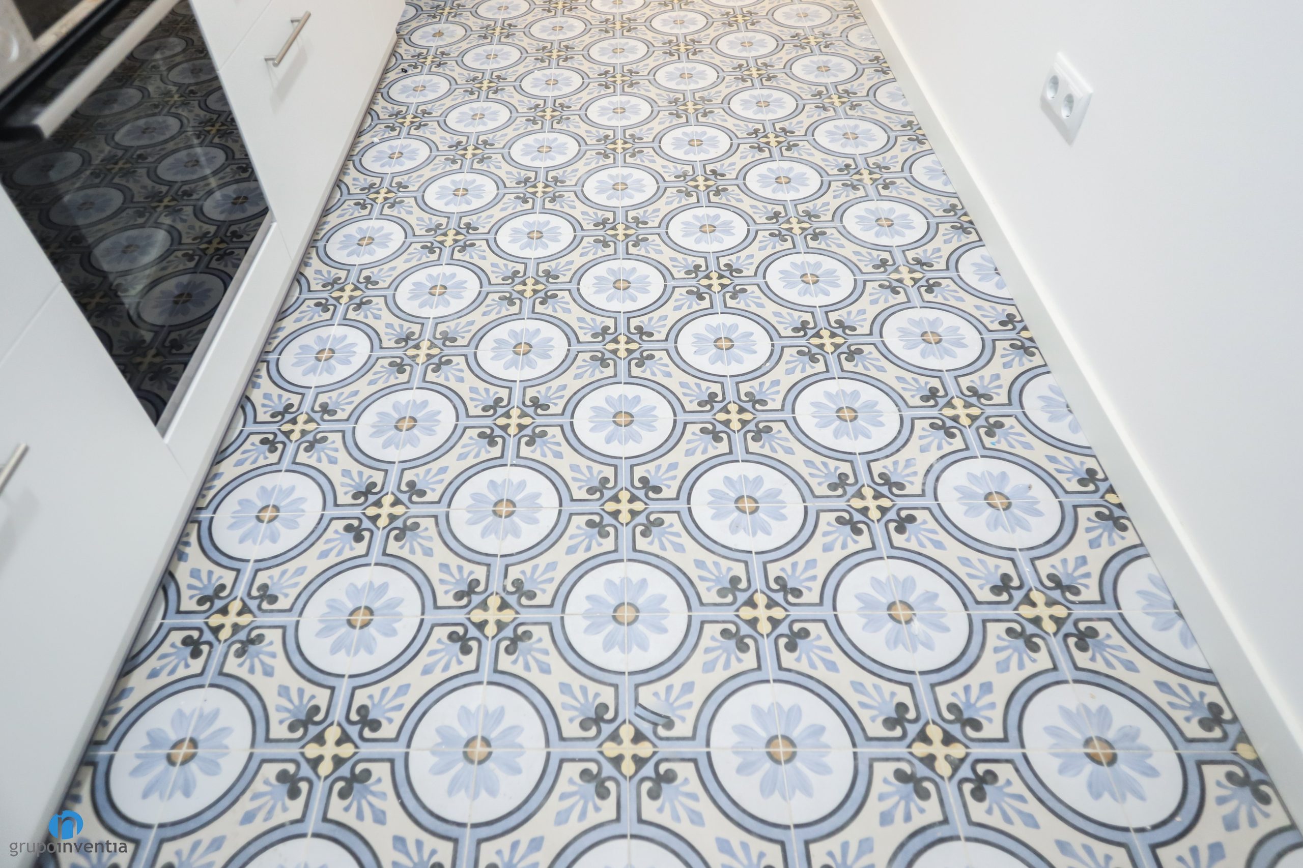 This is where the oven and microwave, respectively, have been integrated. A custom-made hole has also been provided at the end to integrate the refrigerator. Another detail that has changed in this kitchen is the flooring. A hydraulic type floor has been chosen that adds a lot of color and personality to the whole kitchen.