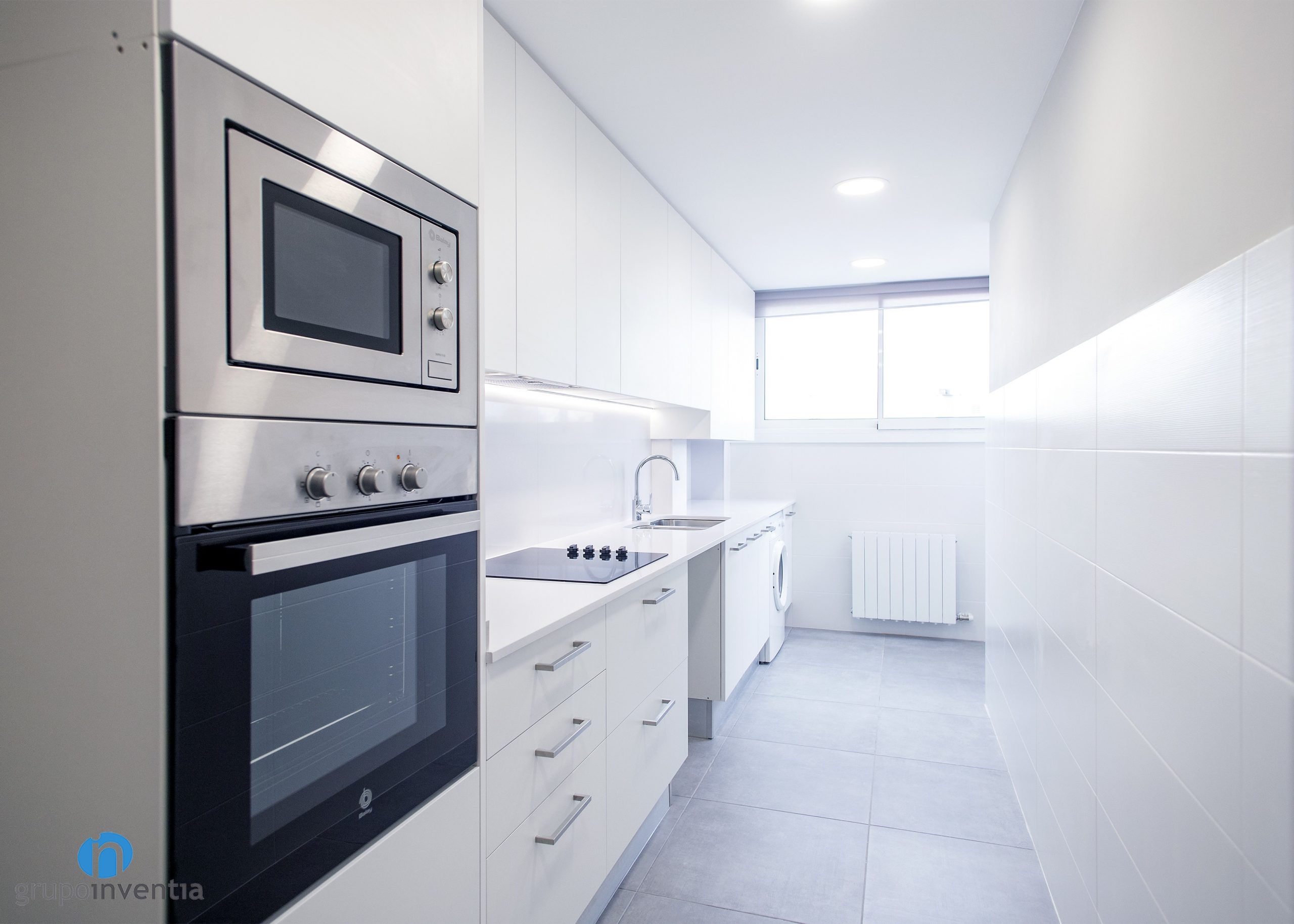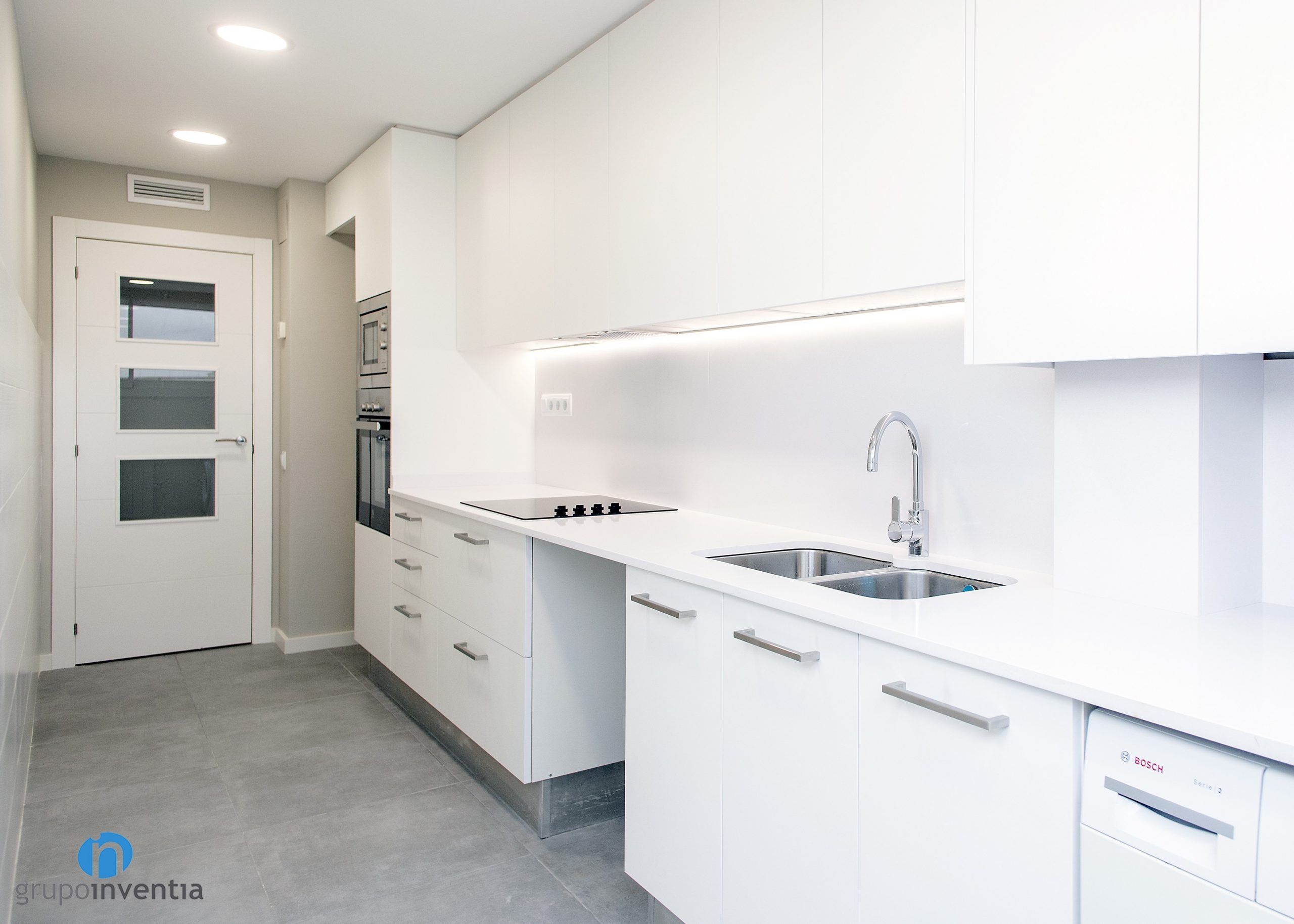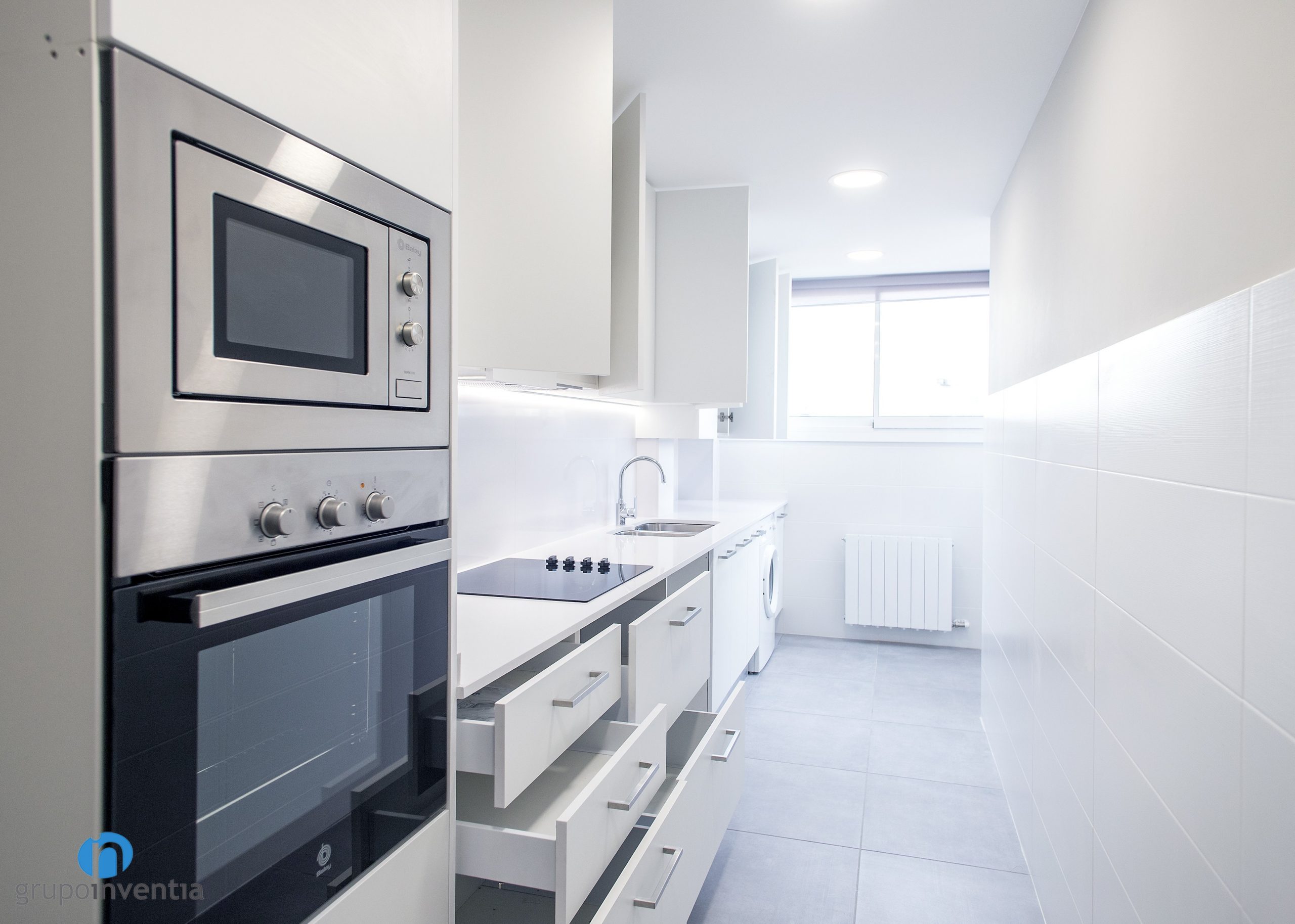 This kitchen renovation also has implied improvements in the image of the room. We opted for white kitchen furniture, the same color as the tiles with which the wall was tiled. For the flooring, a gray-tiled floor has been chosen, a success both in visual and in practical.