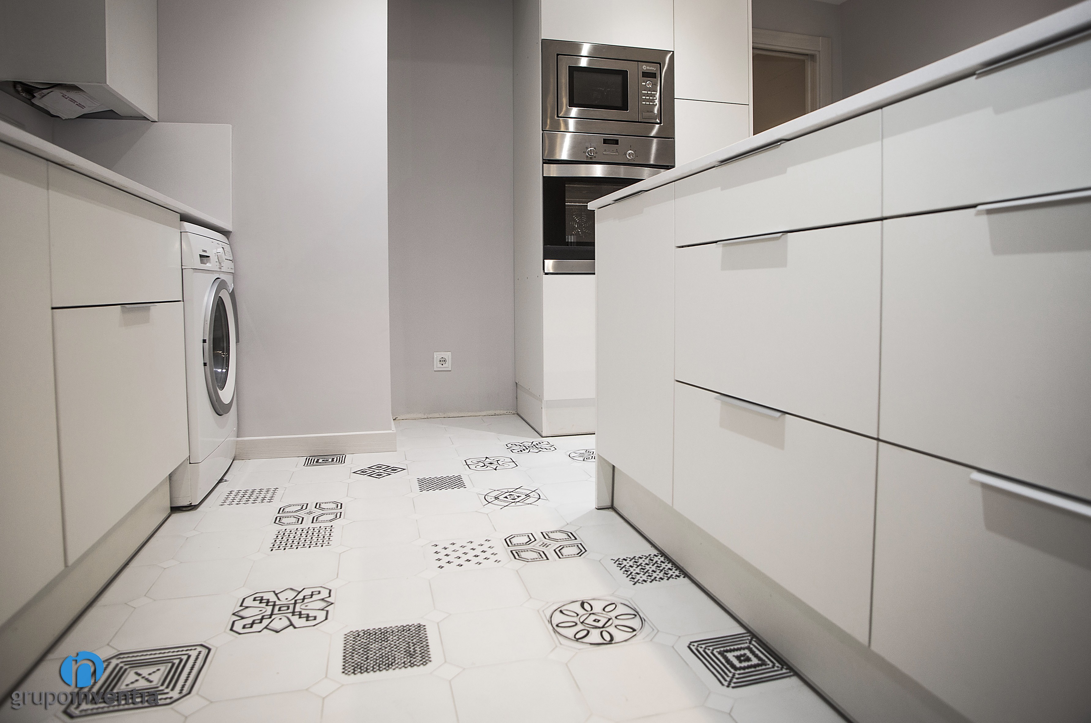 In this kitchen renovation predominates the white color, generating a spacious and bright space. For the pavement, mosaic type tiles were chosen, different from the parquet floor of the rest of the house and visually defined the kitchen floor.