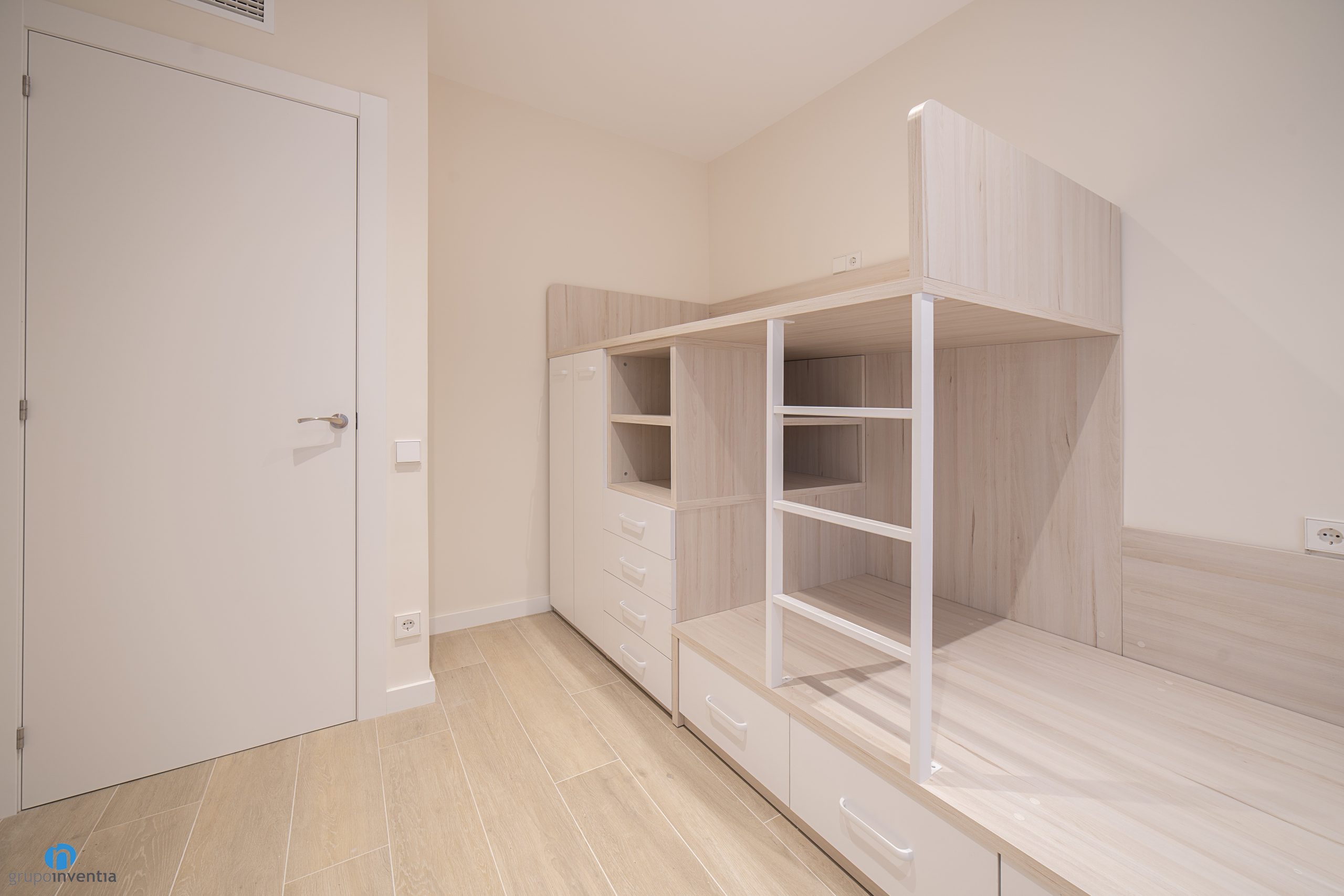 Most of the walls have been painted a soft beige tone. Thus the natural light reaches all the corners in a fluid way. It is also a warm color that allows you to combine very well the new white doors that have been placed and the new pavement. As in the two previous spaces, a ceramic floor with a wood finish has been chosen.