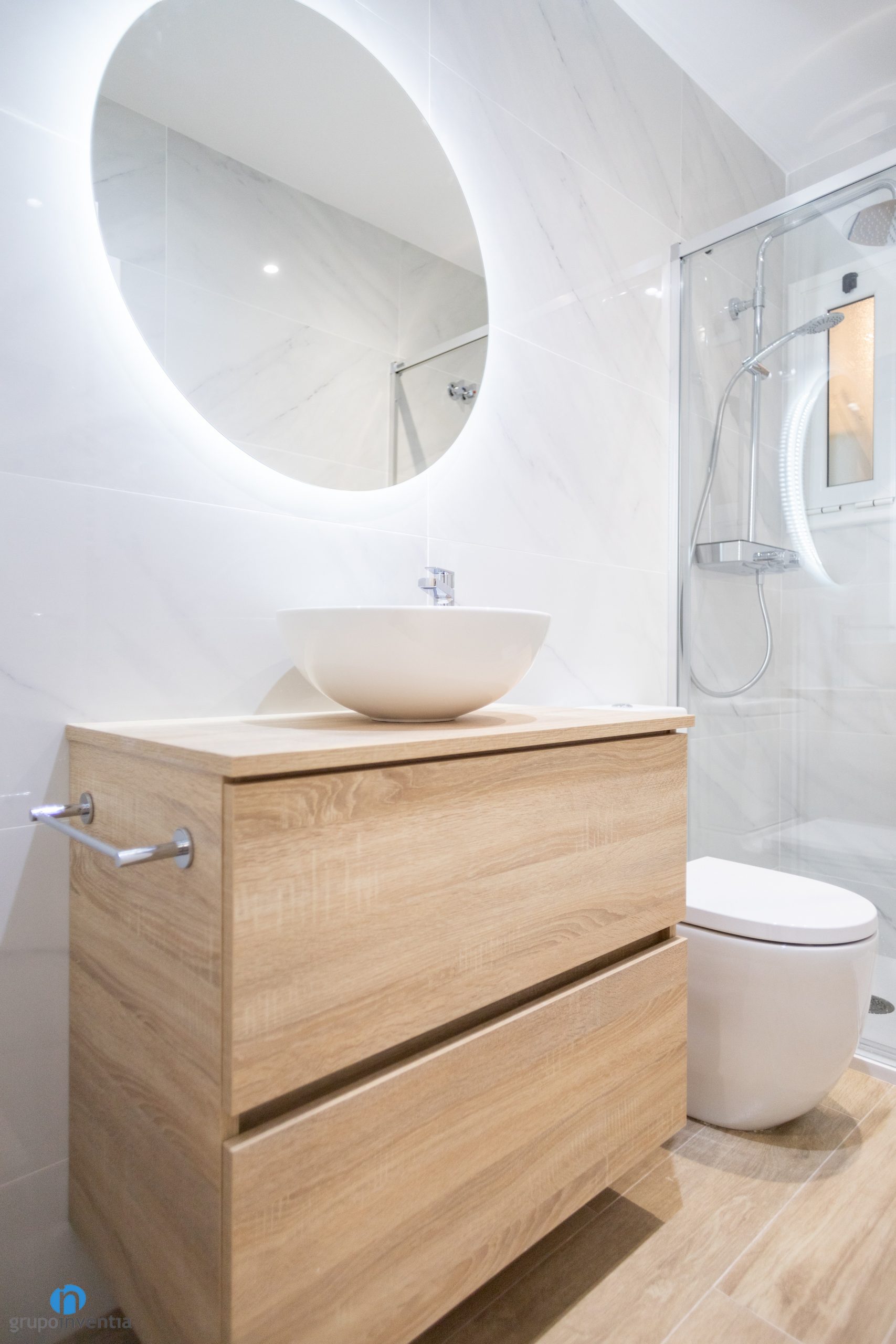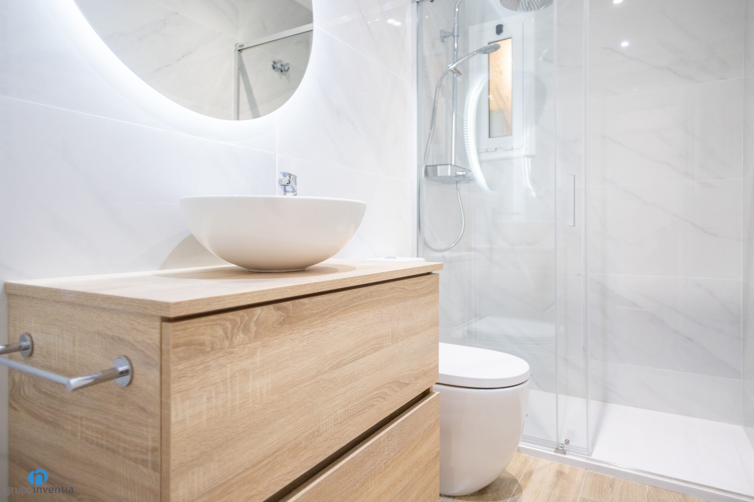 As it is a house renovation, we have also taken care of completely renovating the bathroom. The new image is similar to the rest of the house. A contemporary design with neutral tones that create a cozy atmosphere space. The walls have been tiled with large white tiles with marble details. The imitation wood ceramic flooring combines very well with the new bathroom furniture.