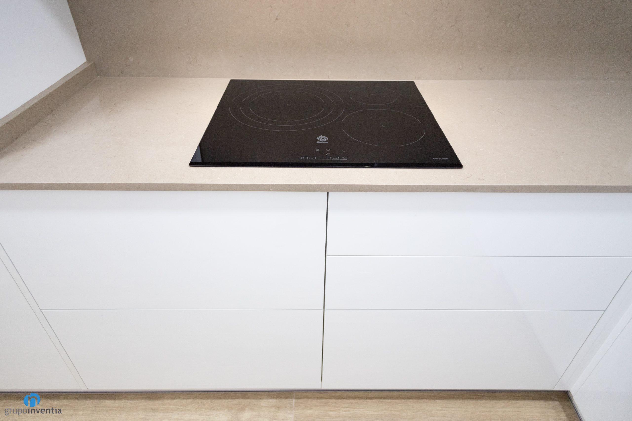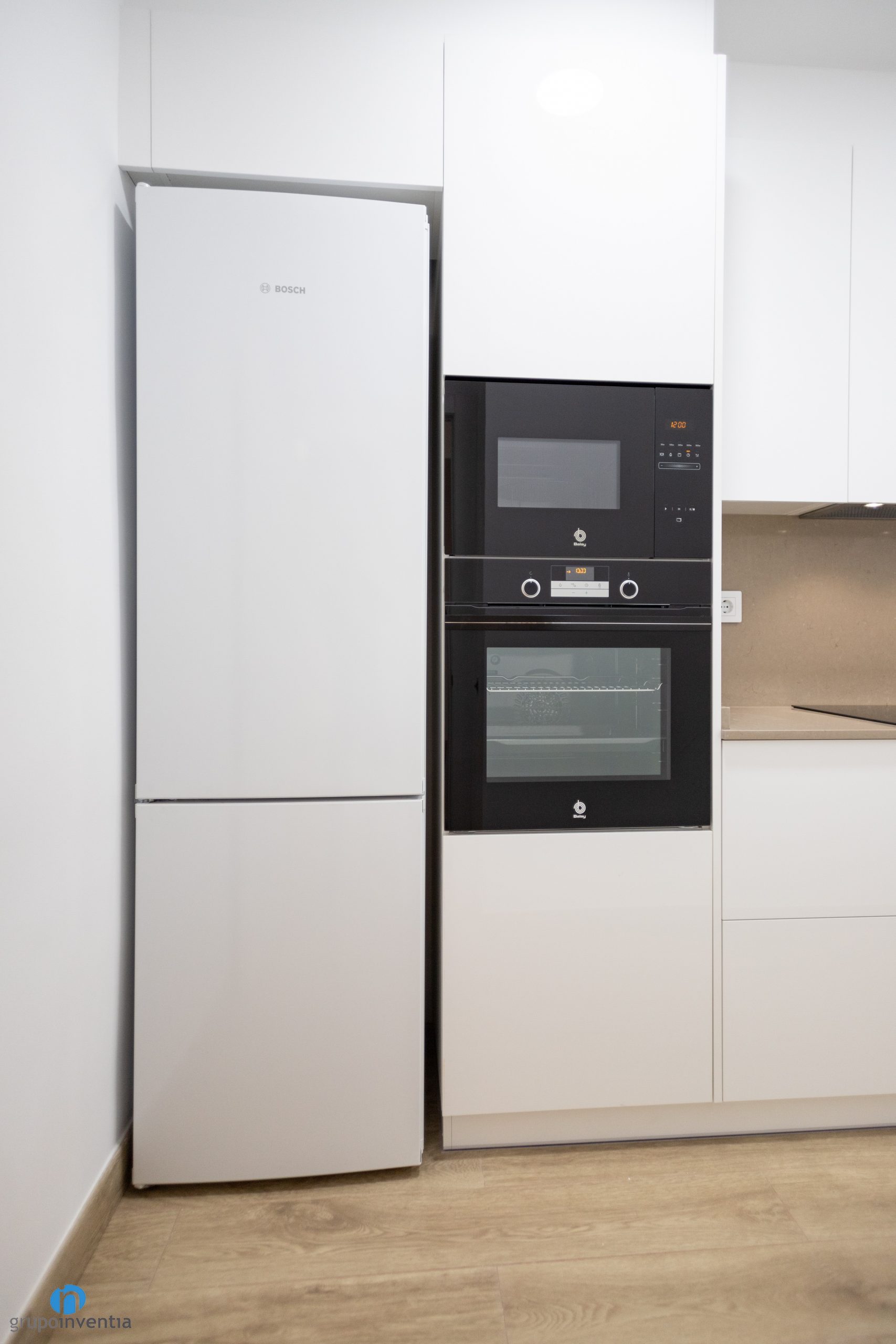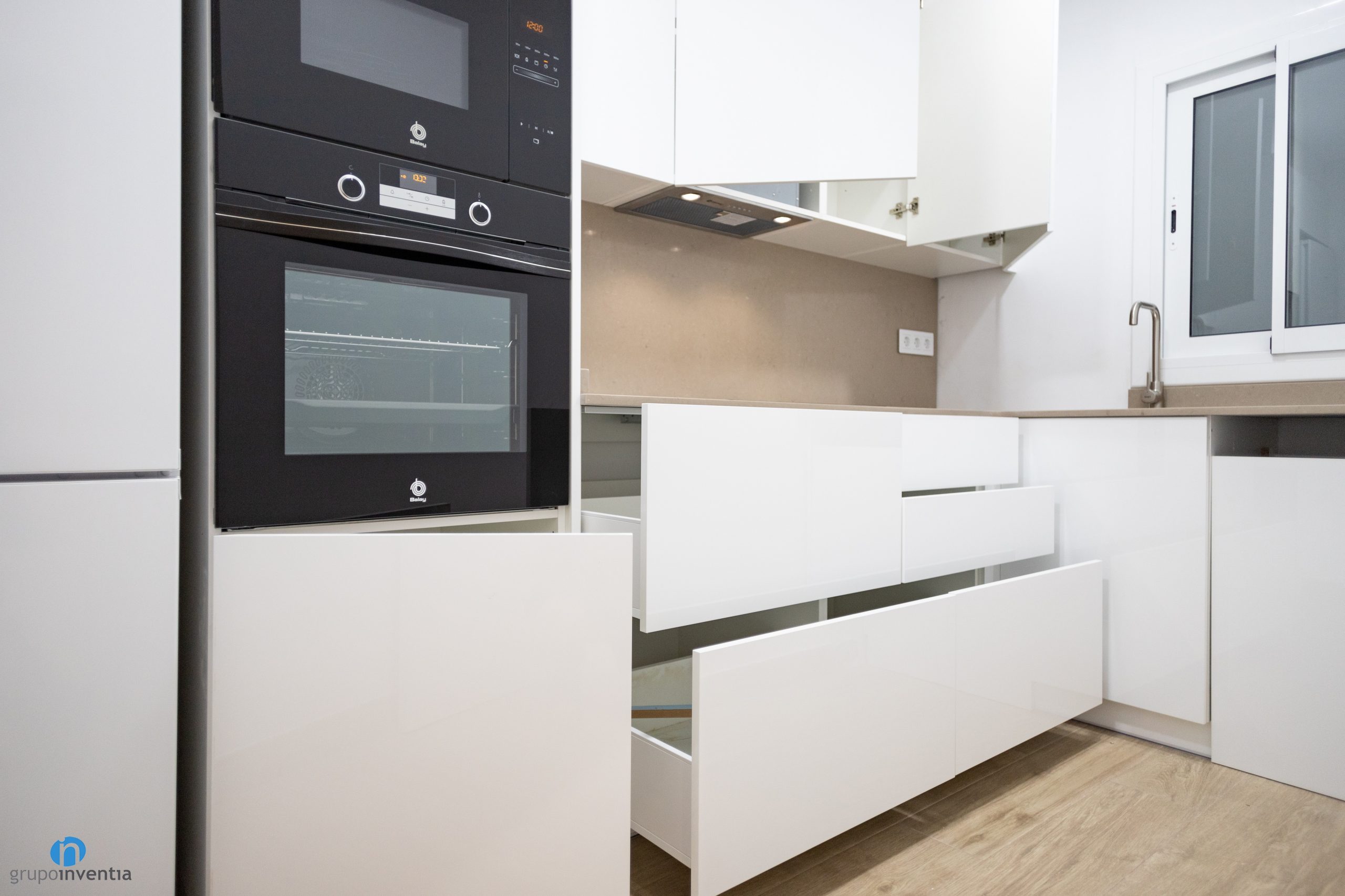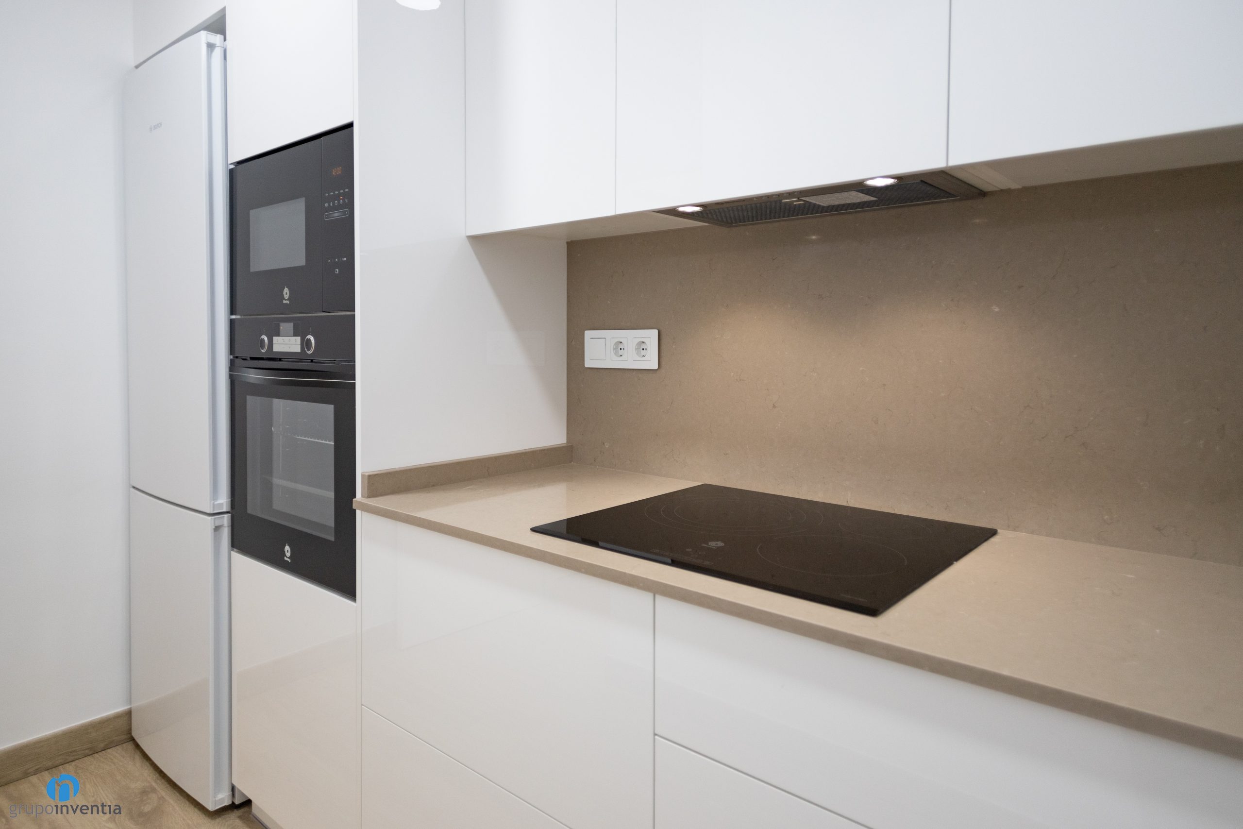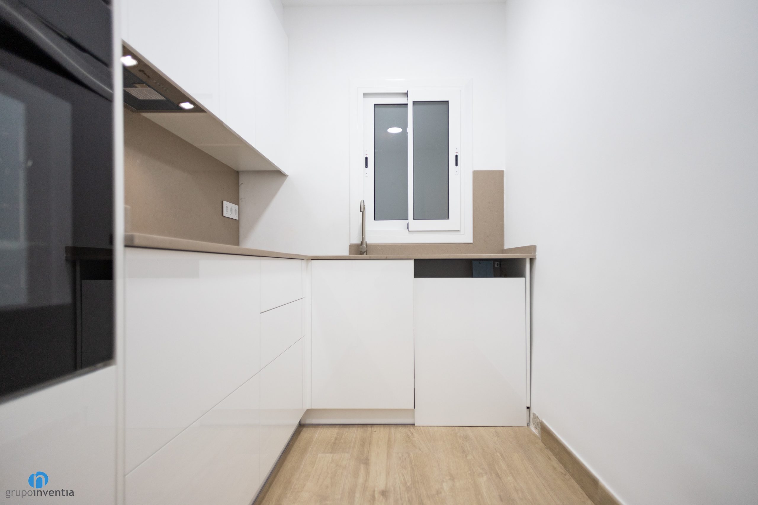 At the bottom of the kitchen is a second countertop equipped with a sink. The countertop also increases the support and work surface. All wrapped in white kitchen furniture and smooth panels that combine with beige countertops. For the new kitchen floor has been used the same as rooms such as the livingroom or bedrooms. A great imitation wood ceramic floor.