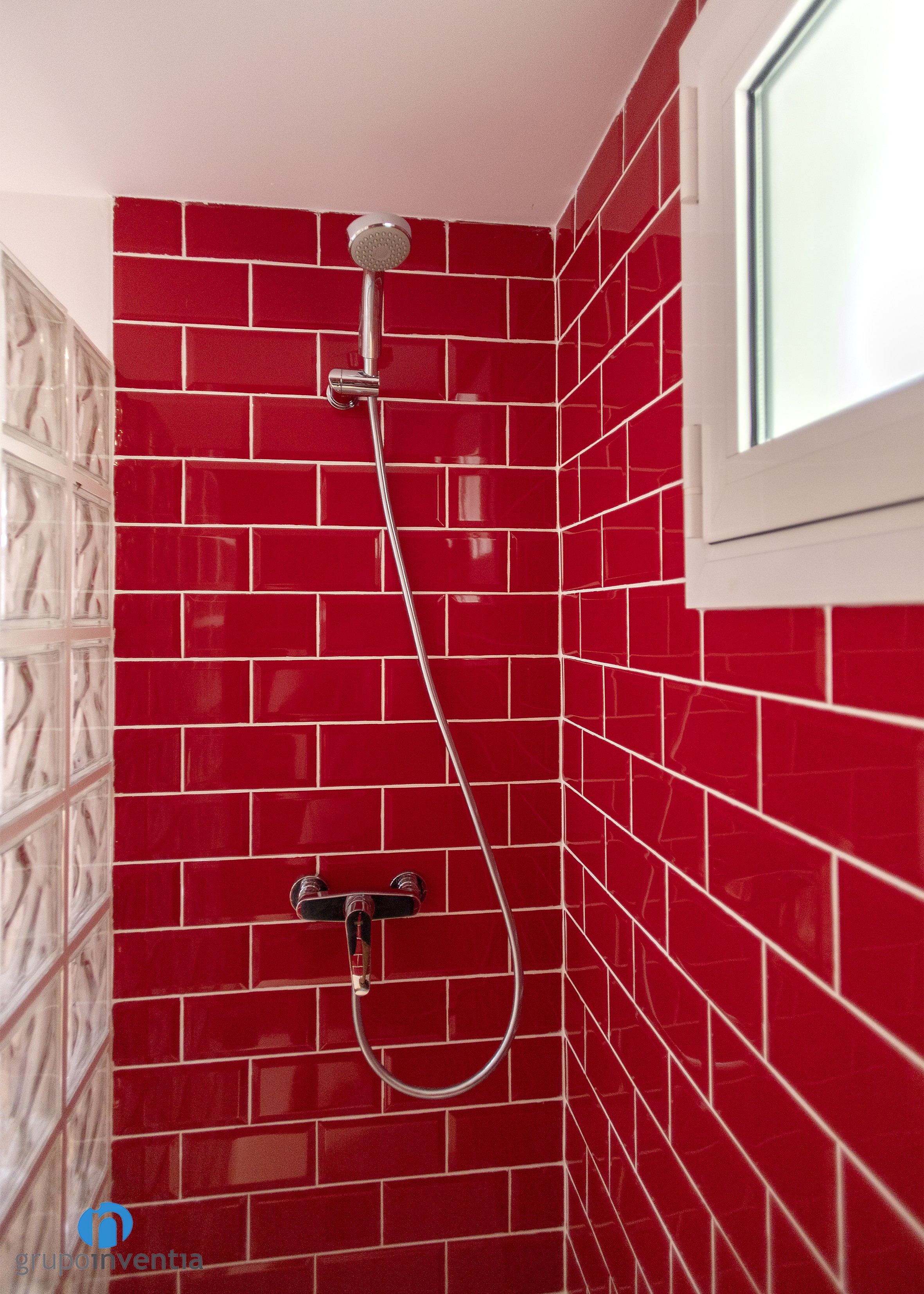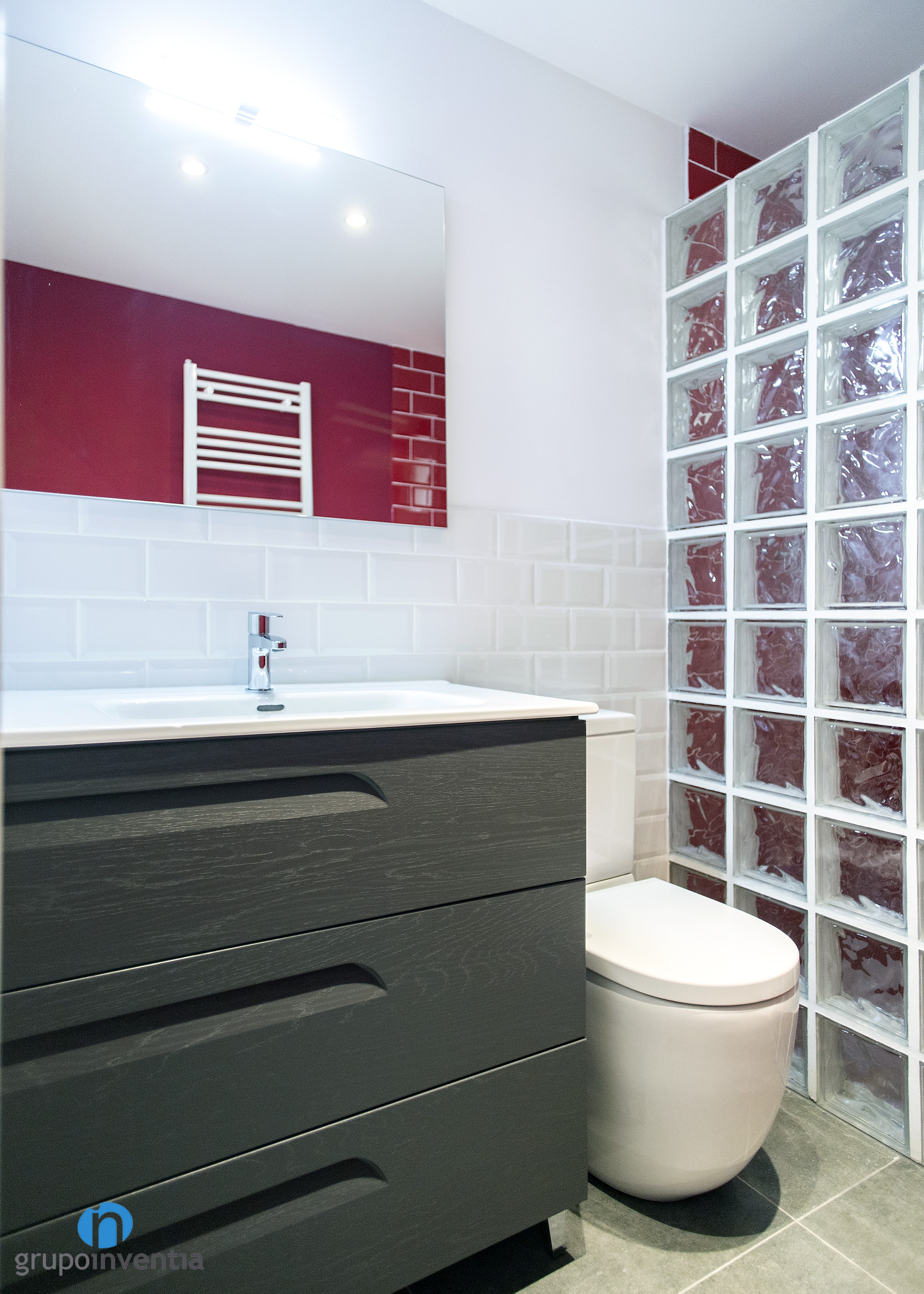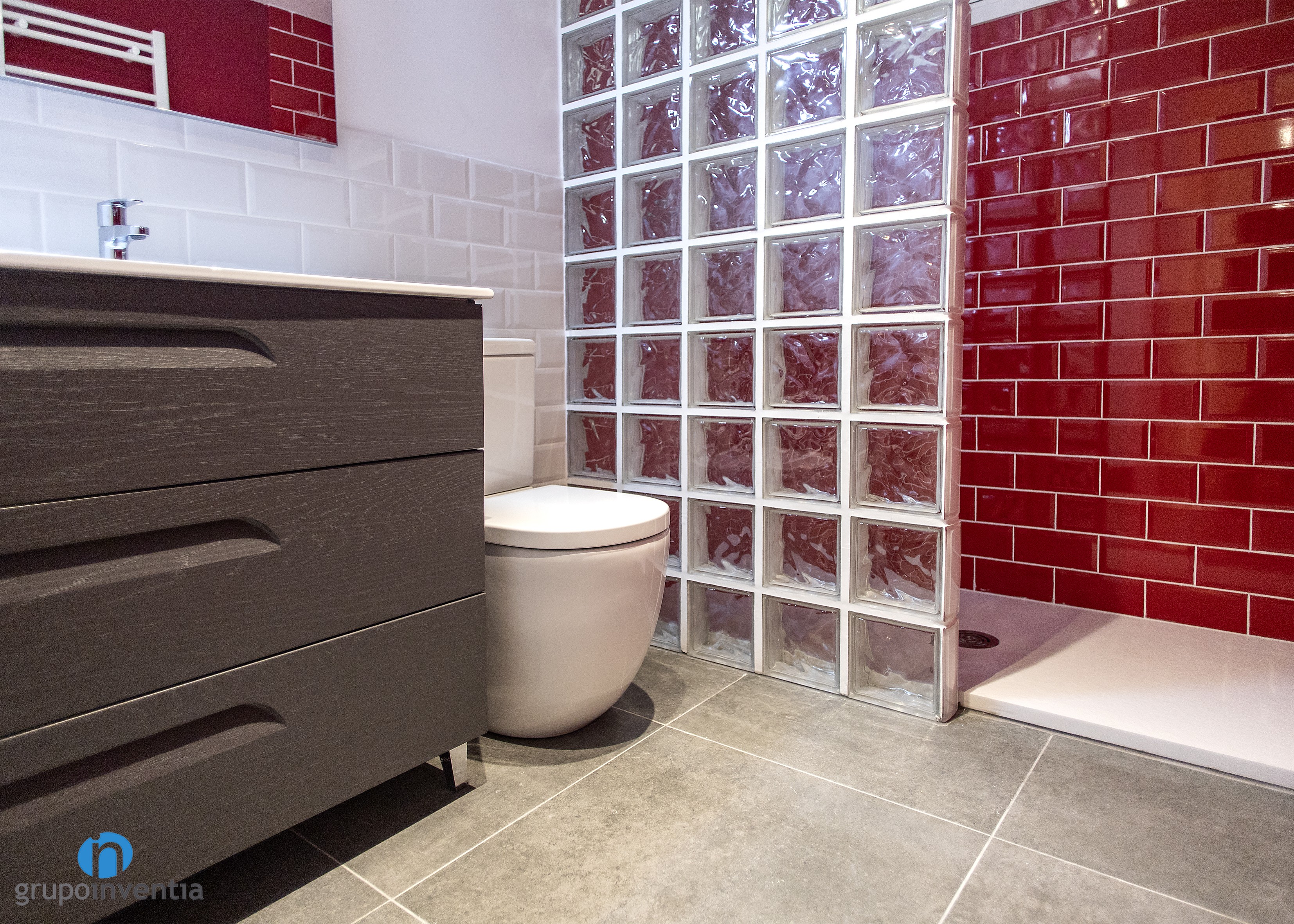 As for his new image, the wall on the left was tiled in medium height with white beveled tiles and the rest of the wall was painted the same color until it reached the ceiling. On the right wall the same process was done but using tiles and red paint. Red beveled tiles extend to the shower wall.