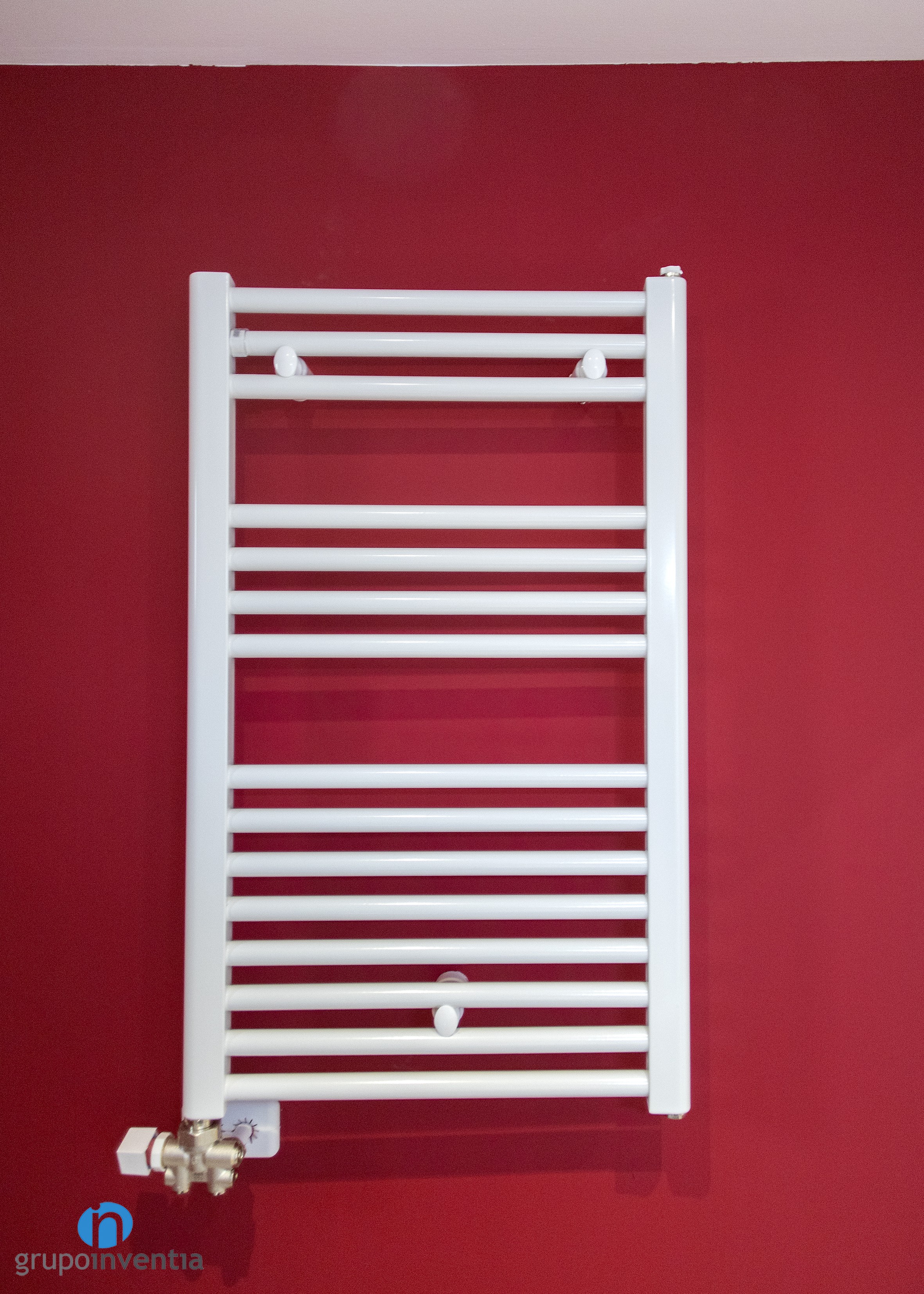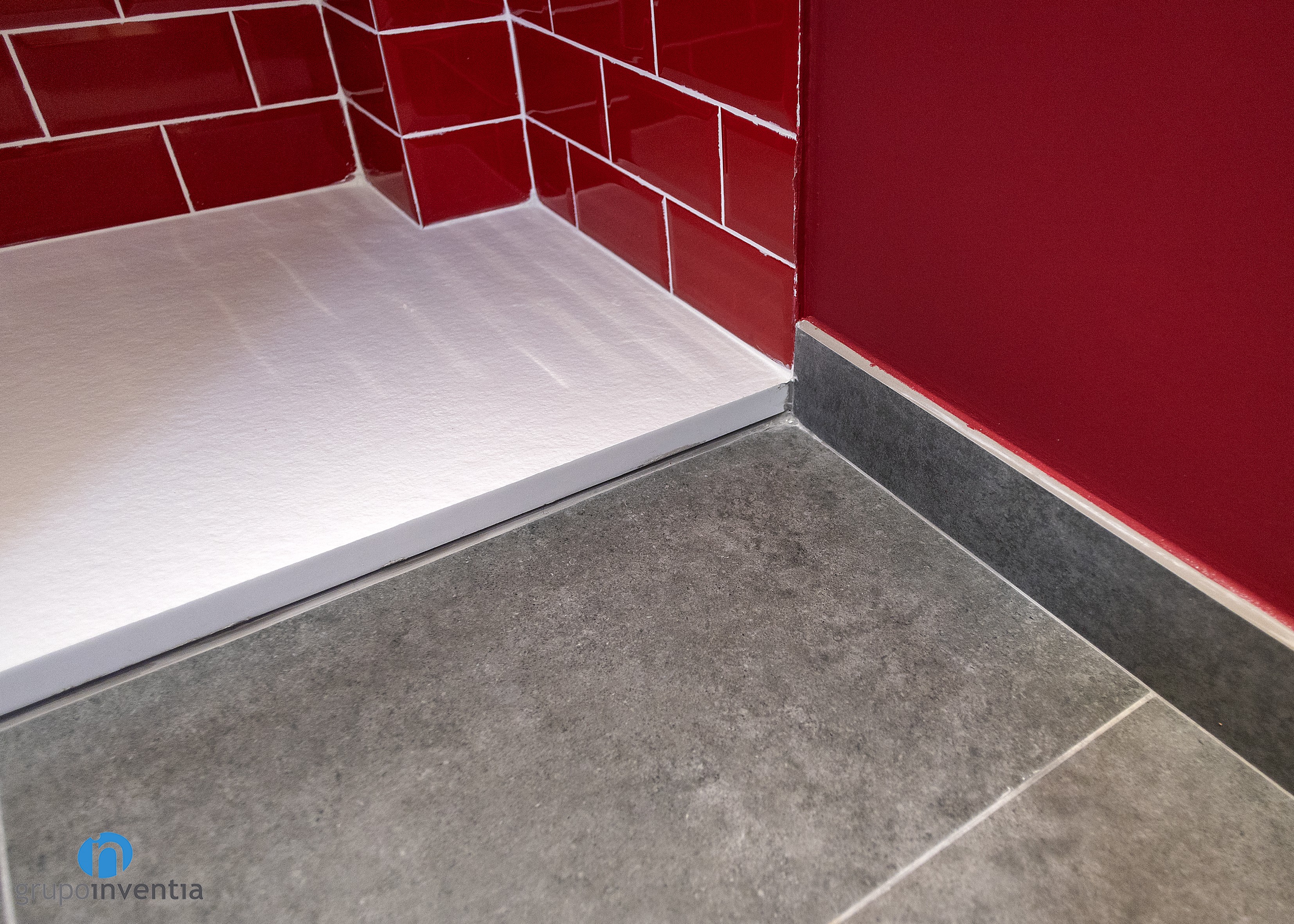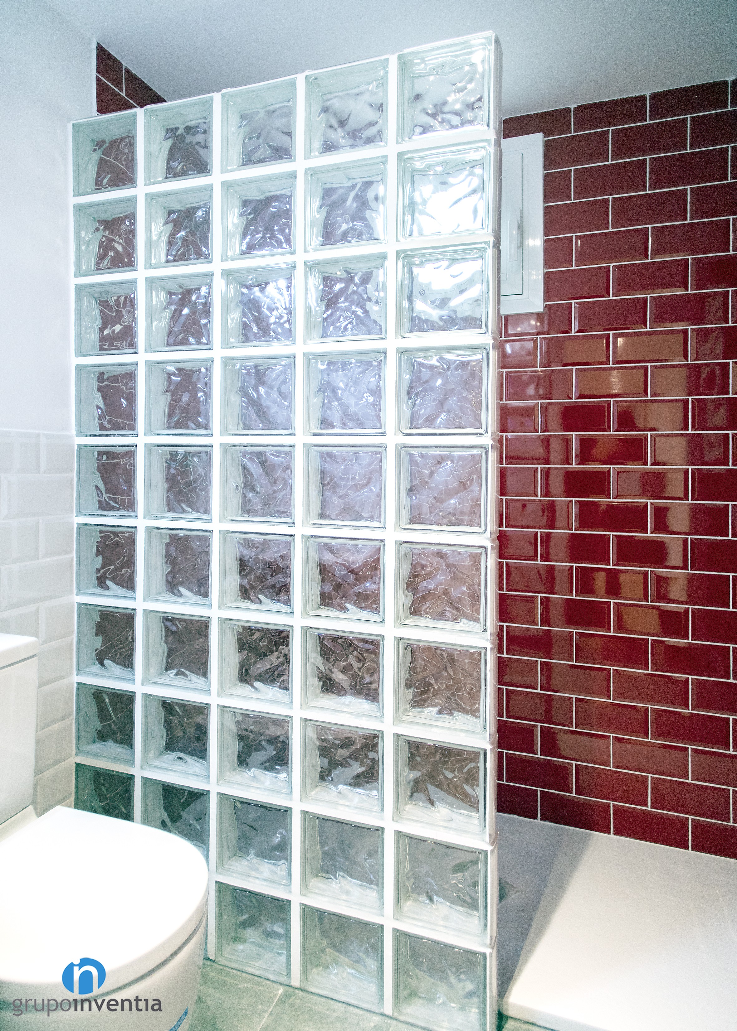 As for his new image, the wall on the left was tiled in medium height with white beveled tiles and the rest of the wall was painted the same color until it reached the ceiling. On the right wall the same process was done but using tiles and red paint. Red beveled tiles extend to the shower wall.