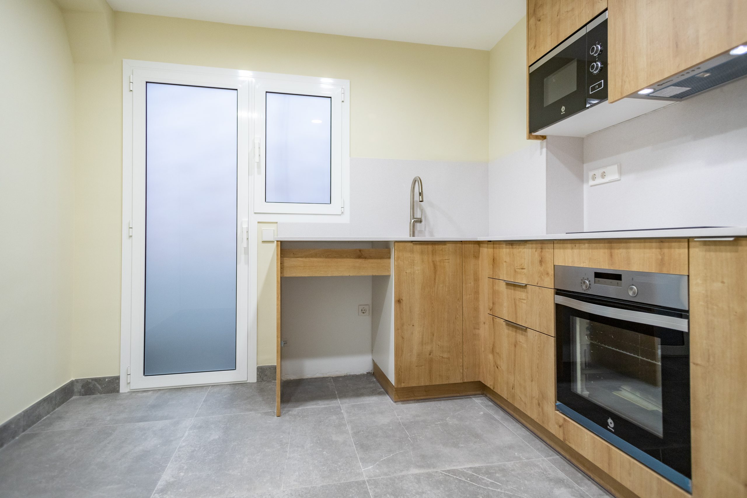 The kitchen occupies its own independent space which is accessed through a sliding door. From the beginning, this is a great improvement, as it makes the most of the kitchen space. It is a large space in which an L-shaped main kitchen cabinet has been placed.