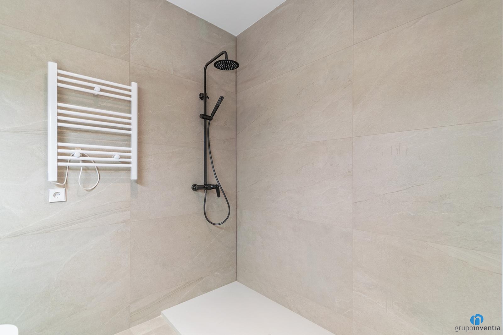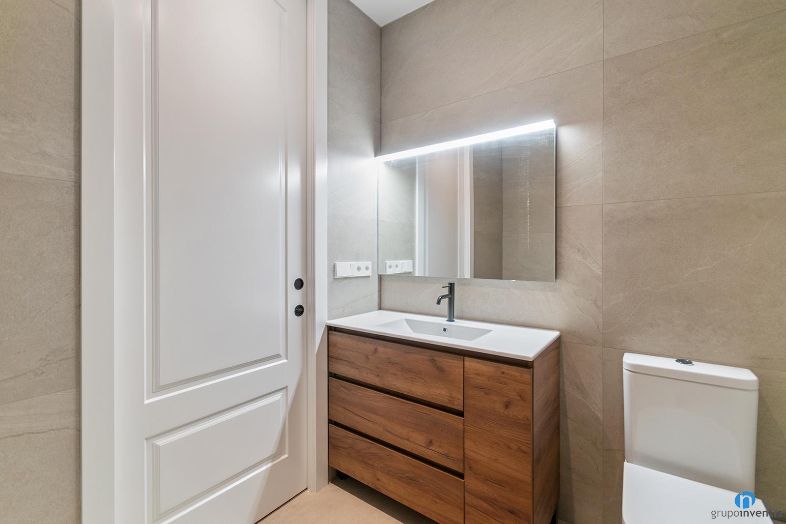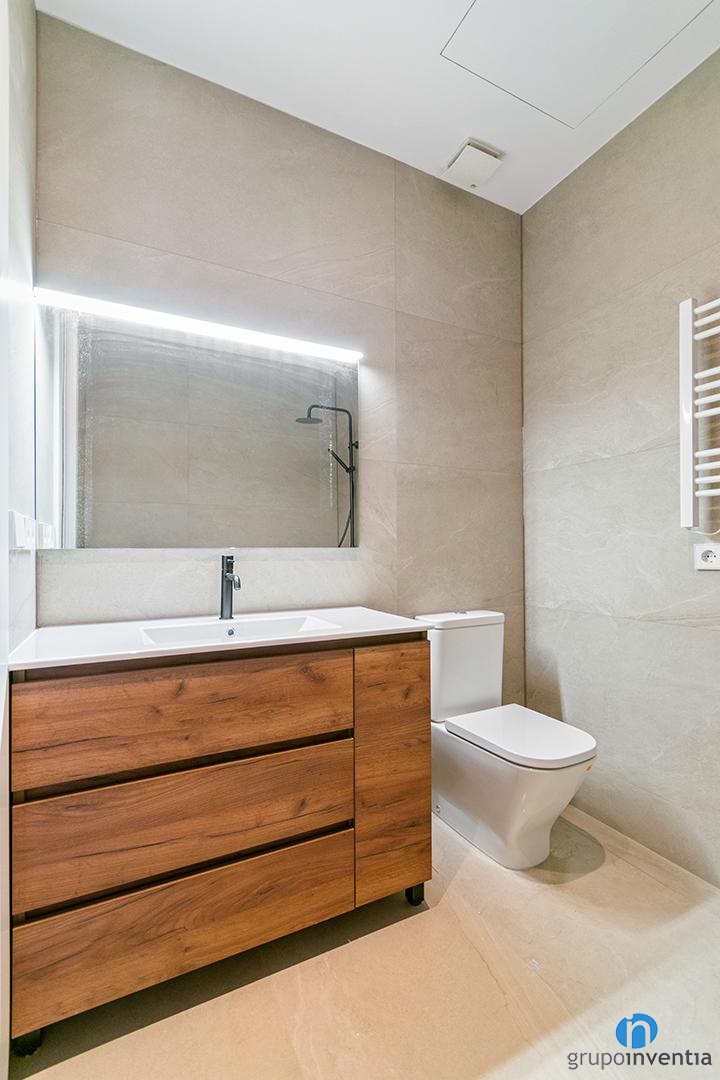 Walls are covered with beige tiles that reflect light. This enhances the sense of space. Wooden furniture adds warmth. The contrast between neutral tones and wood creates a cozy atmosphere. Lighting enhances clarity. This bathroom renovation in Barcelona delivers comfort and style.
