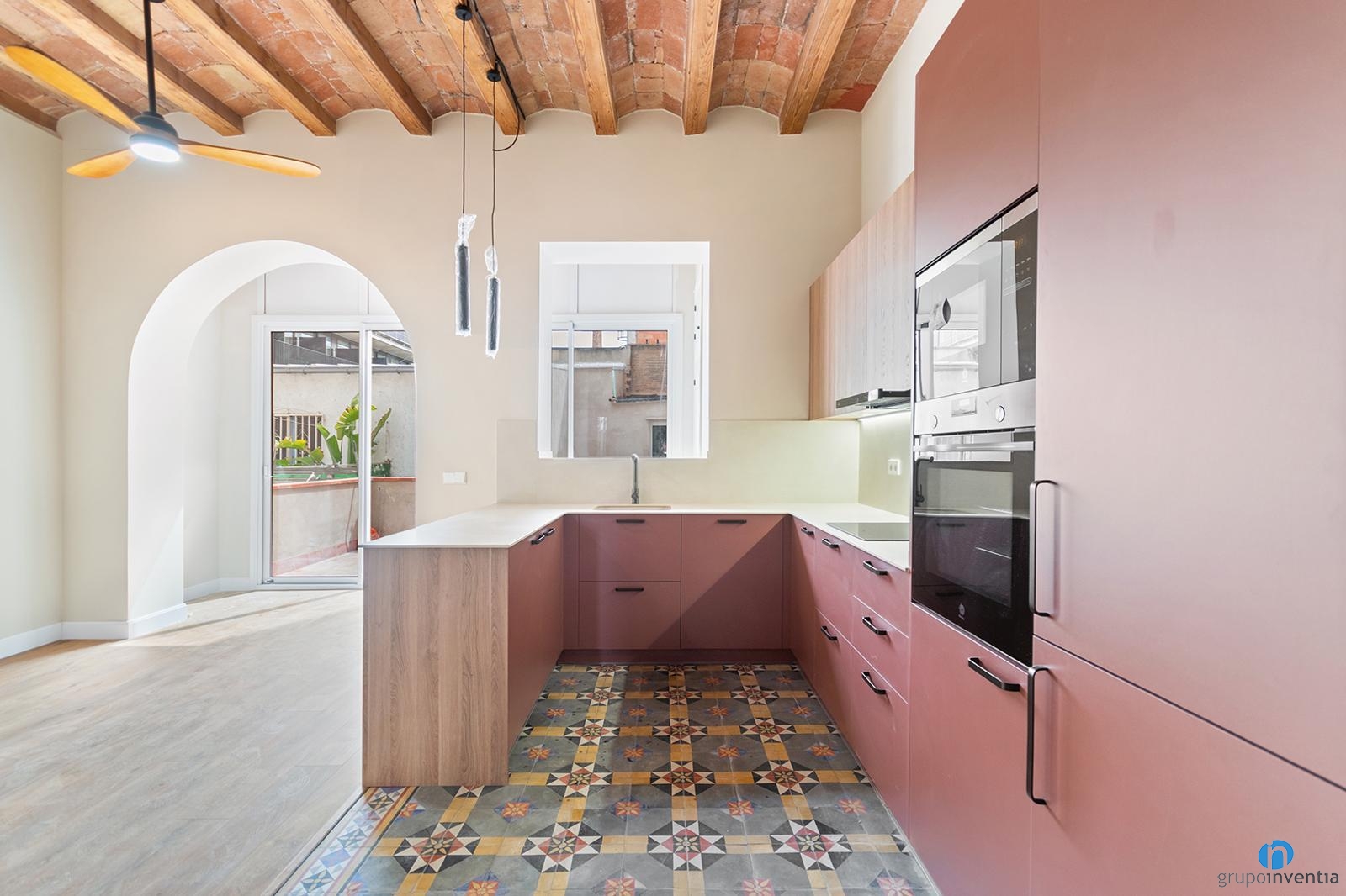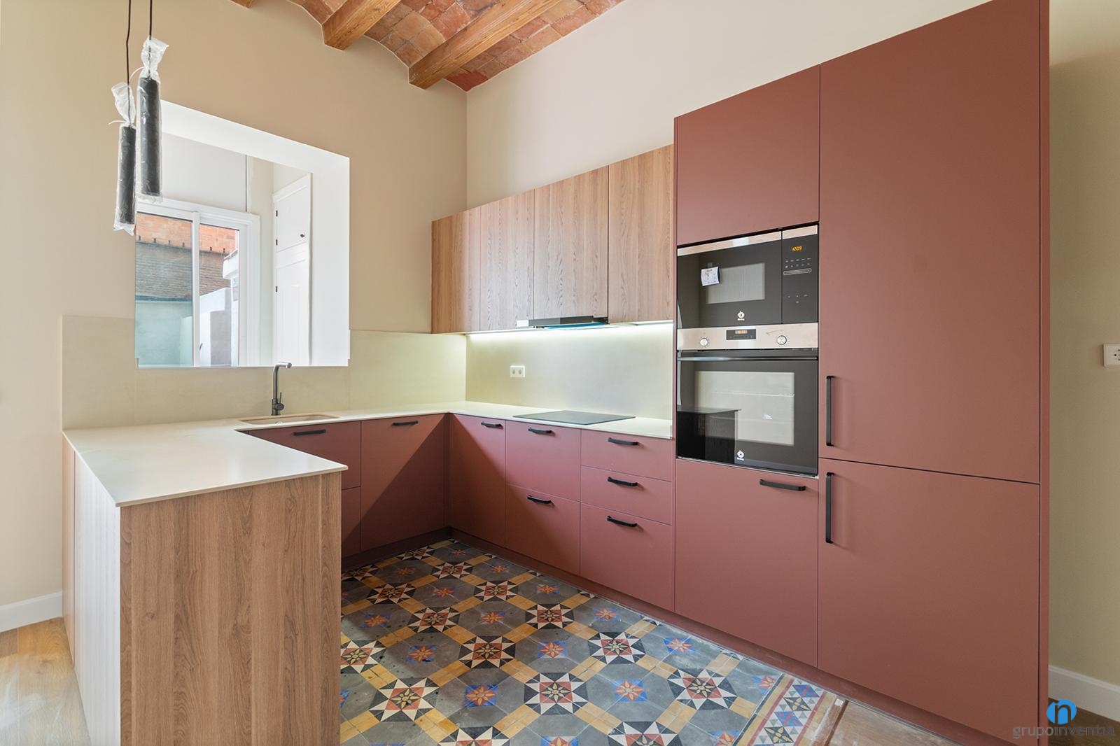 Hydraulic flooring adds character and the exposed brick ceiling is preserved. This full renovation in Barcelona creates a warm and modern kitchen.