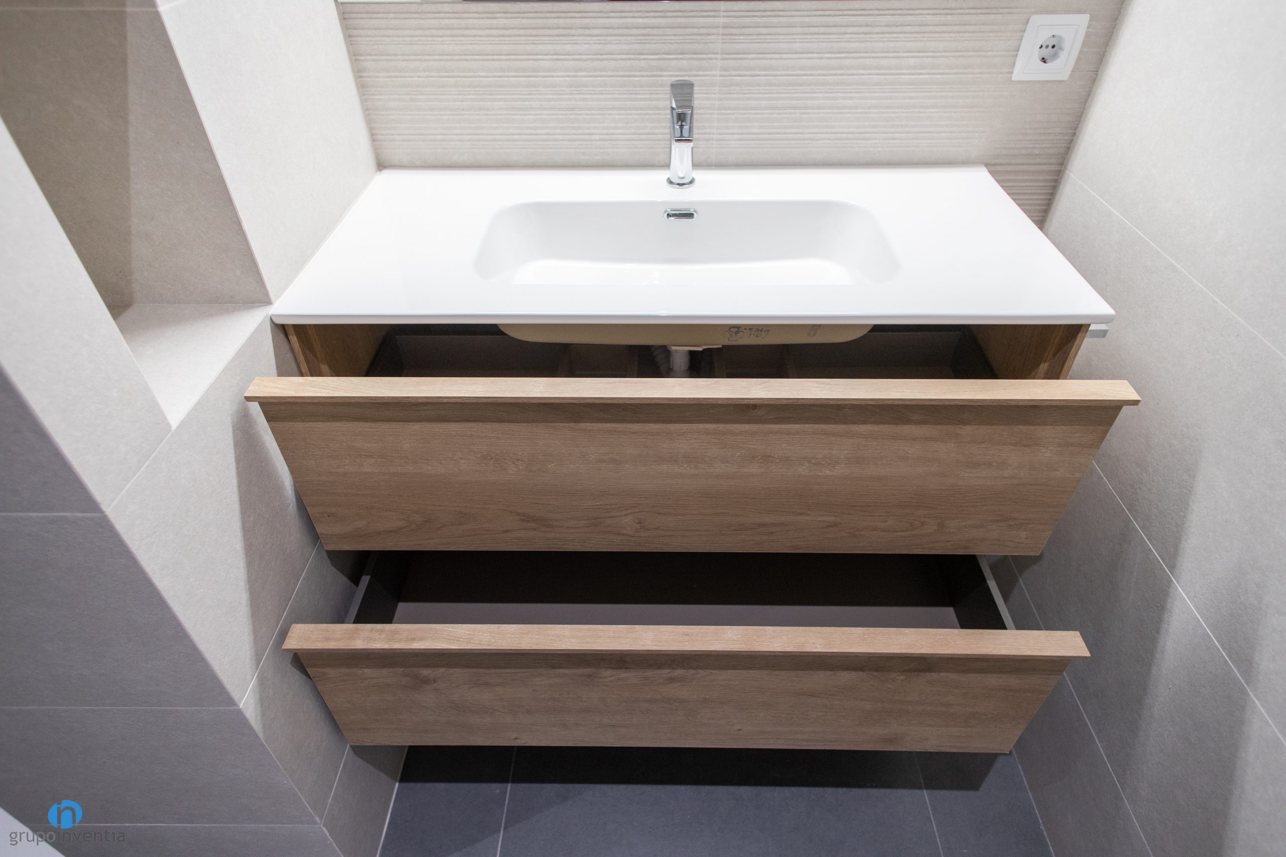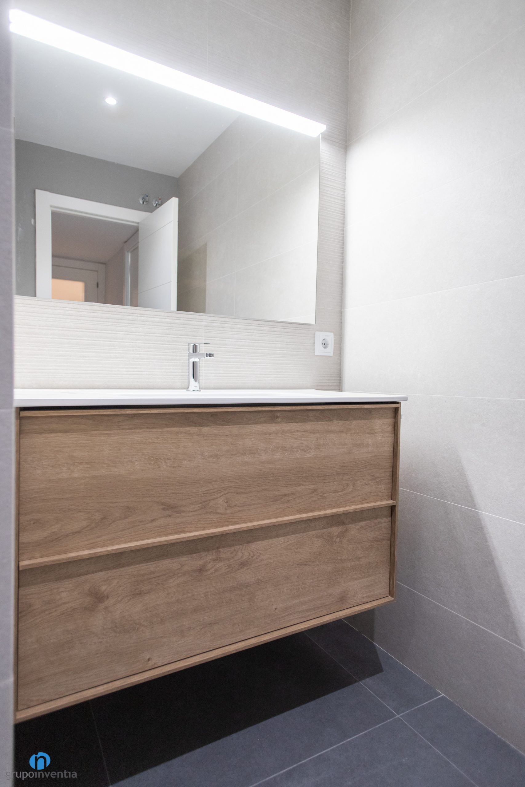 In this work of house renovation in Barcelona, two bathrooms have been completely renovated. Now both look modern and through a tile with beige tiles have achieved fresh and pleasant spaces. For the new pavement, gray tiles have been chosen and wooden finishes with bathroom furniture have also been introduced.