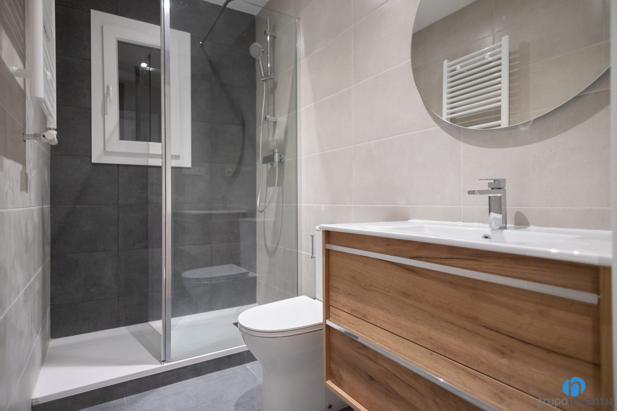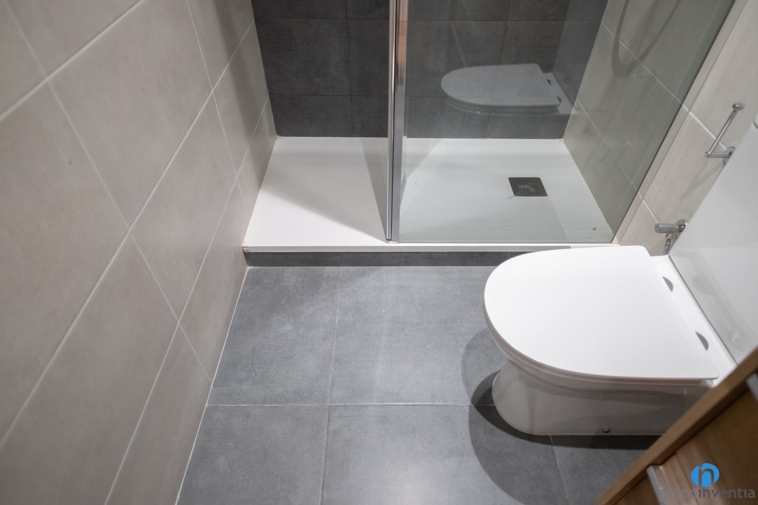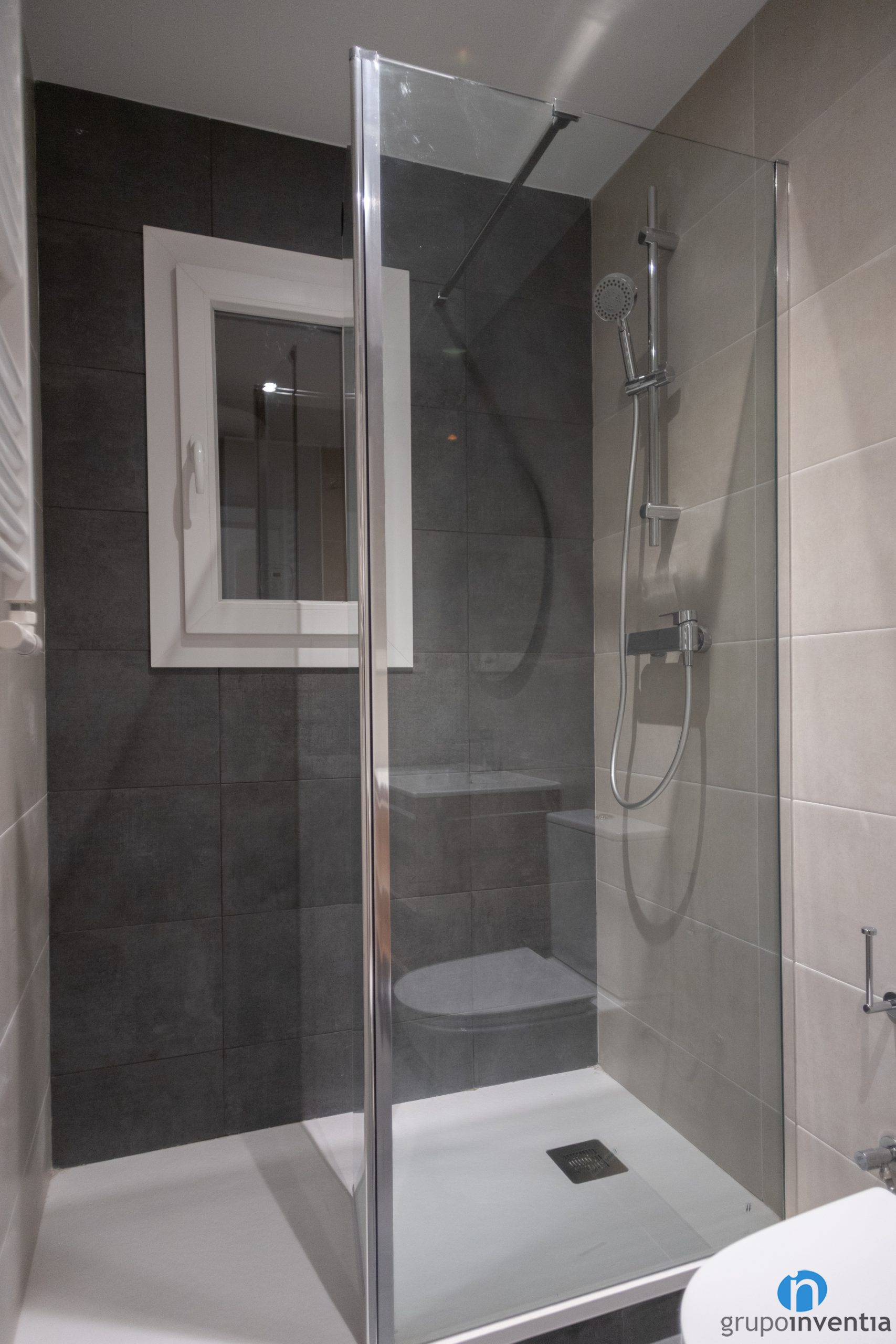 For the water area, a shower tray protected with sliding door screens has been chosen. This avoids uncomfortable splashes to the rest of the bathroom. All this in a space with white tiled walls and a new gray floor. In general, a modern bathroom with a most pleasant atmosphere.