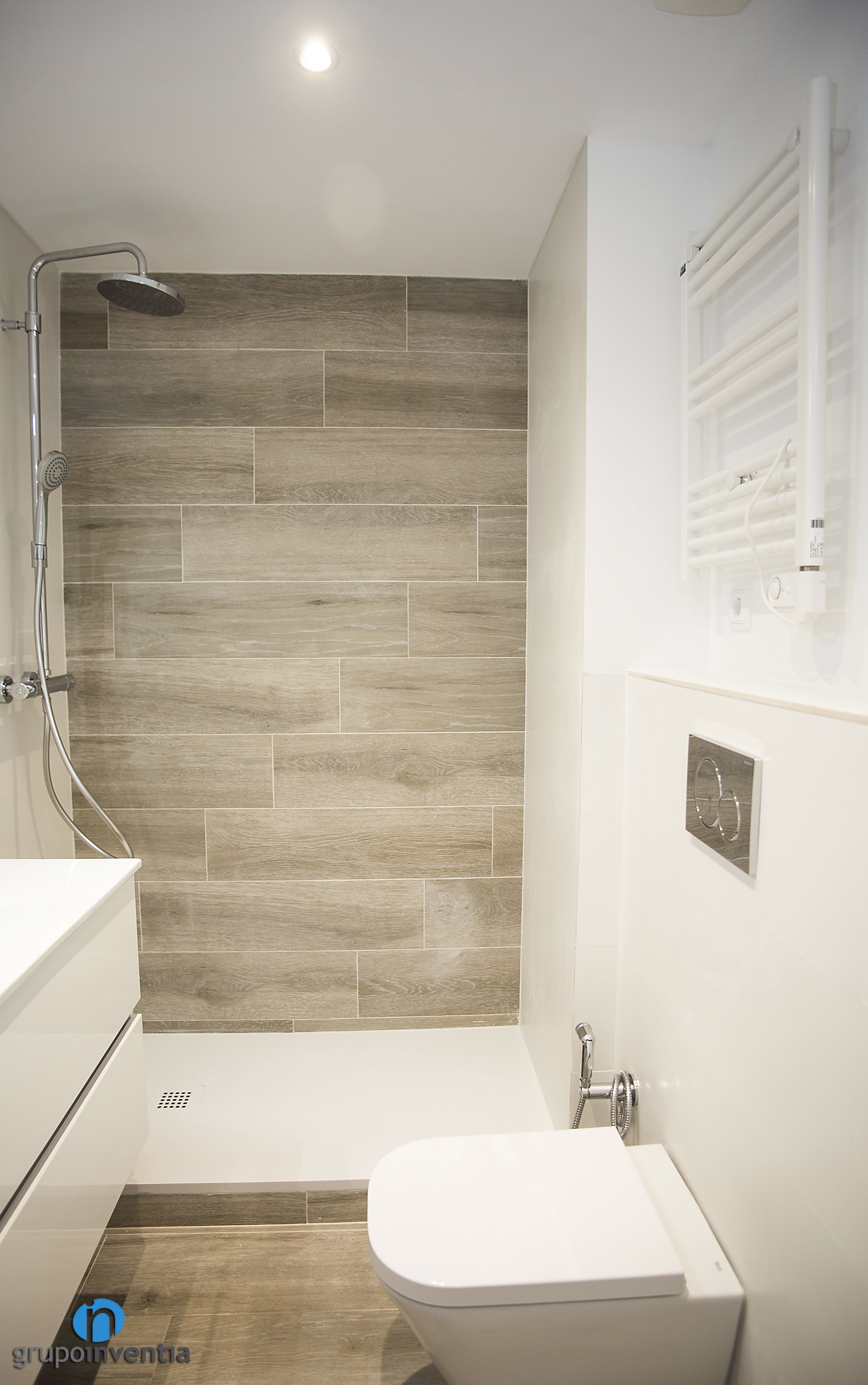 After its renovation, the bathroom looks great. The walls were tiled in medium height with beige tiles and the rest was painted white. In addition, tiles that mimic wood were used both on the pavement and on the shower wall.