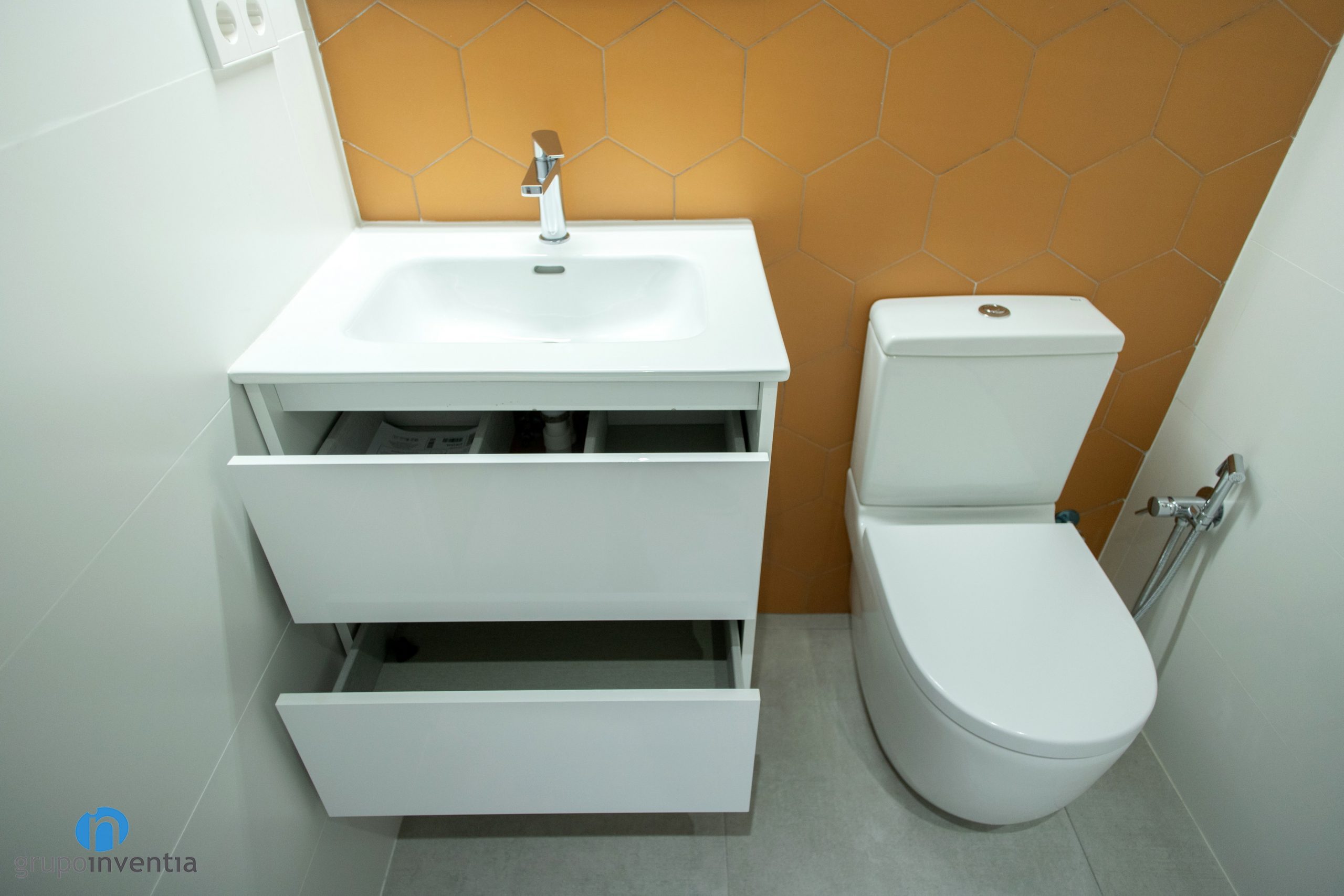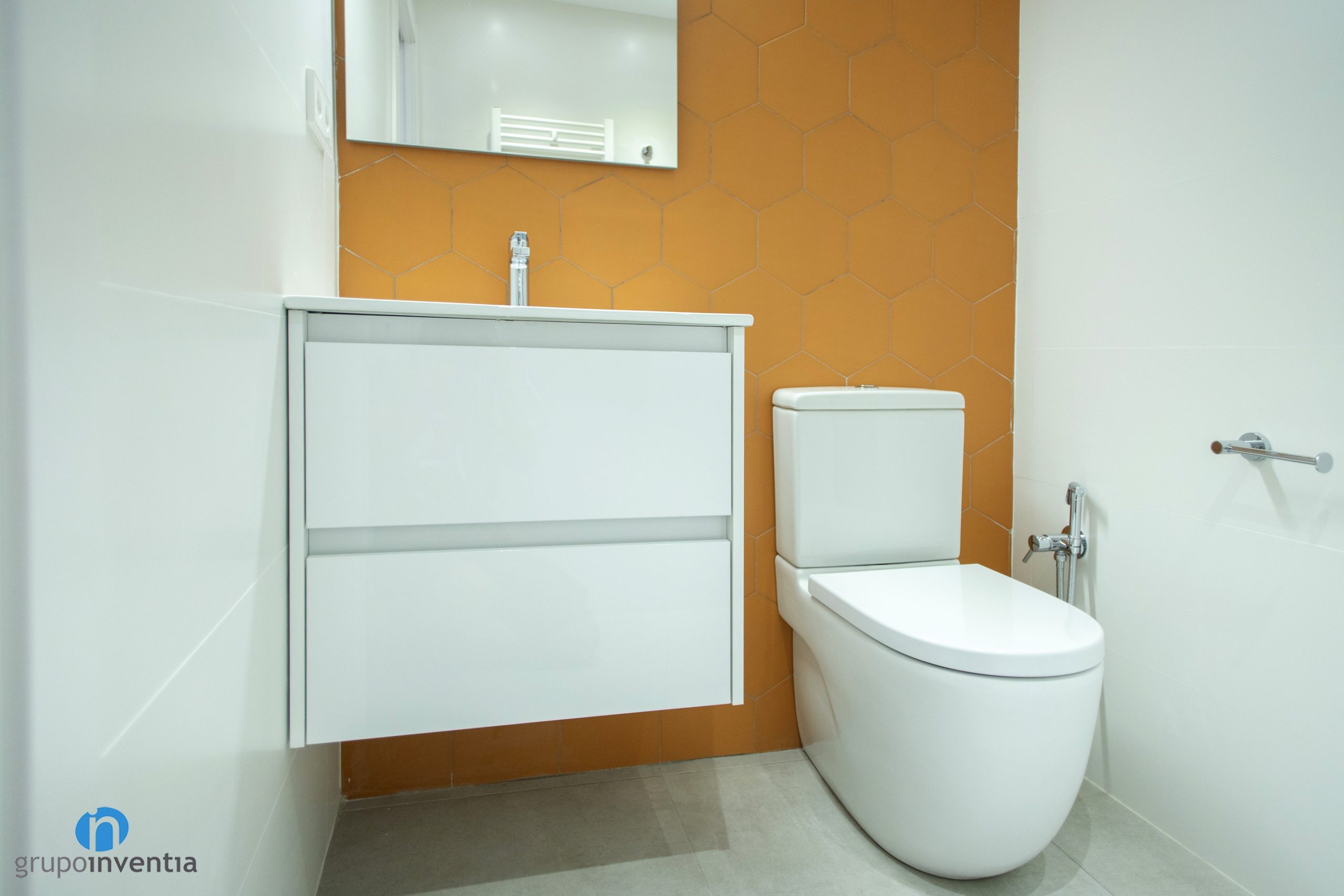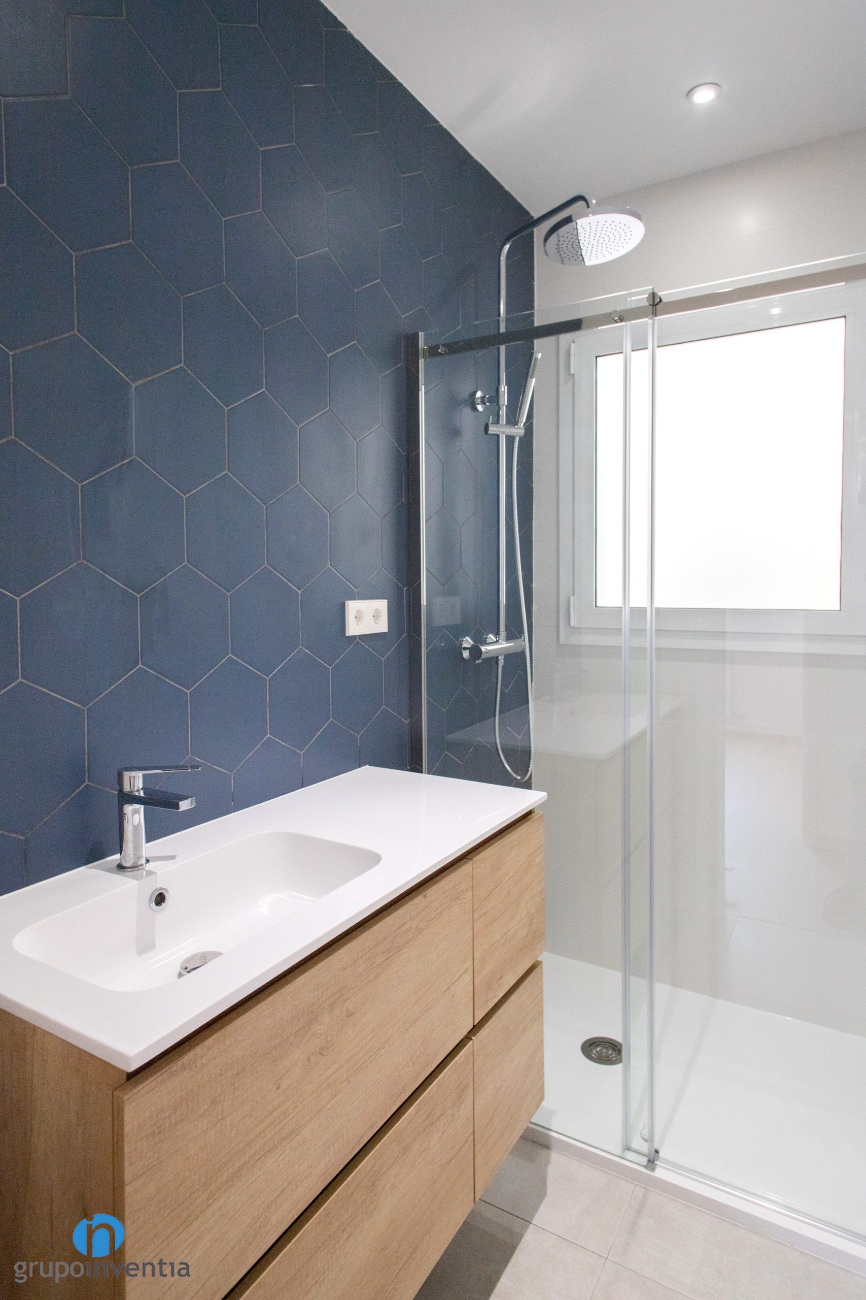 The walls have been completely tiled. One difference between the two is that a different color has been used to tile the sink wall. In the main bathroom, hexagonal blue tiles have been chosen. In the bathroom they are the same shape, although orange. A gray stoneware floor has been chosen for the new pavement. A perfect combination of image and practicality.