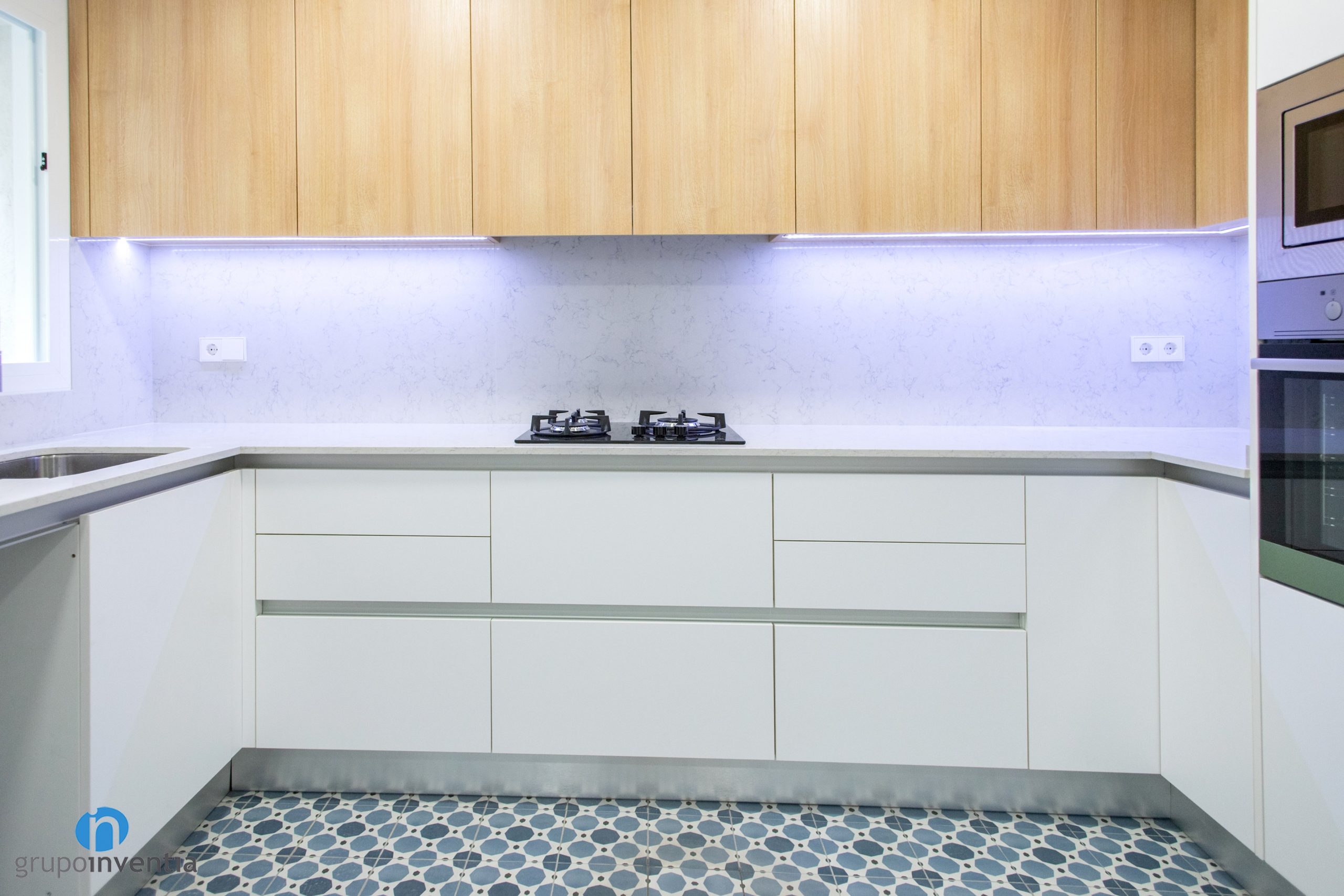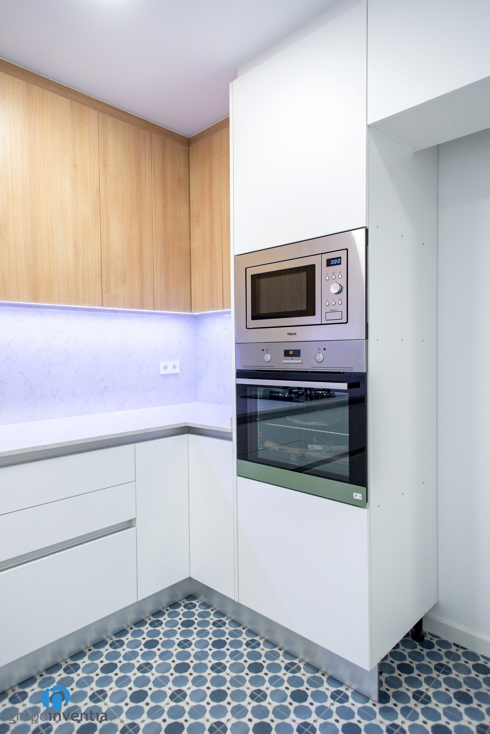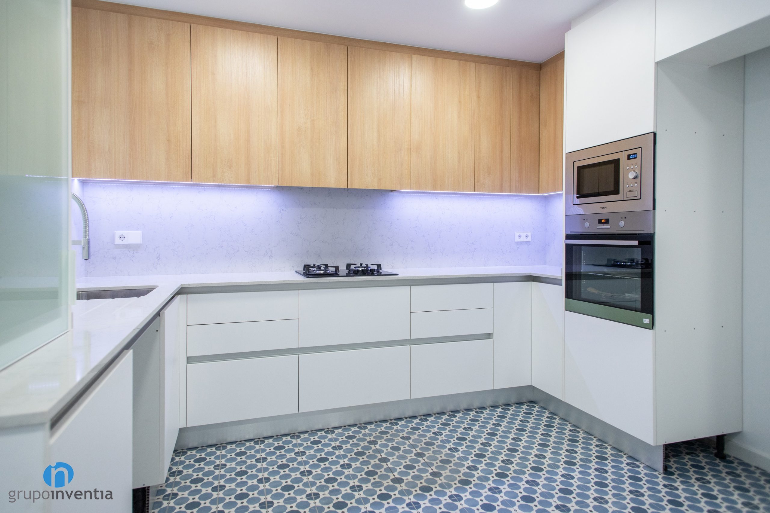The kitchen is located in its own room and is distributed in a U-shape. Like the other rooms of this house renovation, the kitchen is spacious and with the new layout have achieved perfect functionality and mobility. In turn it has a lot of storage capacity. It is provided by white kitchen furniture at the bottom and wood finishes at the top.