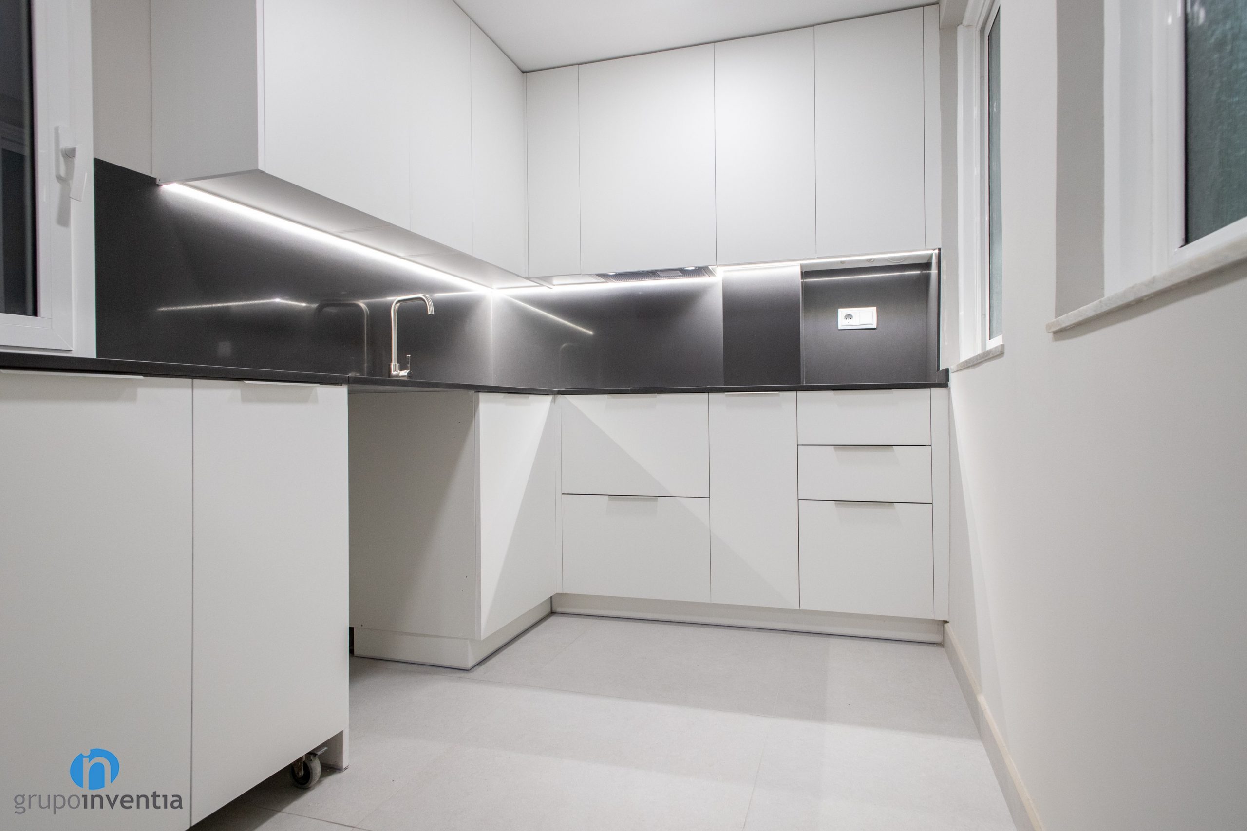 Another great improvement of the renovation in this kitchen is the expansion of storage capacity. The kitchen furniture is white and is present in both the lower and upper countertops. The support surfaces are gray. This is a very successful color combination that prints a very current image in this kitchen renovation.