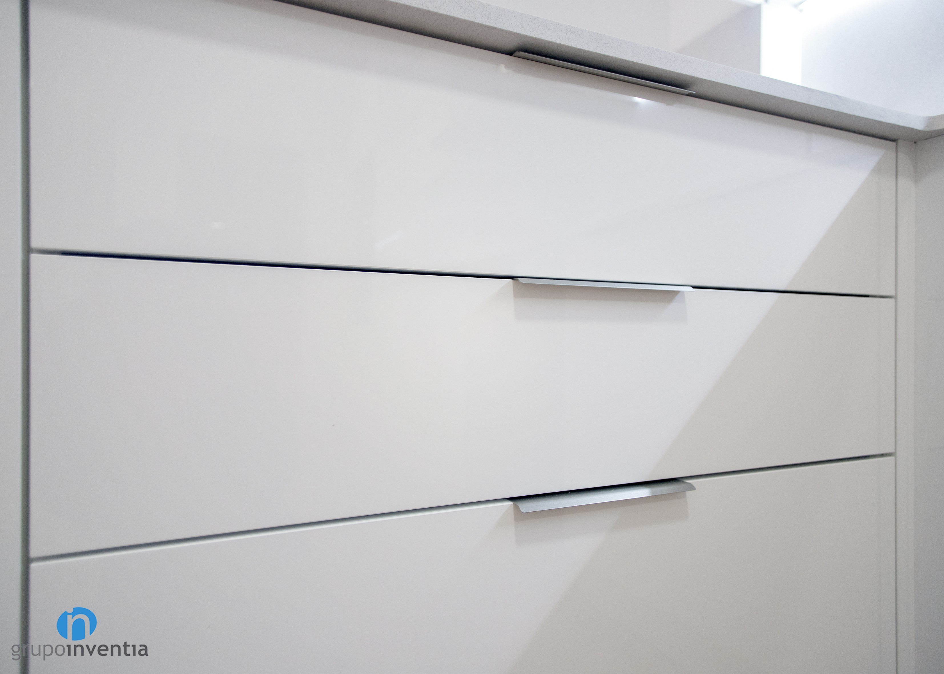 This twist to the left to make way for a second section of counter that extends the surface of support and that also works like kitchen bar. Another of the novelties in this kitchen renovation is that it has drawers and cabinets for storage in the lower and upper parts of the kitchen counter.