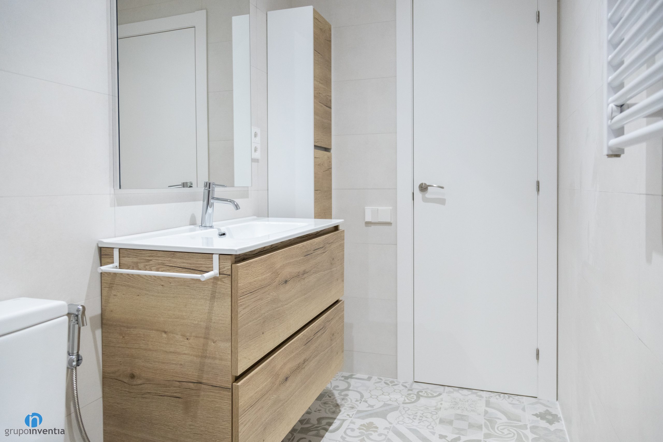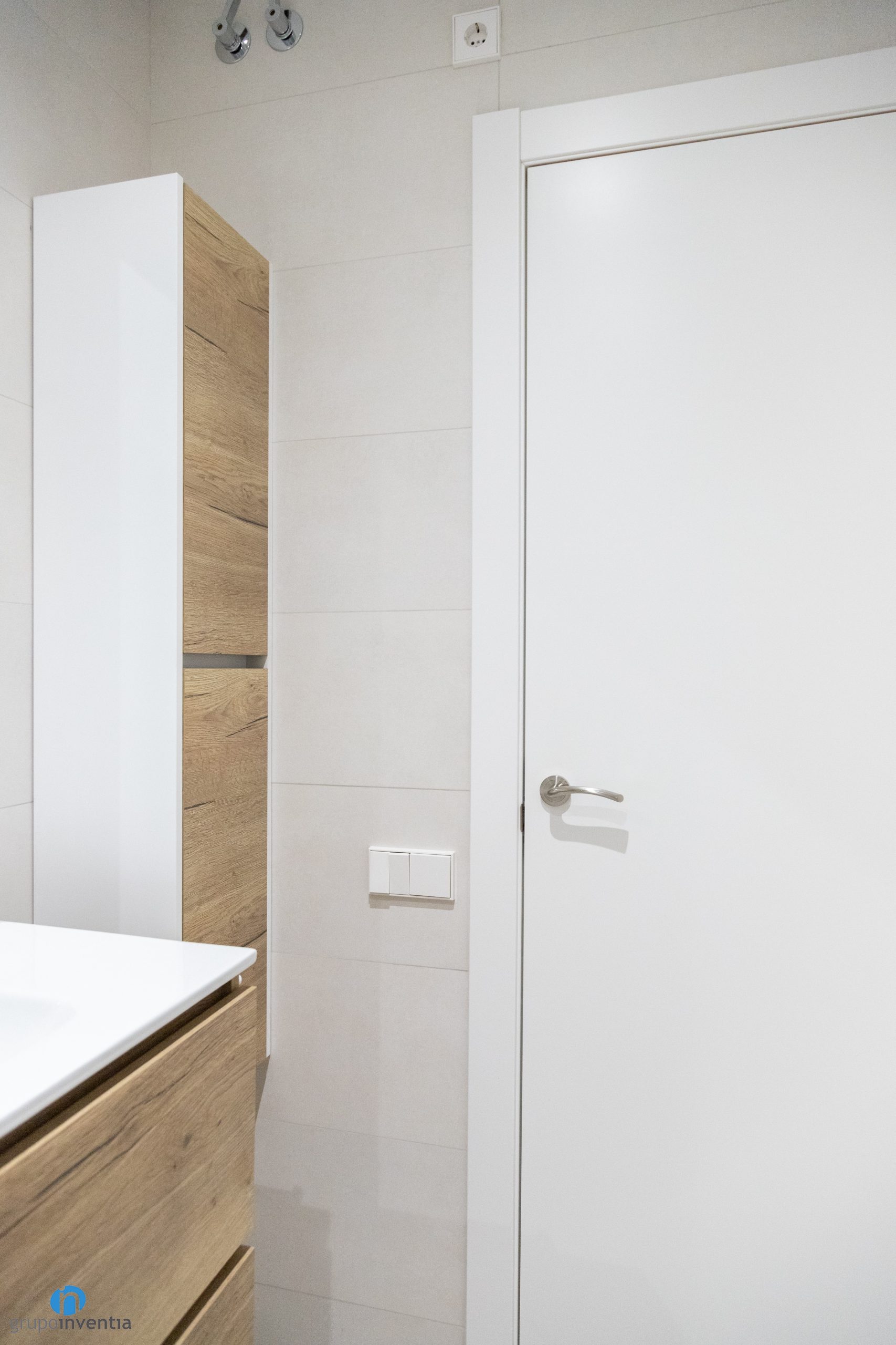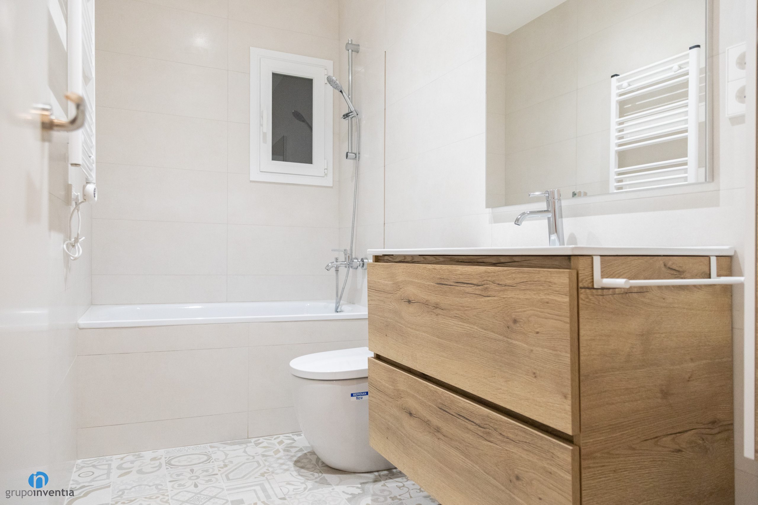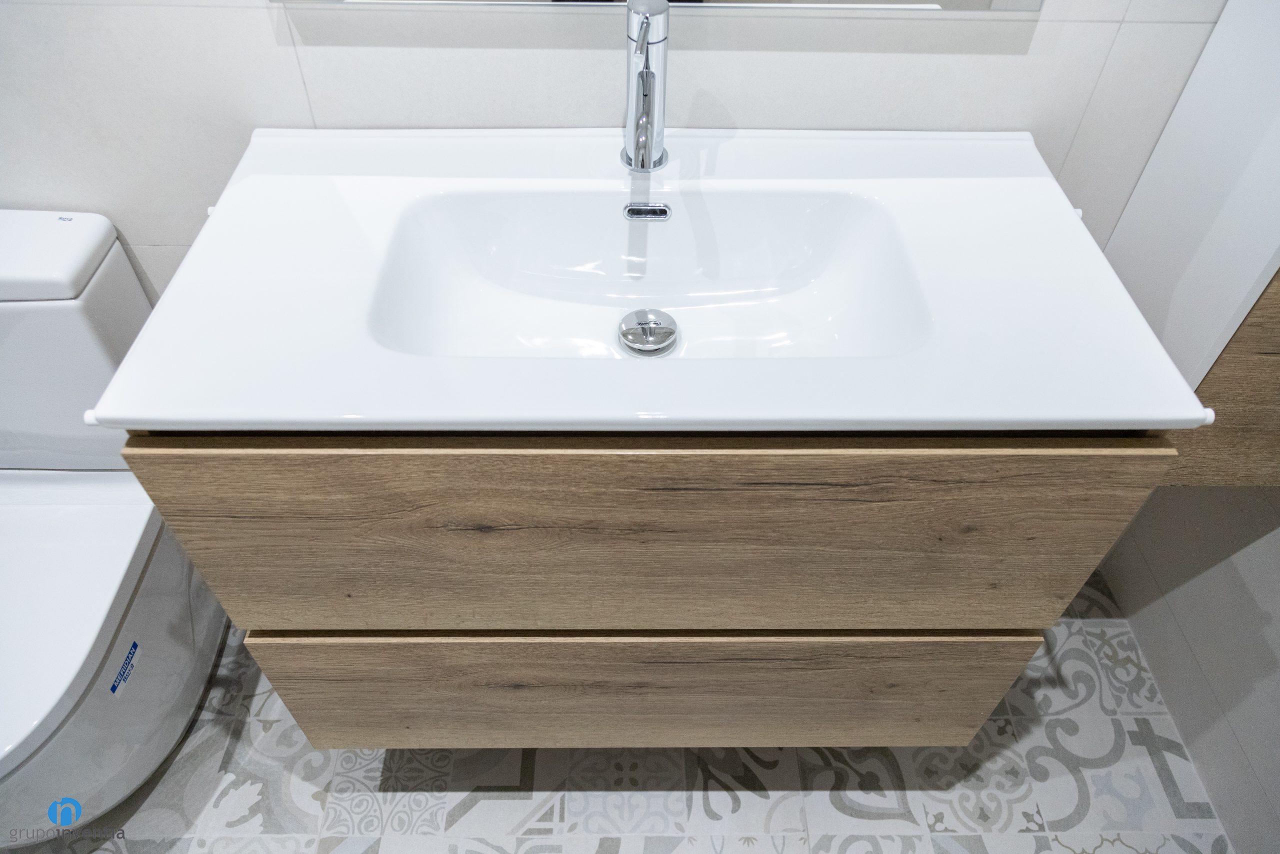 One of the aspects that has changed in this bathroom renovation is the sanitary equipment. It now has a new sink with built-in storage furniture, a toilet and a water area consisting of a bathtub. These are modern and highly functional toilets designed to last for many years.