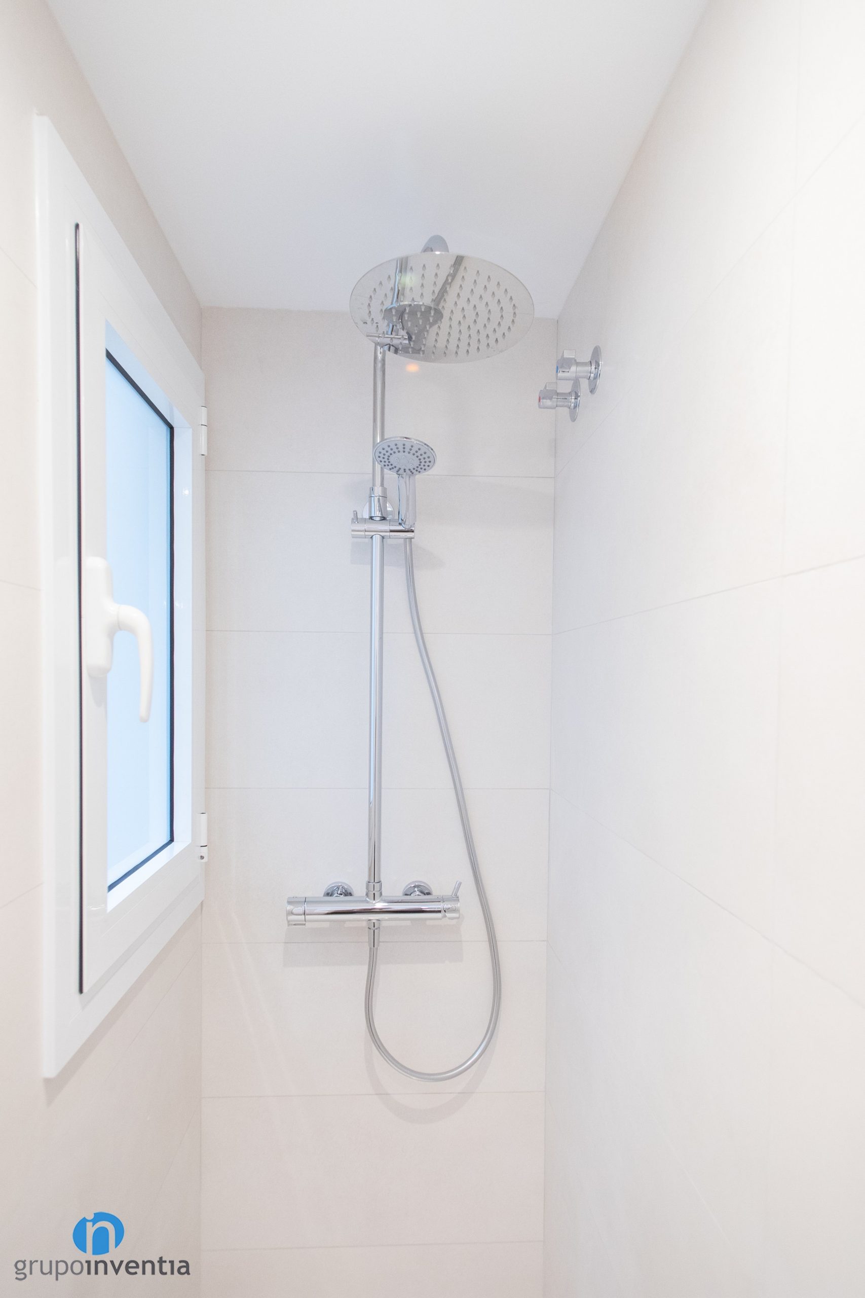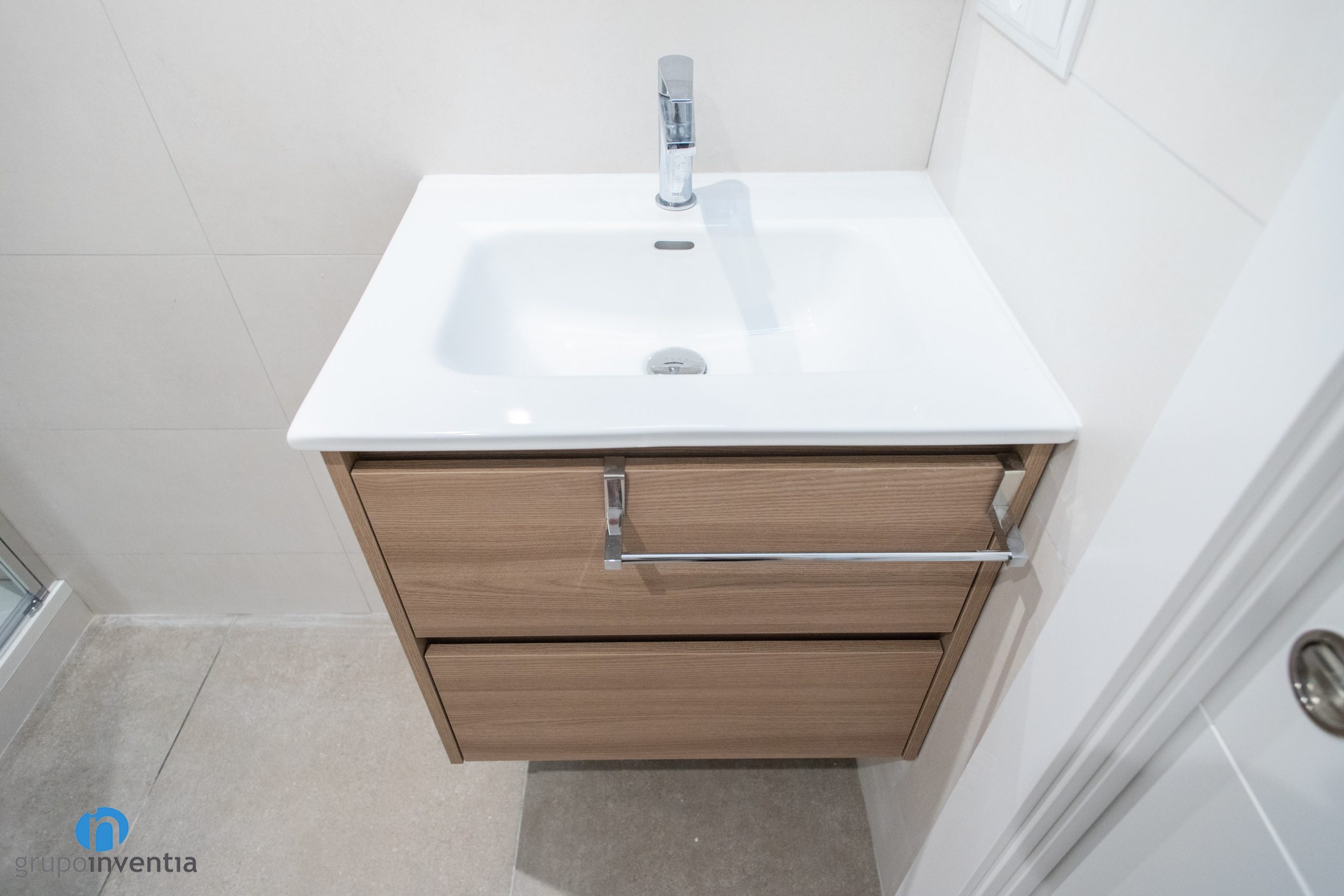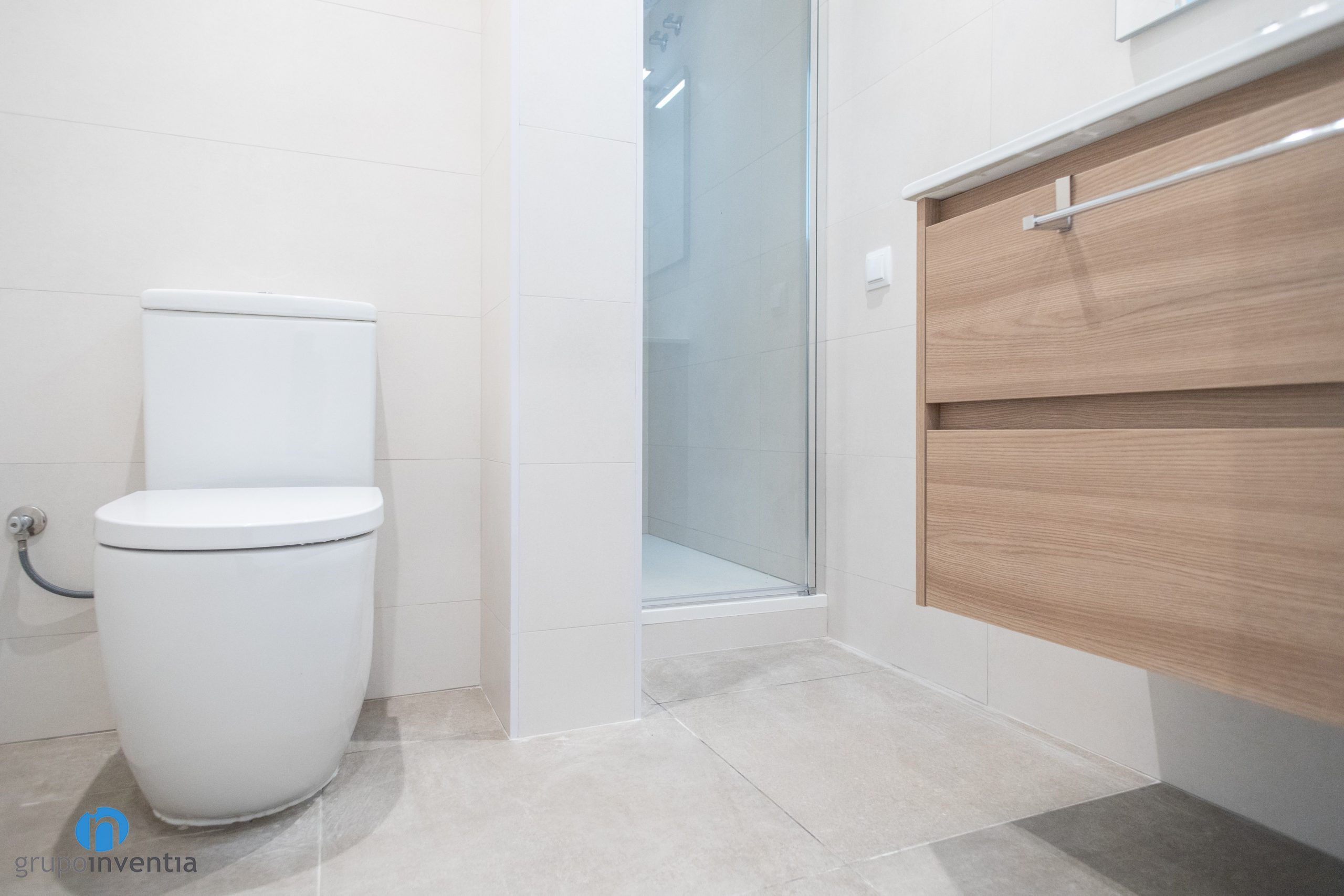 The three-piece sanitary equipment has also been renovated. Has a large sink with built-in storage furniture. In this way it is very easy to maintain order and organize all kinds of hygiene products. A new toilet has also been placed with the cistern on the back. At the back of the room is a shower that is protected by a transparent screen.