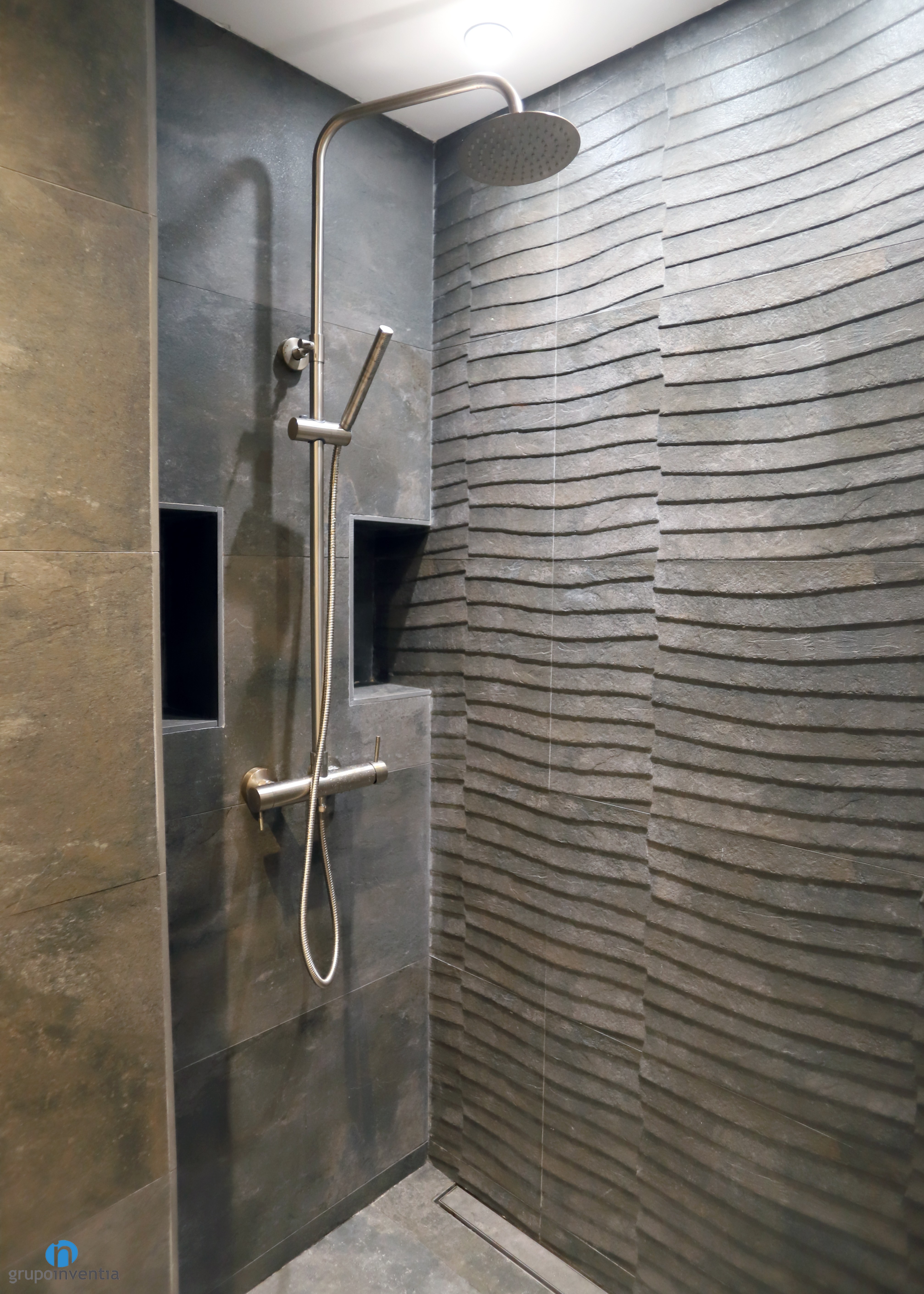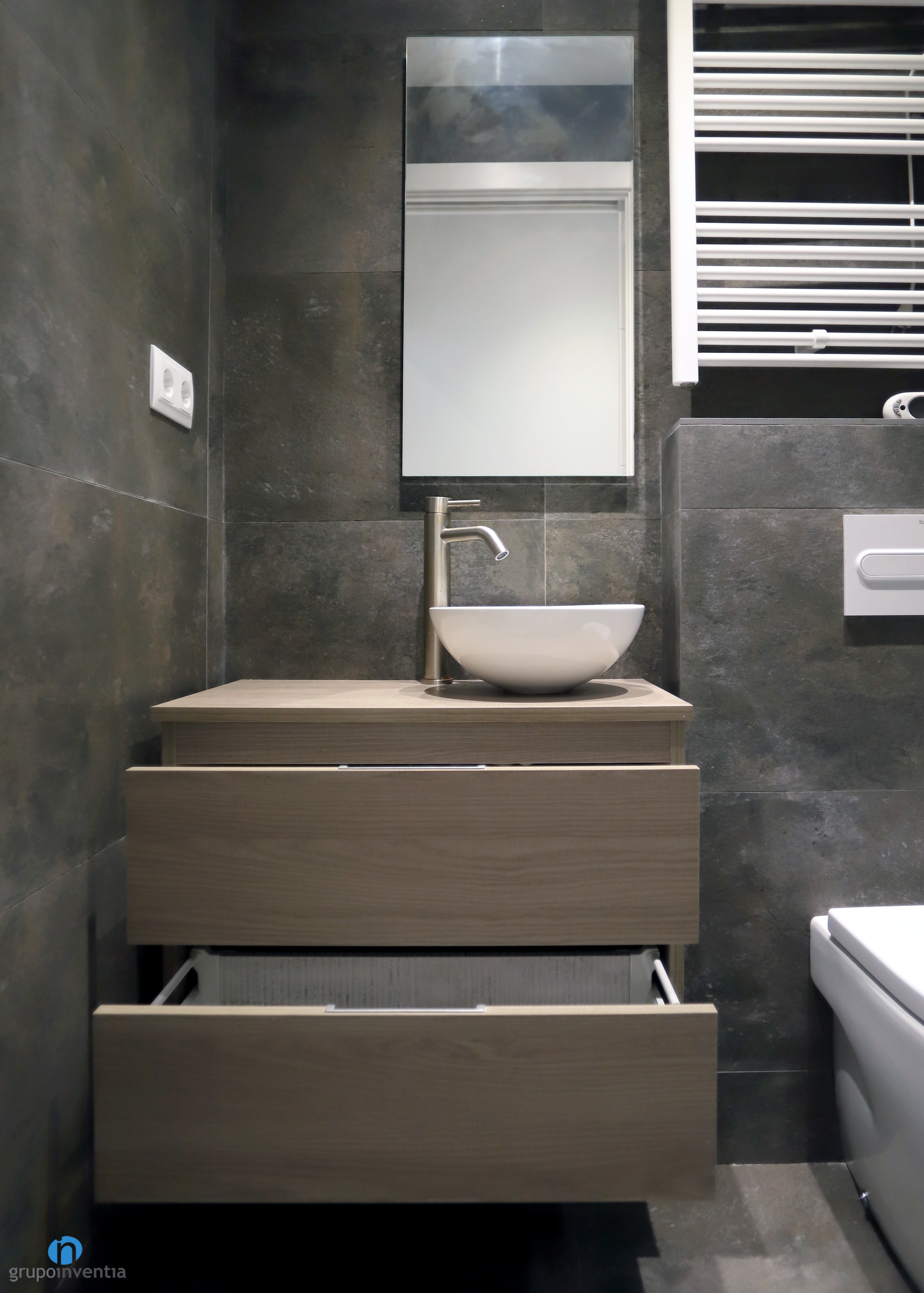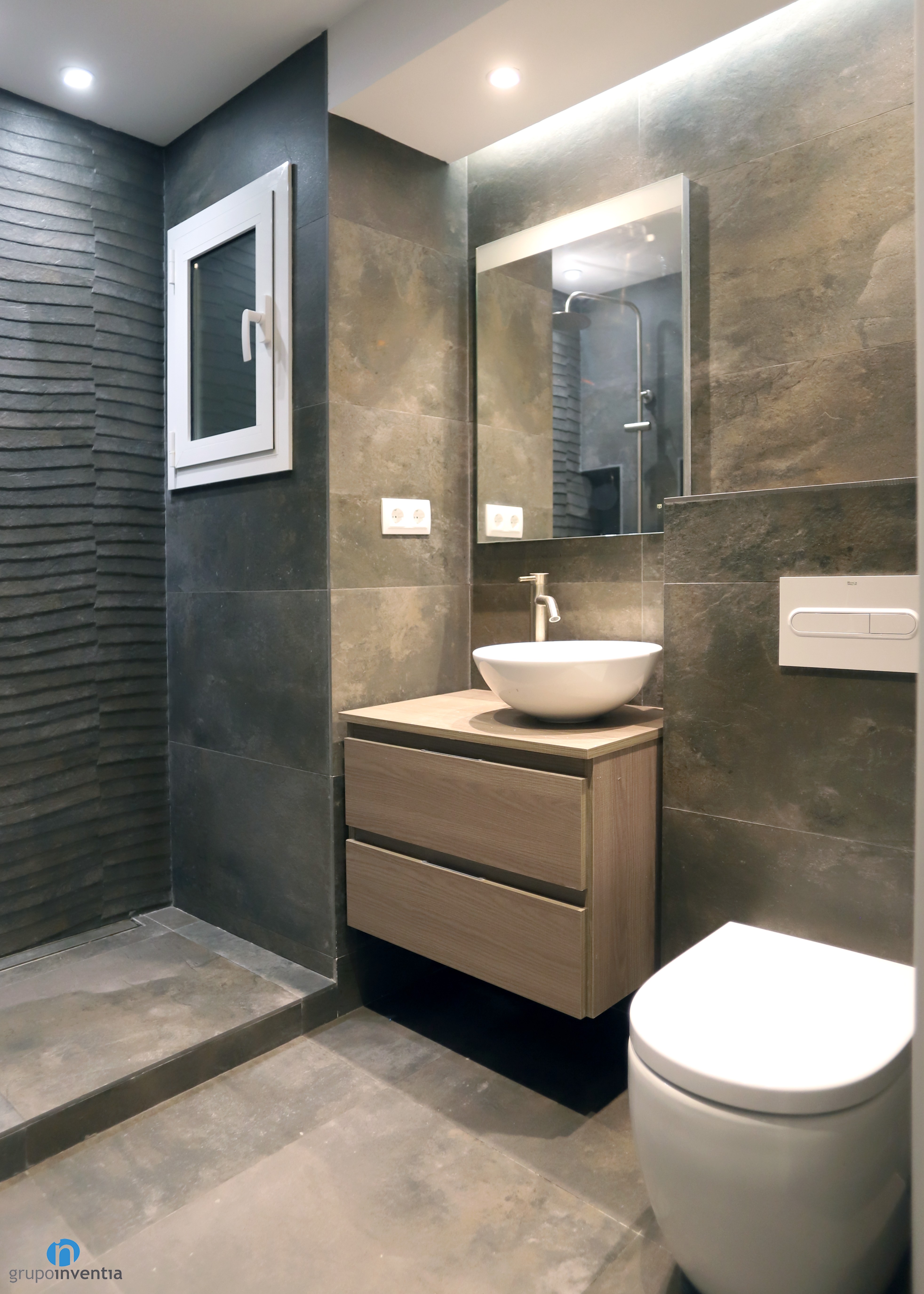 For the new image of the bathroom the walls completely tiled with tiles that imitate stone finishes, of a gray color like the pavement. Thus, in the room a warm and cozy atmosphere was achieved.