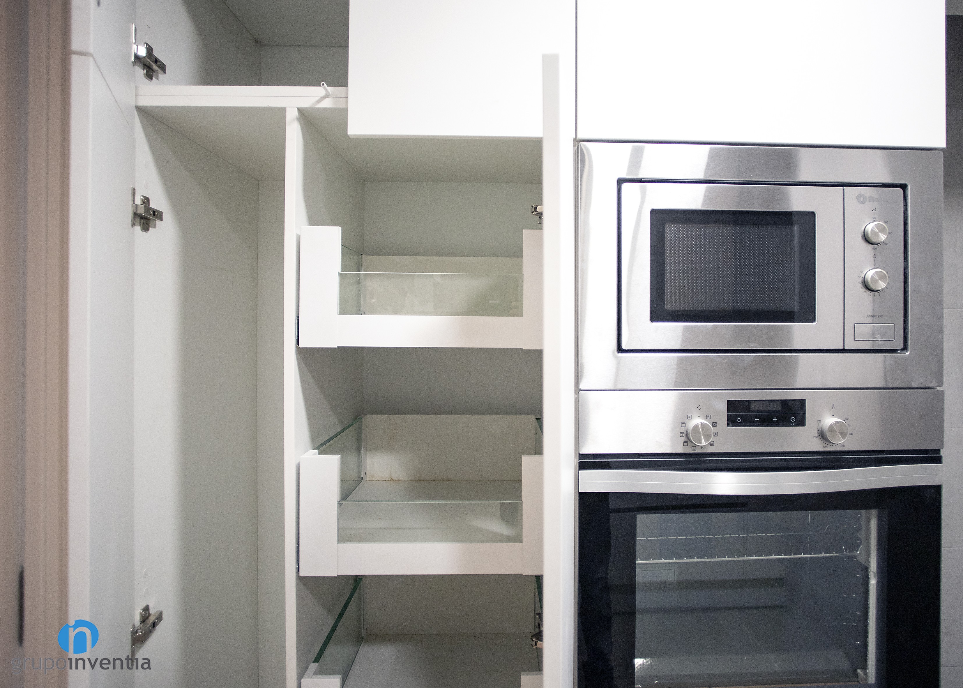 The kitchen is located in an own room and is distributed in the form of L. An important detail in this work of kitchen renovation was the placement of a sliding door, since in this way it was managed to take full advantage the available space. Just on the left side of the entrance was placed a kitchen cabinet with custom holes to fit the refrigerator, oven and microwave.