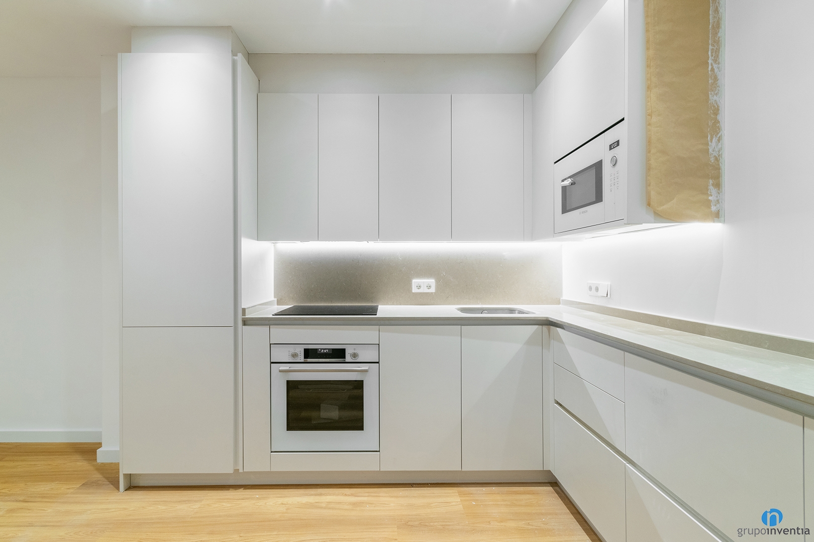 In these storage spaces we have integrated the oven and microwave. The appliances are completed with a refrigerator located on the far left of this kitchen renovation. All of this surrounded by a neutral interior design that fits very well with current trends. Thanks to this design we have enhanced the feeling of brightness and spaciousness.