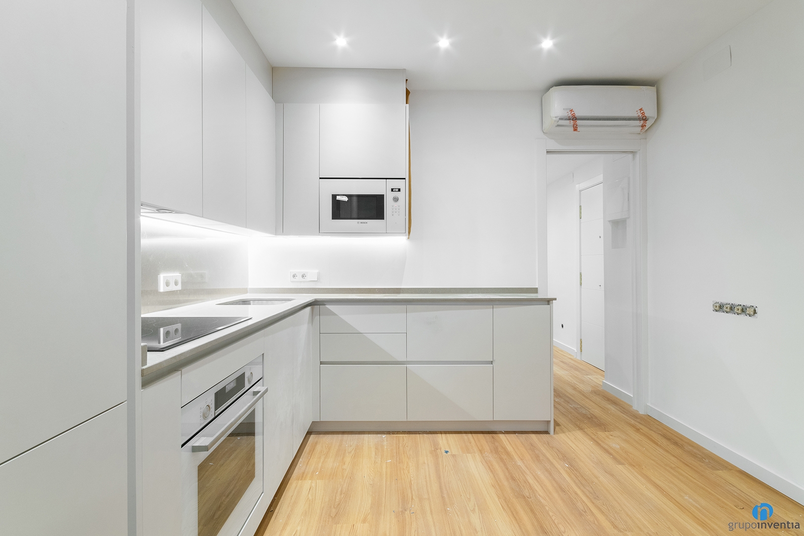 The kitchen is open and distributed in an L-shape. This creates a very fluid space that connects the kitchen with the living room. This kitchen renovation has two countertops that we have equipped with a sink and an induction hob. Both the lower and upper parts have storage capacity.