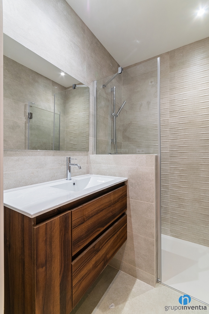 When we enter this bathroom renovation we see a three-piece sanitary equipment. We have a sink with built-in storage furniture and a classic image toilet. They are accompanied by a shower tray protected by sliding door screens. In general terms, it is a modern and functional bathroom.
