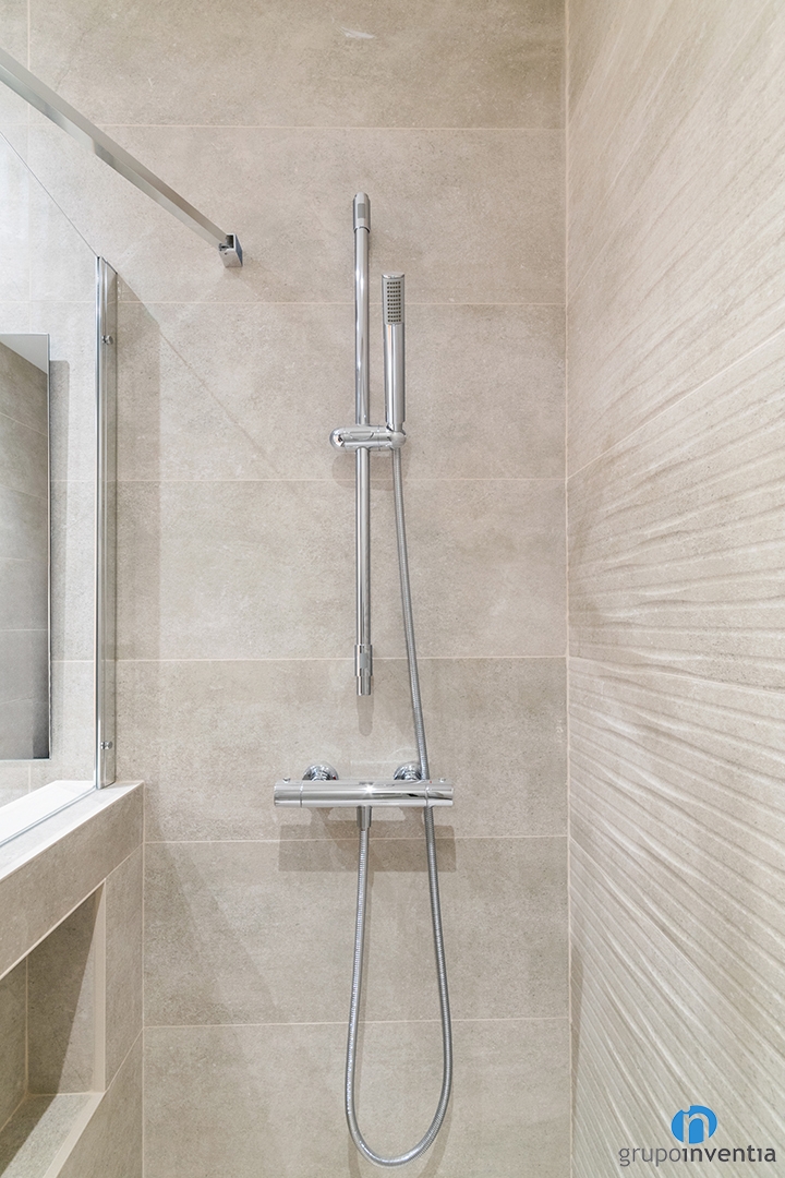 The bathroom renovation has a neutral interior design and complete sanitary equipment. For the new design we have chosen tiles in a beige tone. In this way we have created a very cozy space. The new bathroom floor has a similar tone, creating a homogeneous image. At the same time, it has a touch of warmth with the wooden furniture of the sink.