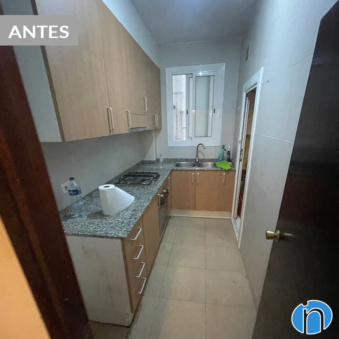 One of the big changes in this renovation in Barcelona is the kitchen. It has gone from being in an independent room to being an open kitchen connected to the living room. Now the kitchen is located between the old living room and bathroom. In this way, the kitchen gains greater prominence on this floor.