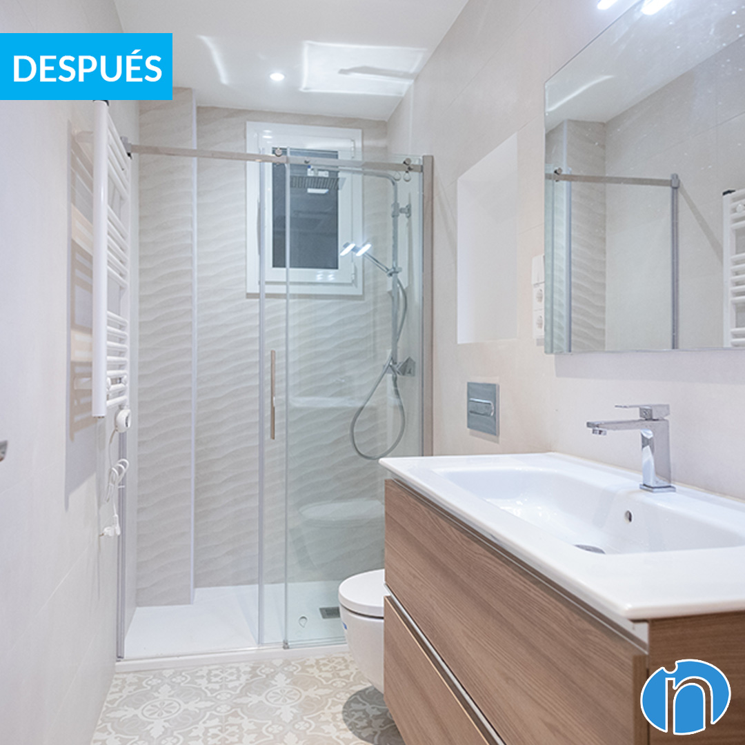 This is a very practical change, since we had the necessary pipes and water outlets. We have modernized the image of the bathroom by applying the same contemporary pattern as in the whole house. Our professionals have been responsible for tiling the walls with beige tiles and installing a new hydraulic-style ceramic floor.