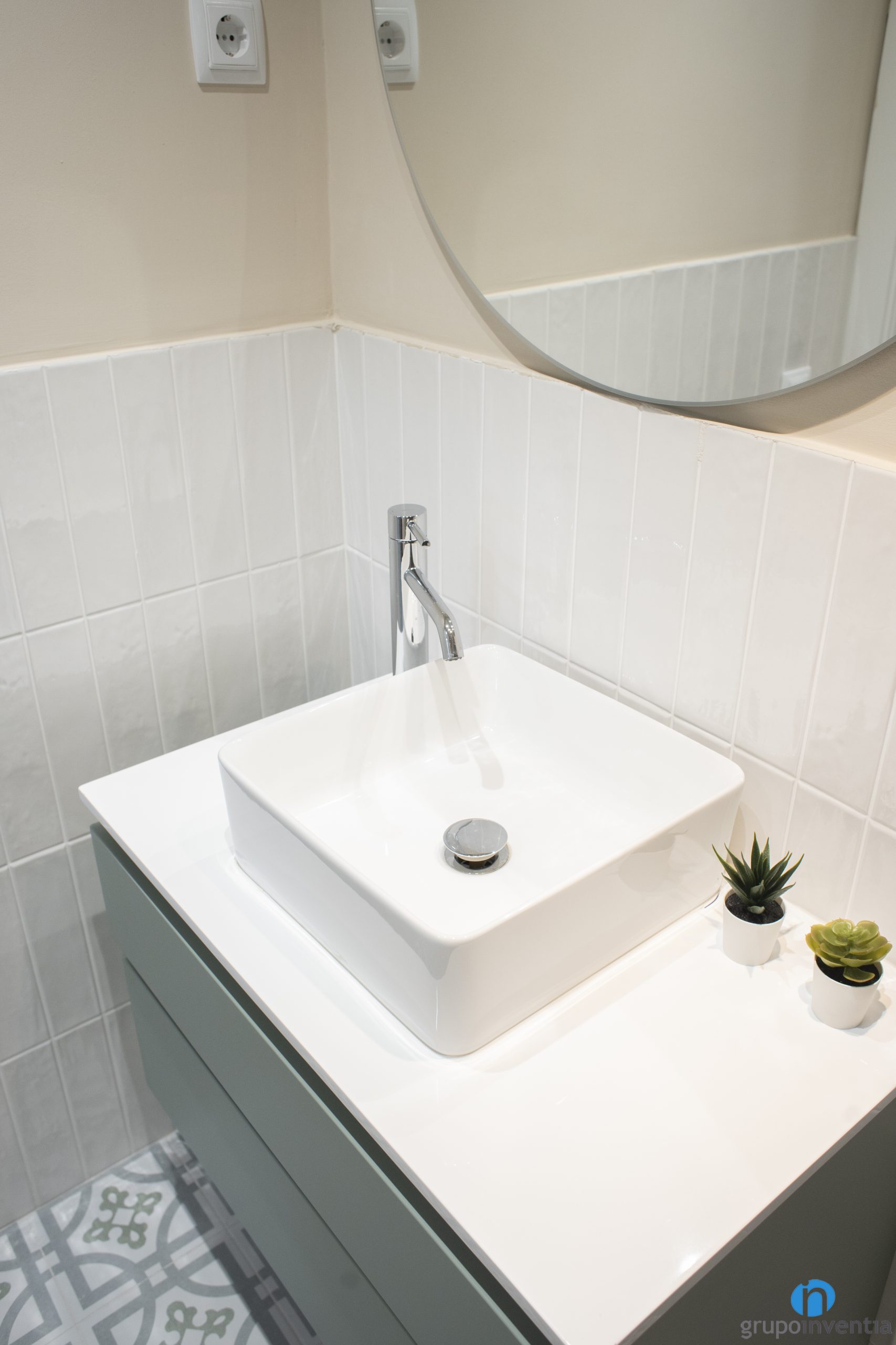 The water area is equipped with a rectangular shower tray. Super practical and protected by sliding door screens. For the new image, we have kept the identity of the rest of the house. The walls are tiled mid-height with white tiles and we have painted the rest beige. For the pavement we used the same hydraulic style as in the other areas of the floor.