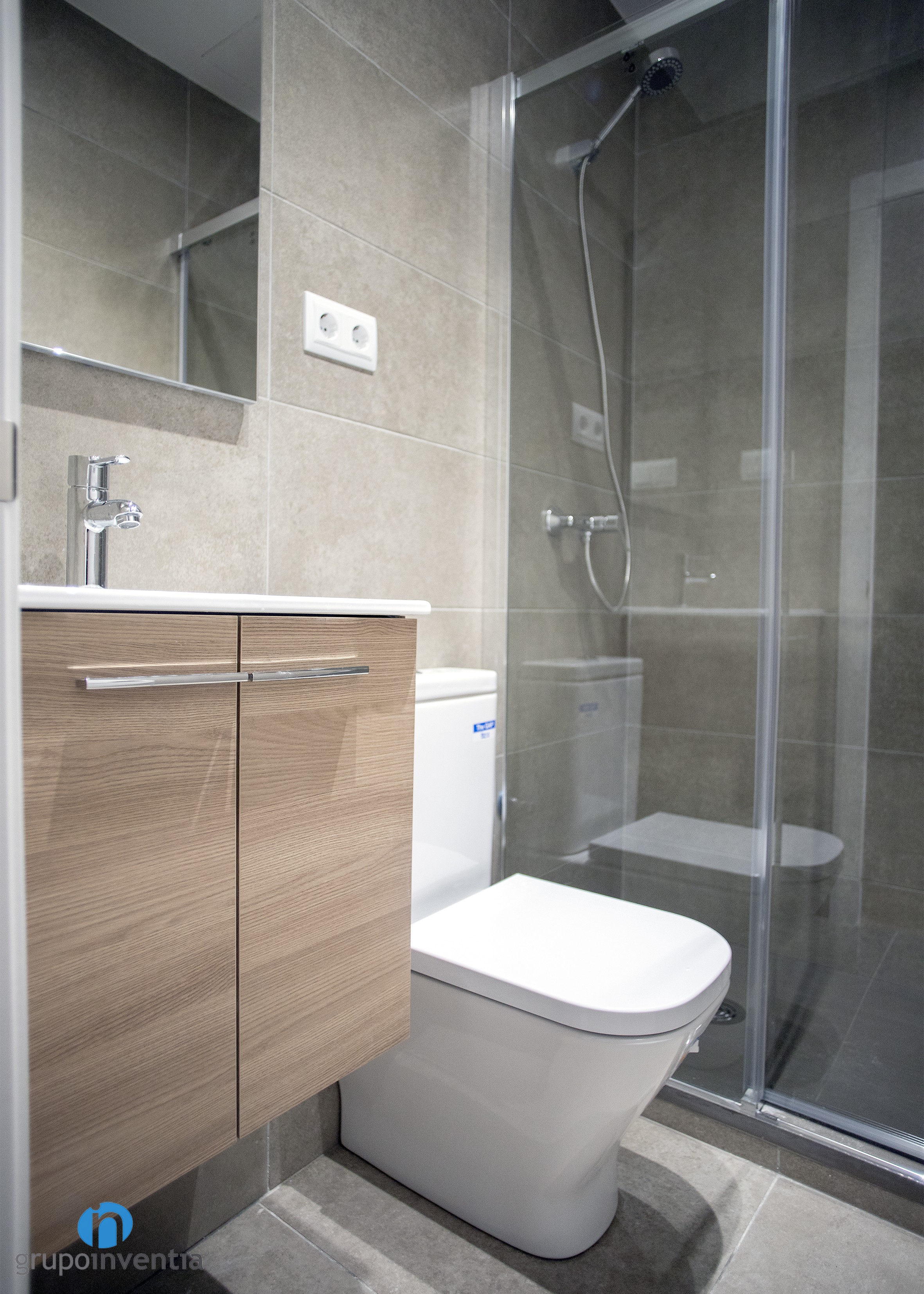 In the bathroom, a modern image was sought to print with which a bright and spacious space was reached. To do this, the walls were fully tiled with beige tiles and combined with a gray floor. This design, so neutral, allowed the introduction of other finishes, such as wooden furniture that presents the washbasin.