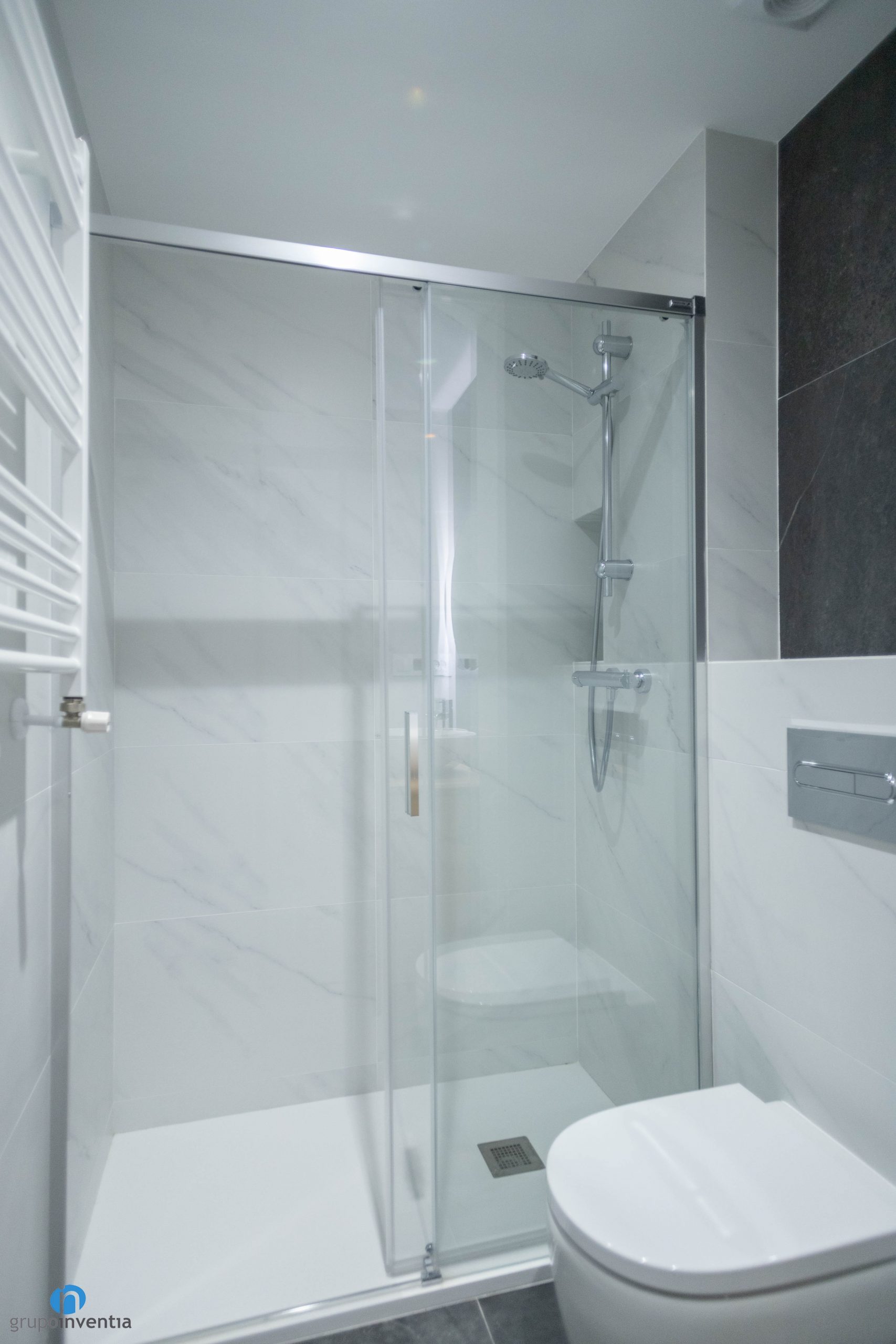 After the complete renovation, the bathroom has a modern and functional three-piece sanitary equipment. To the right of the entrance is a floating bathroom cabinet with a wood finish. On it rests a round design washbasin with a silver faucet. It is followed by a toilet with the cistern hidden in the wall. Definitely an element that generates more visual space in the bathroom. Finally, a shower tray has been placed which is protected by sliding door partitions.